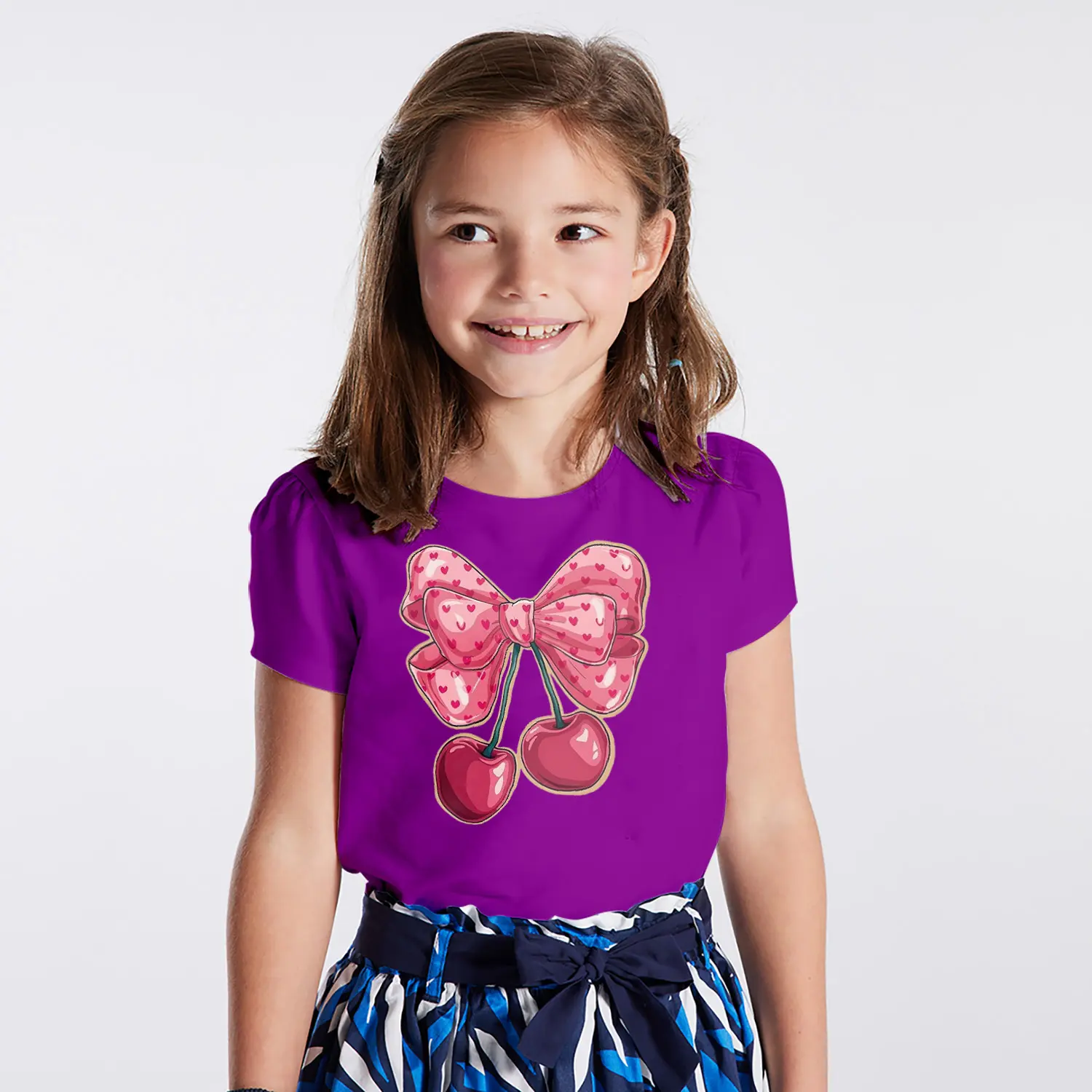 Buyuk Pembe Fiyonk Ve Kalpli Kiraz Figürlü Baskılı Kiz Çocuk Tisortu Tişörtü