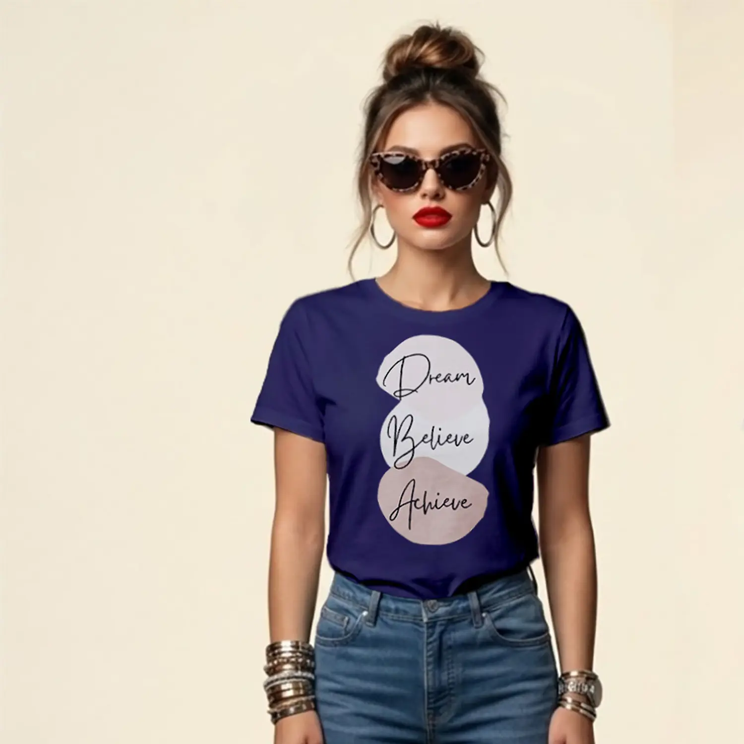 “Dream Believe Achieve Yazılı Baskılı Kadın Tişört” için yorum yapan ilk kişi siz olun