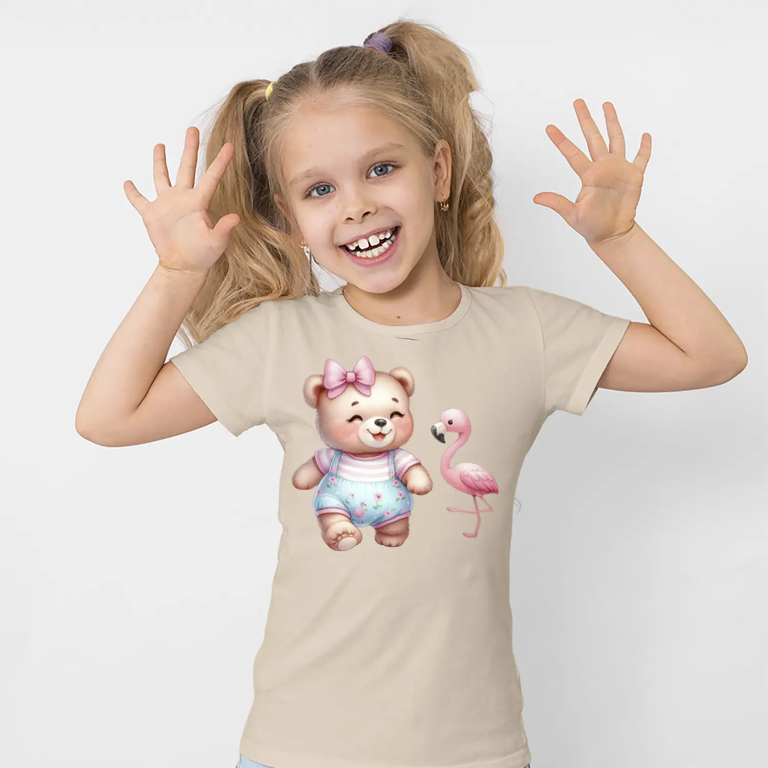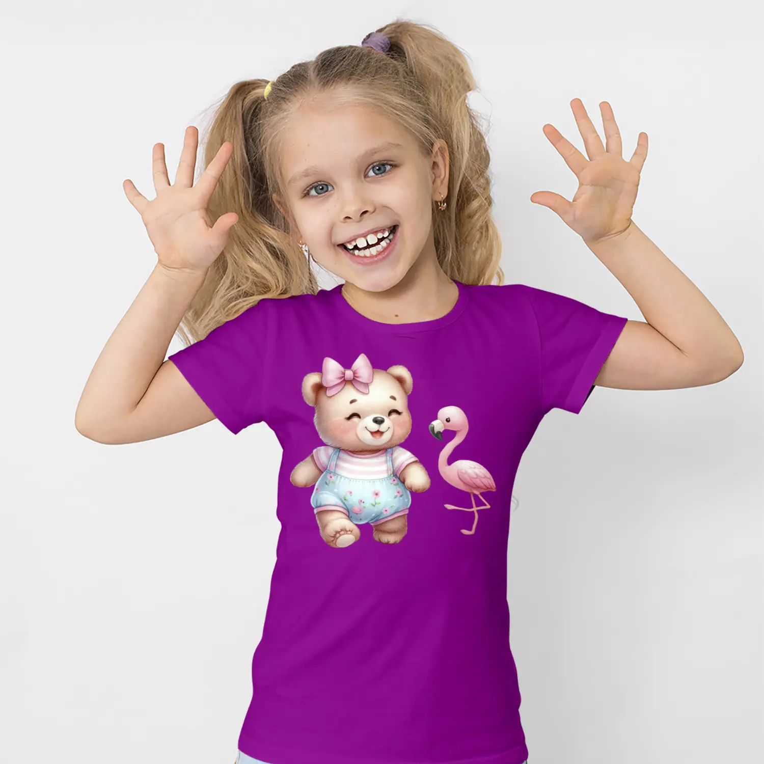 Fiyonklu Sevimli Ayicik Ve Flamingo Figürlü Baskılı Kiz Çocuk Tisortu Tişörtü