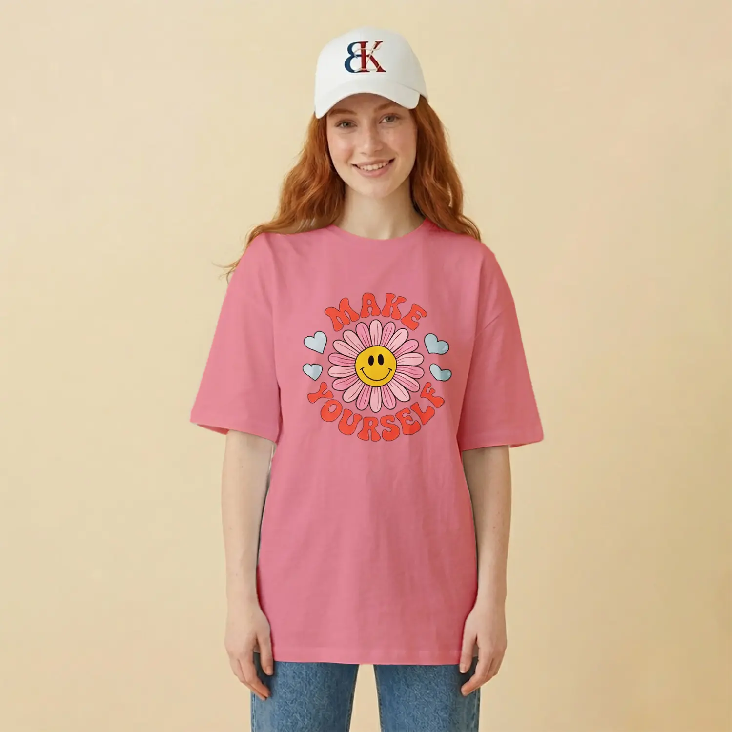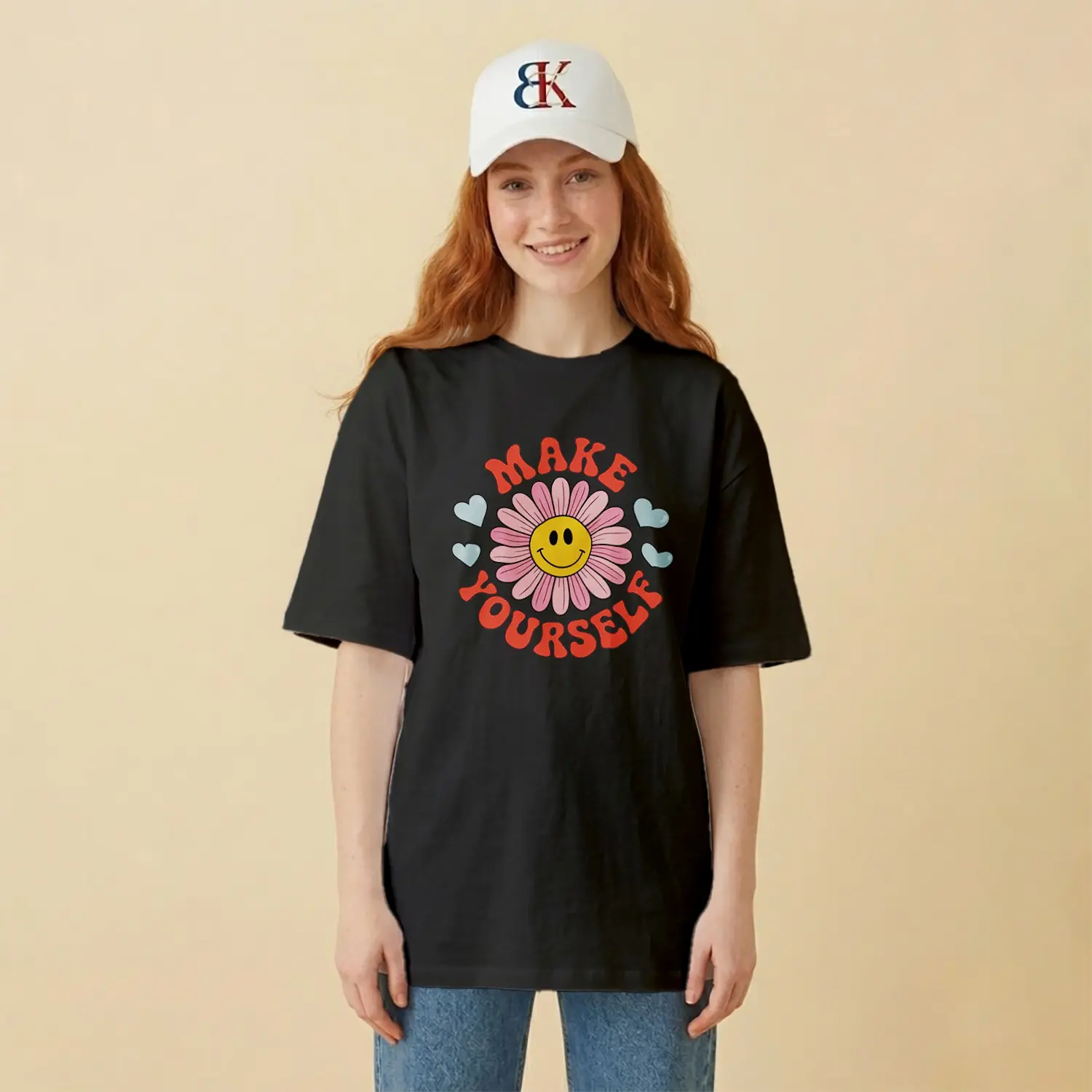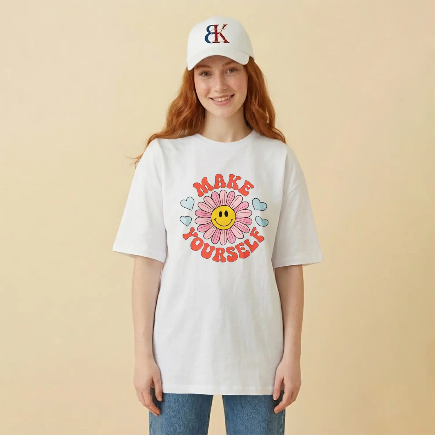 Gülümseyen Papatya ve Kalpler Baskılı Kadın Tişört