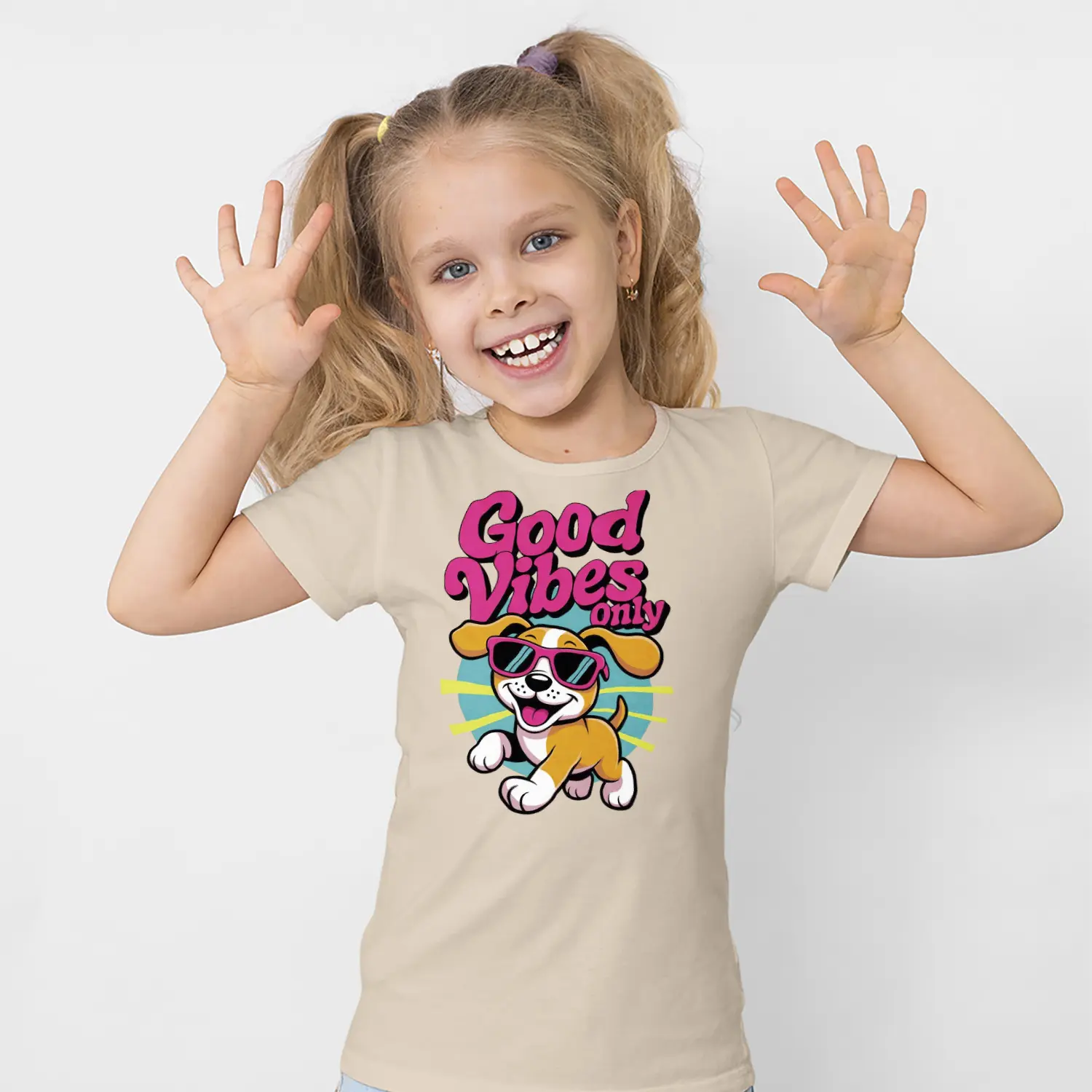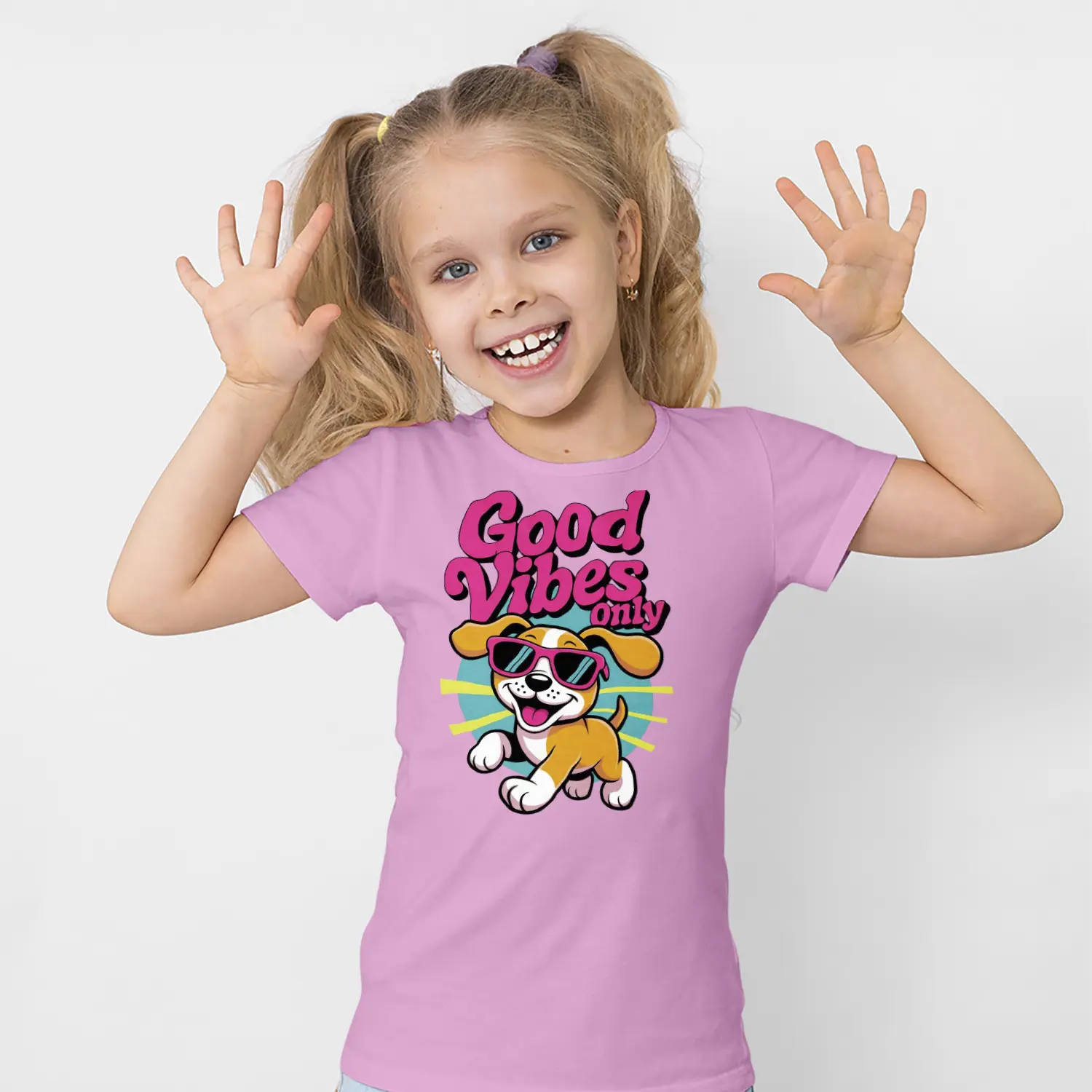 Gunes Gozluklu Yavru Kopek Good Vibes Only Yazılı Baskılı Kiz Çocuk Tisortu Tişörtü
