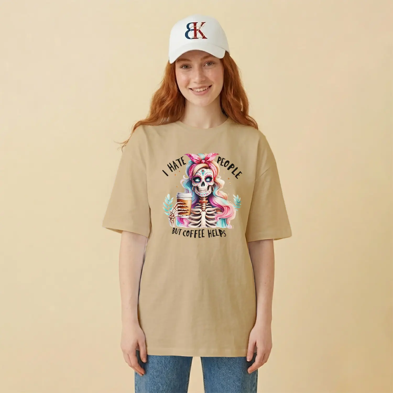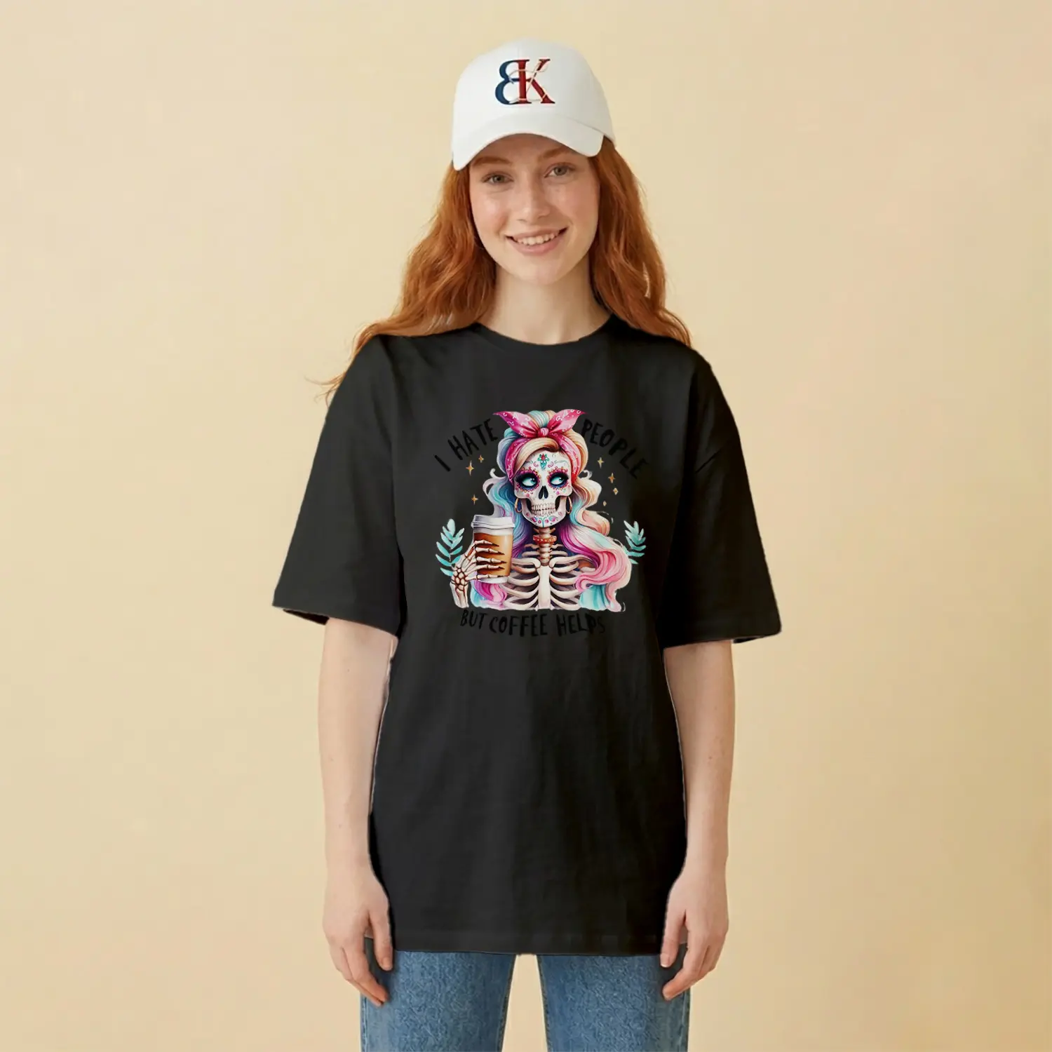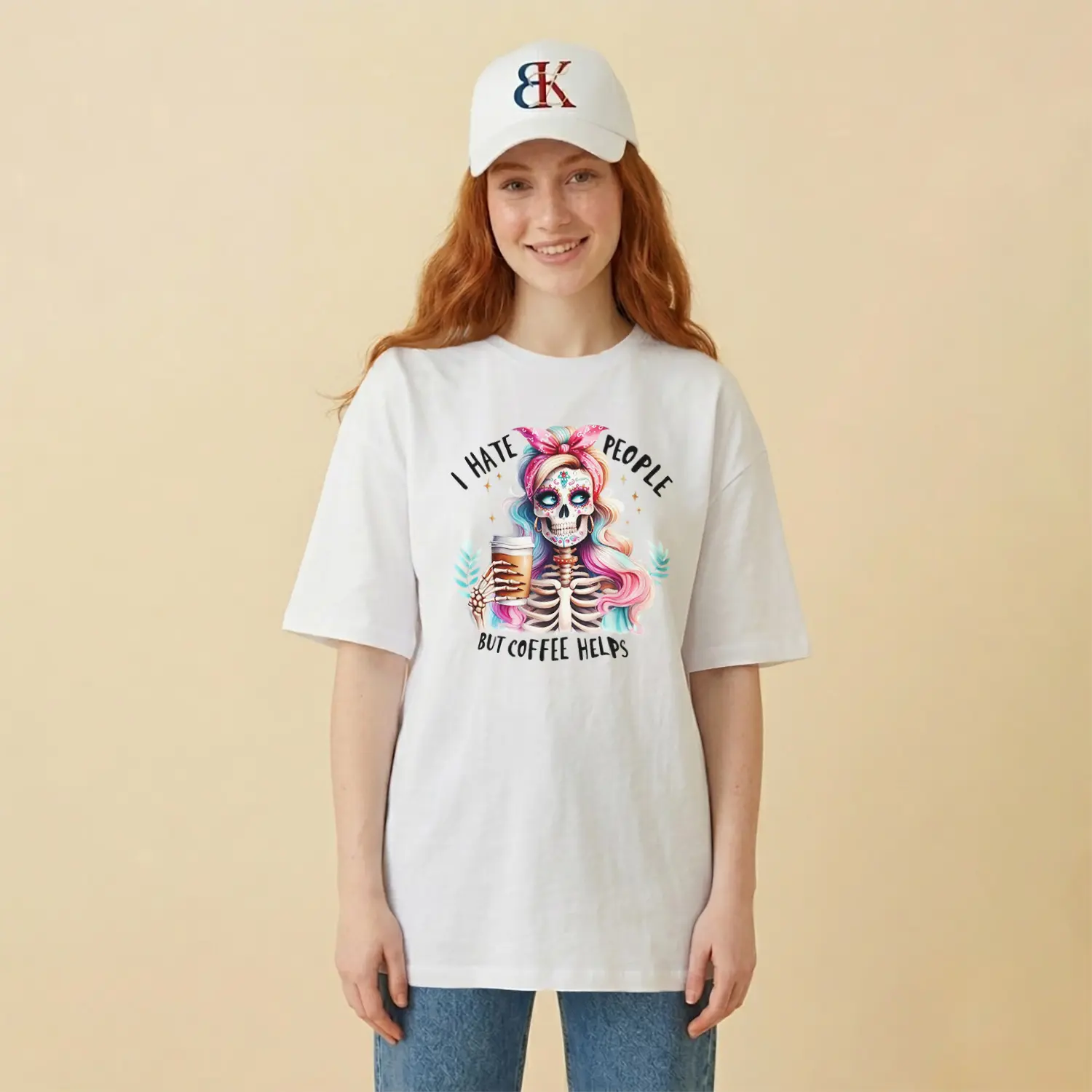 Kahve ve İskelet Temalı Baskılı Kadın Tişört
