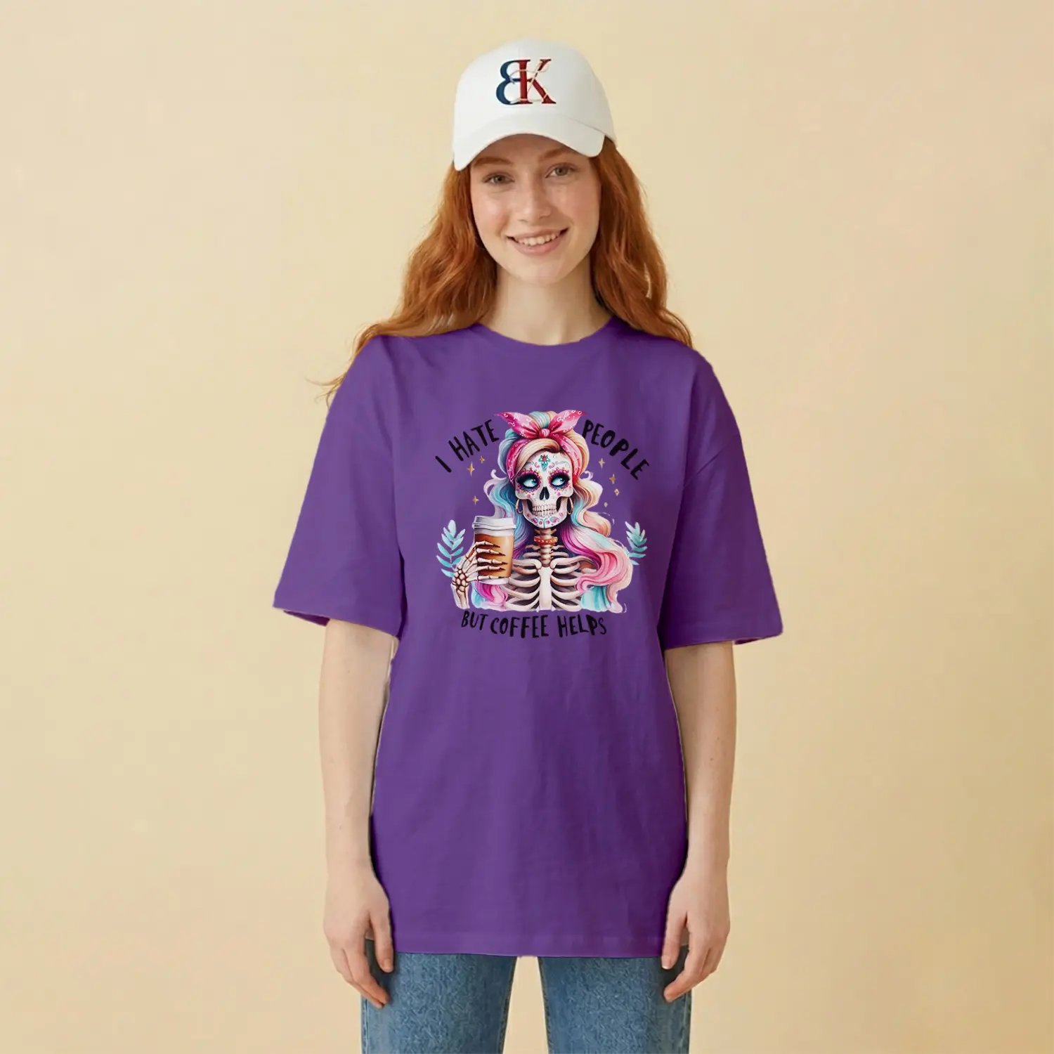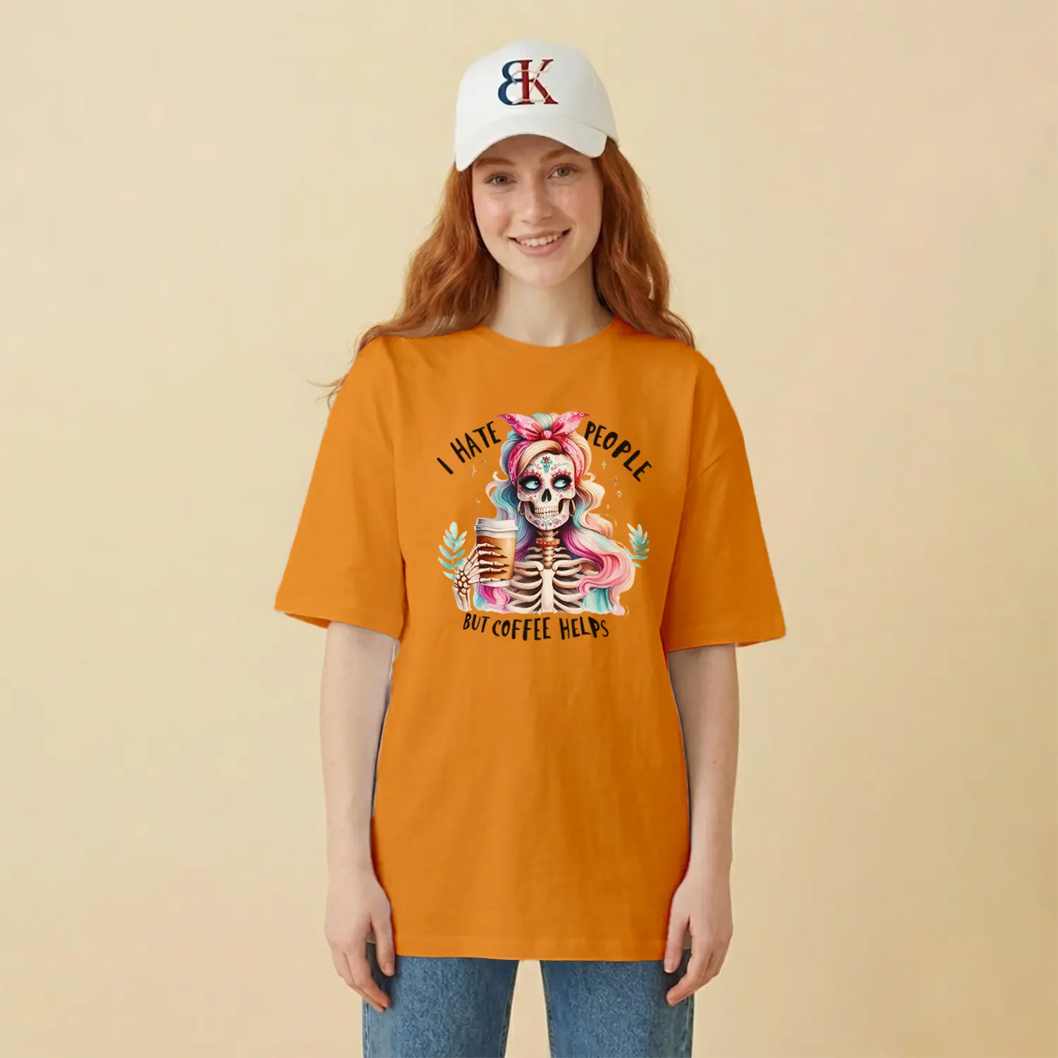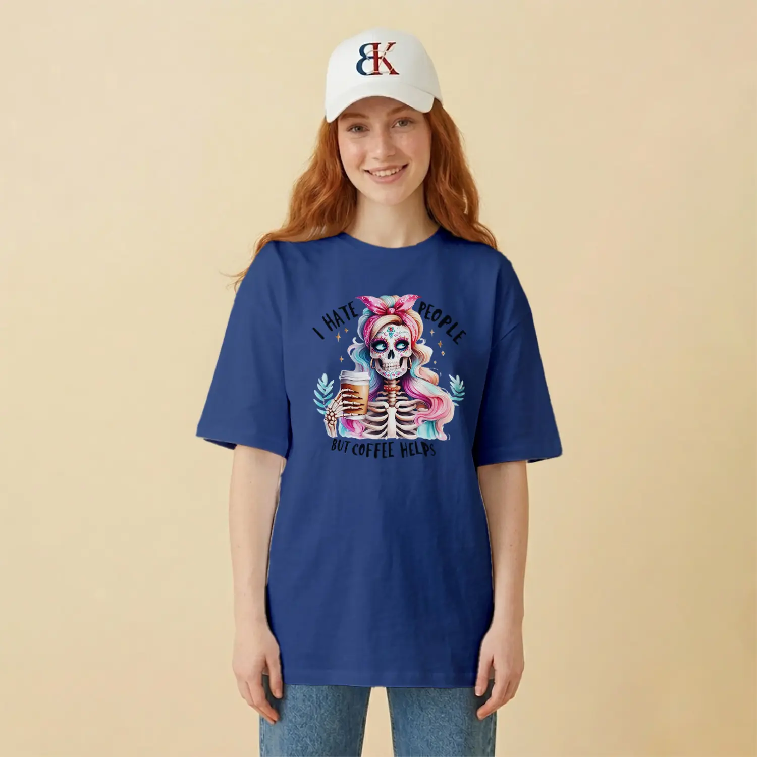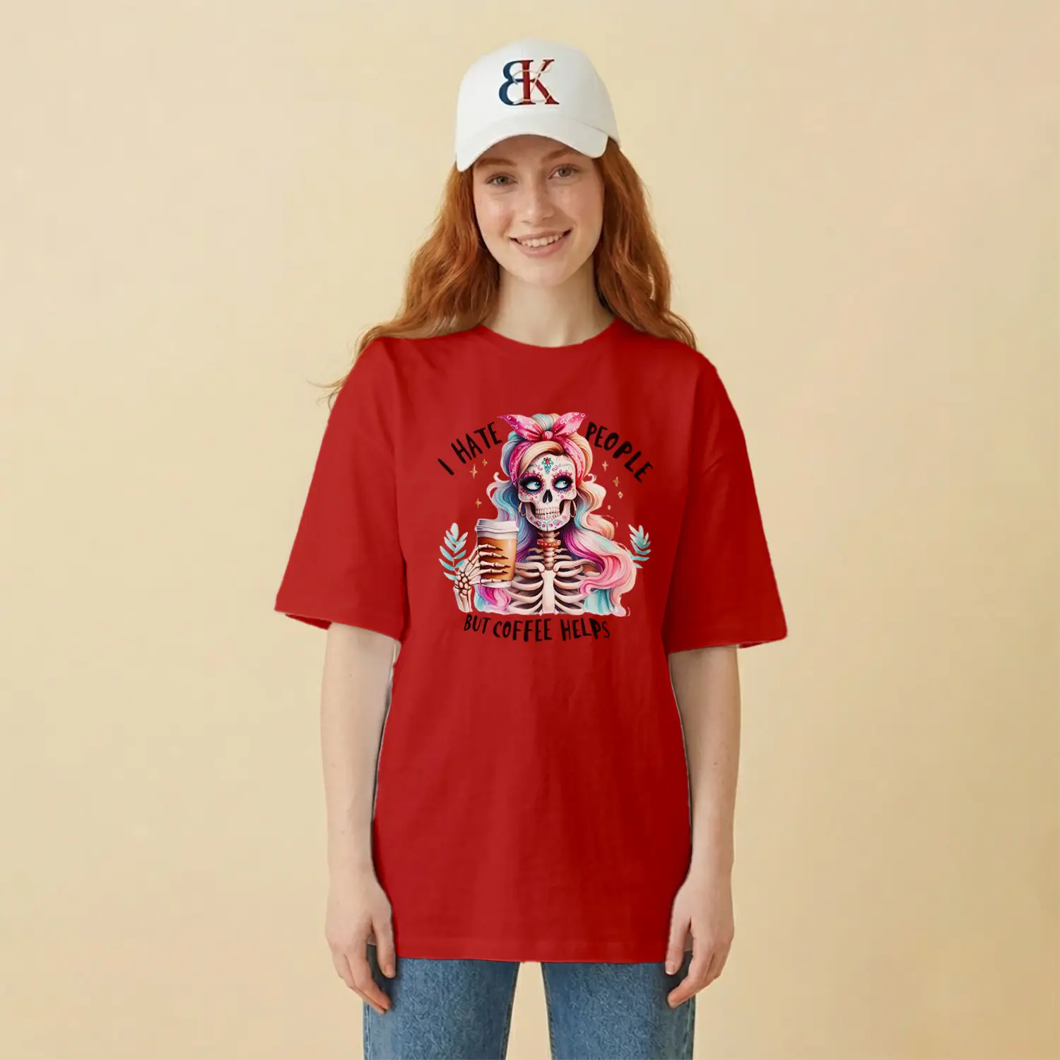 Kahve ve İskelet Temalı Baskılı Kadın Tişört