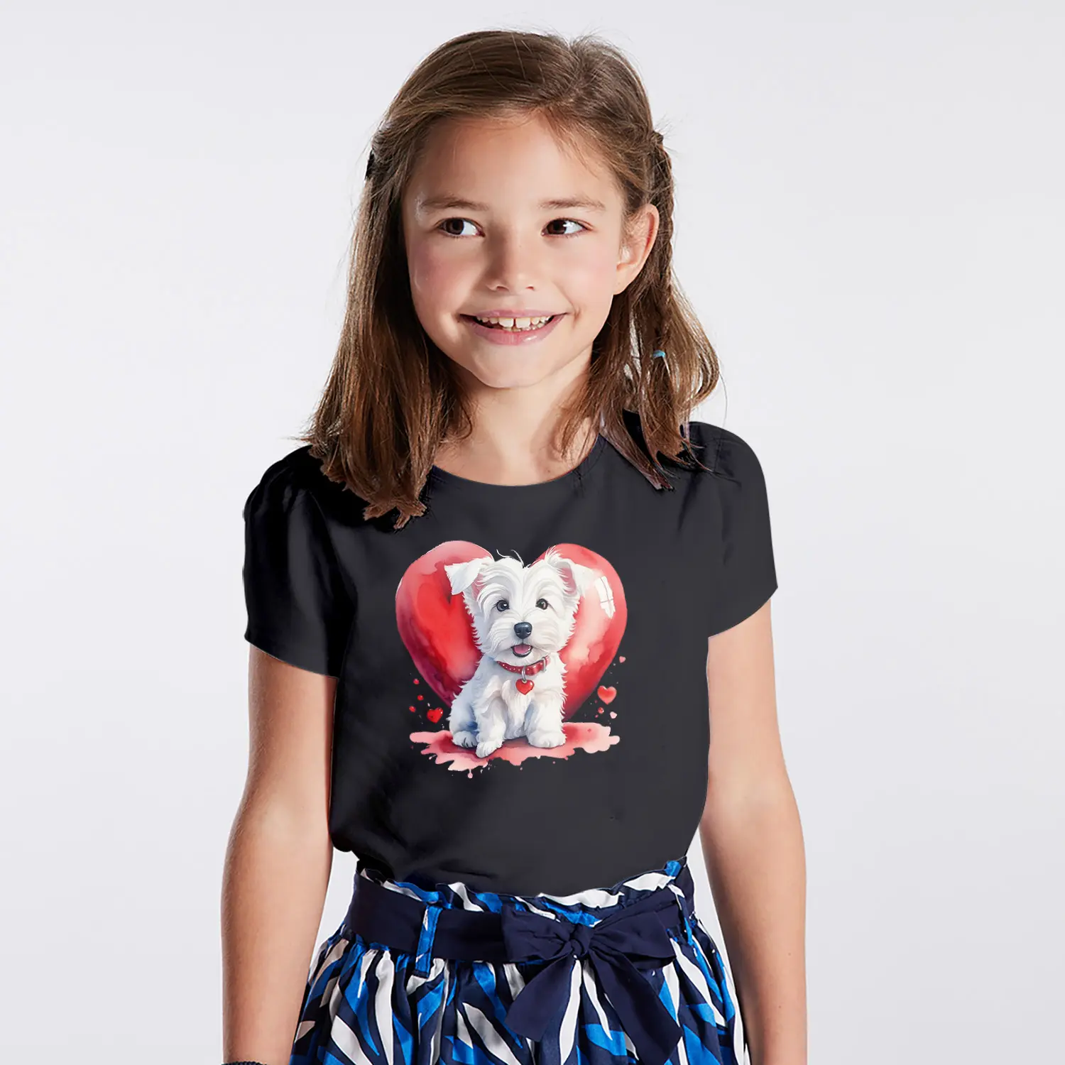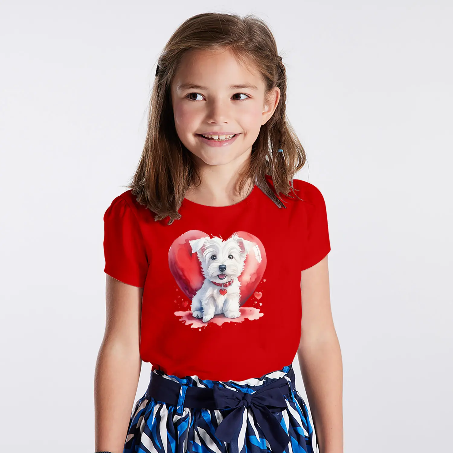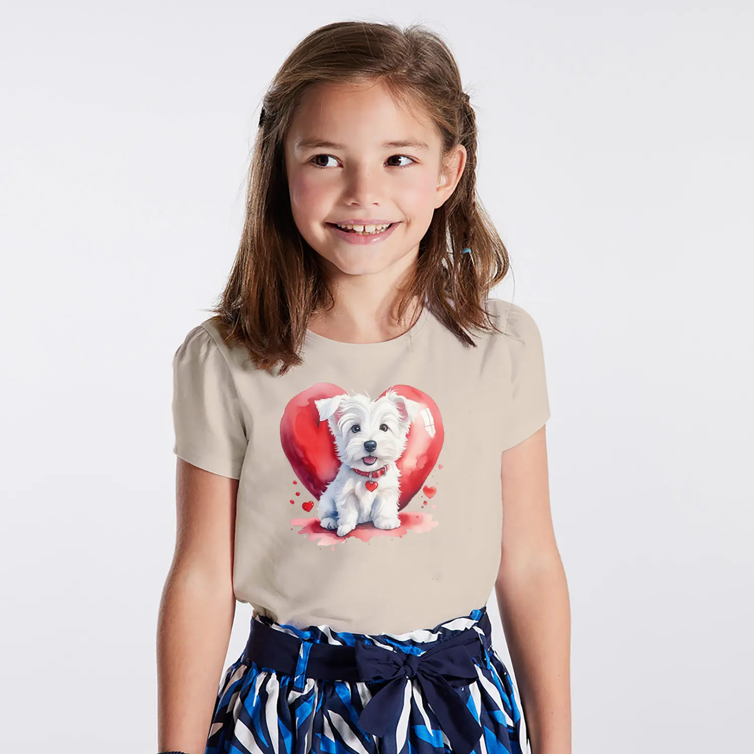 Kalpli Sevimli Beyaz Yavru Kopek Figürlü Baskılı Kiz Çocuk Tisortu Tişörtü