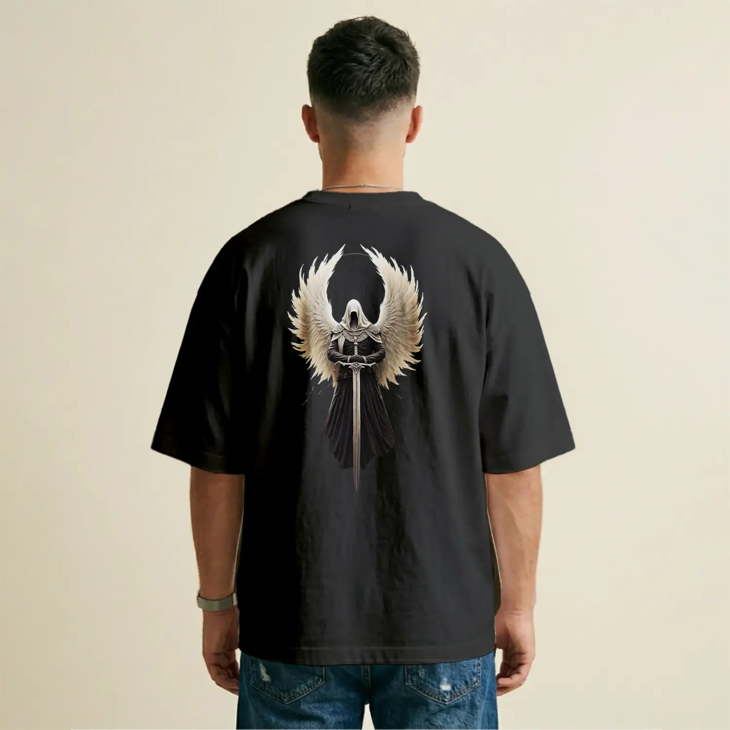 Kanatlı Kılıçlı Melek Baskılı Erkek Tişört