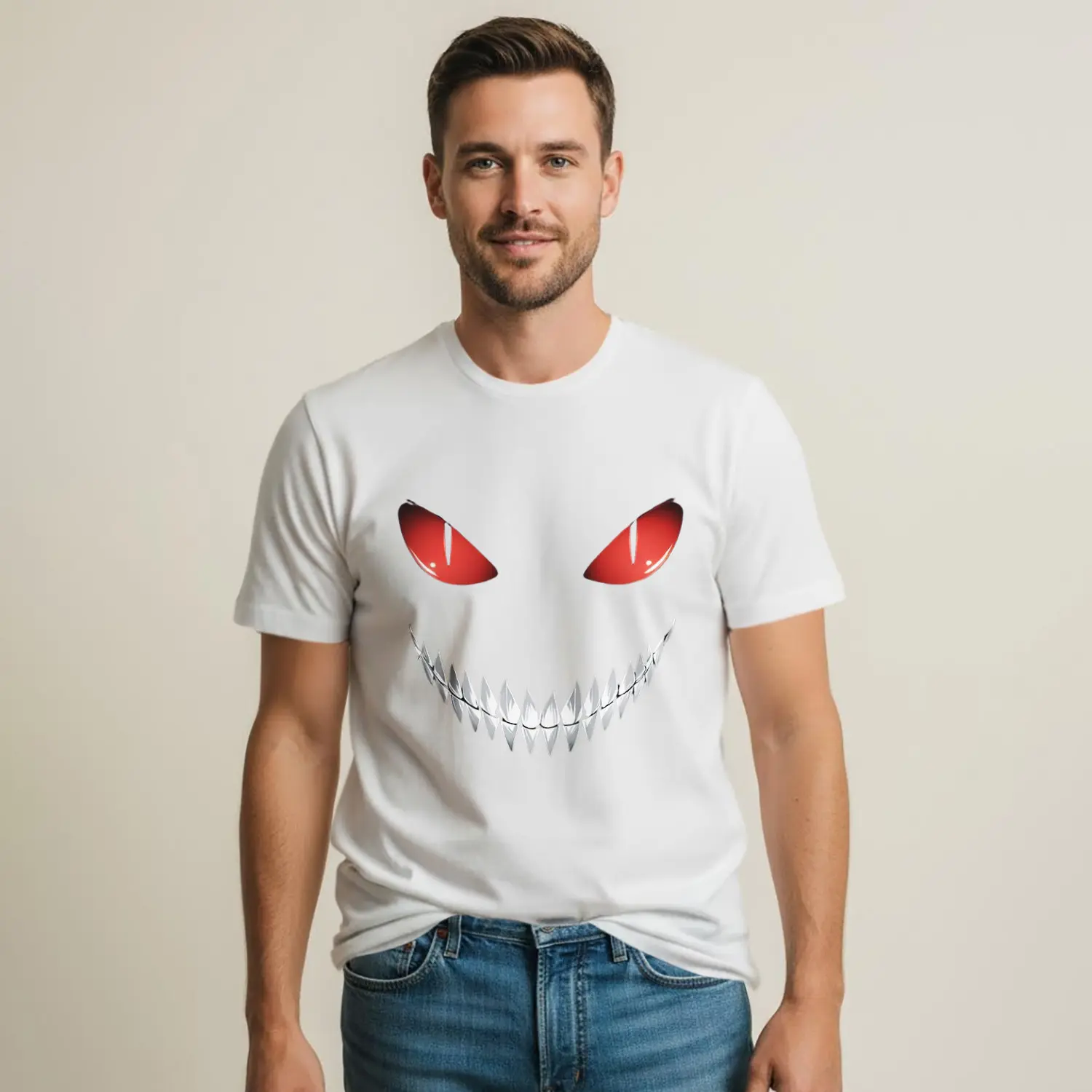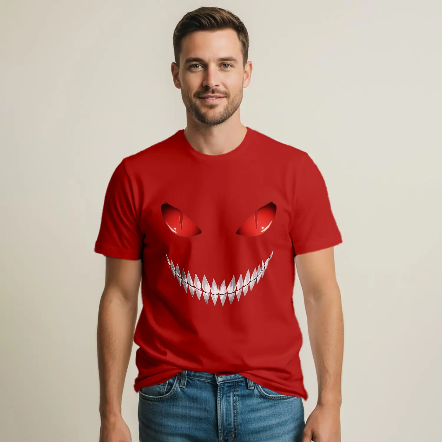 Kırmızı Göz ve Gülümseme Baskılı Erkek Tişört