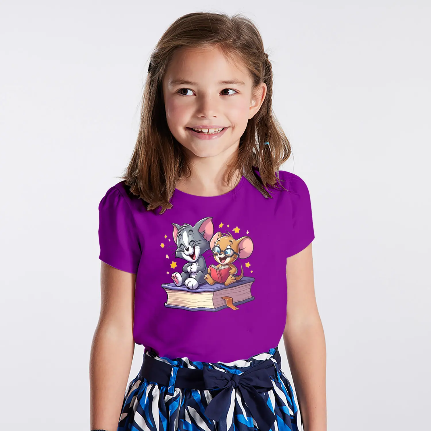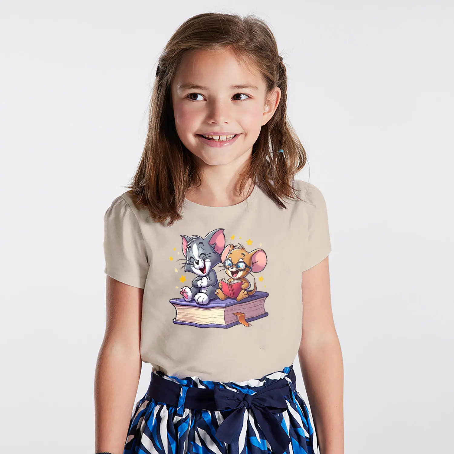 Kitap Okuyan Kedi Ve Fare Karikatur Figürlü Baskılı Kiz Çocuk Tisortu Tişörtü