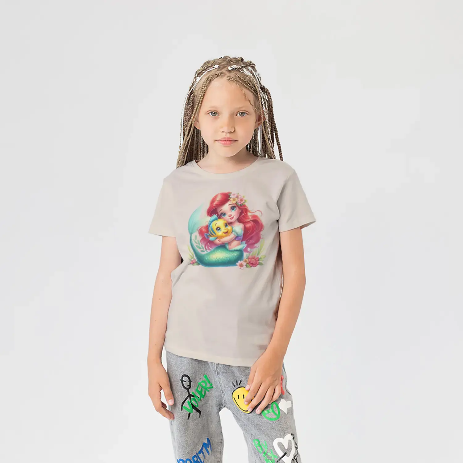Kizil Sacli Deniz Kizi Ve Sarı Balik Arkadasi Baskılı Kiz Çocuk Tisortu Tişörtü