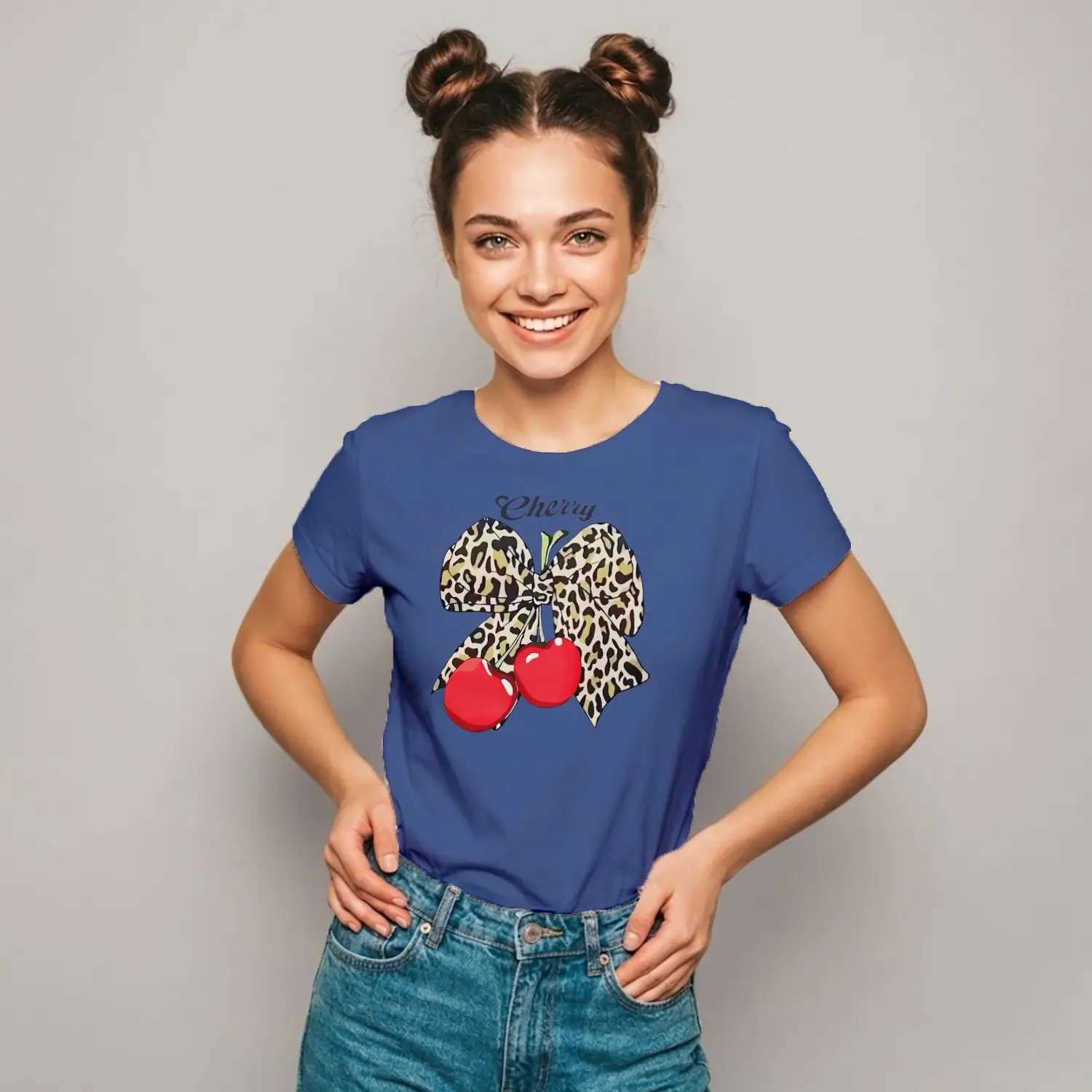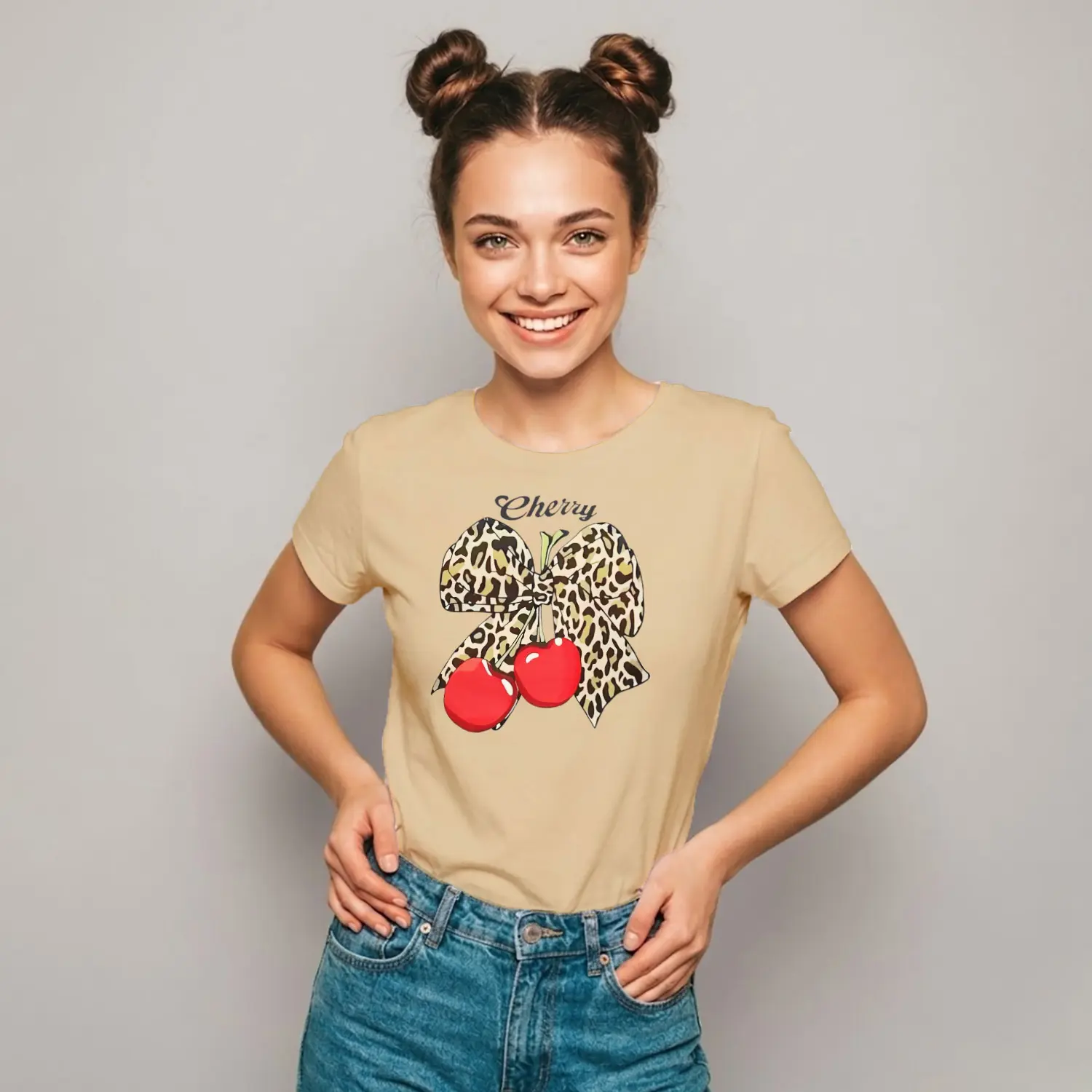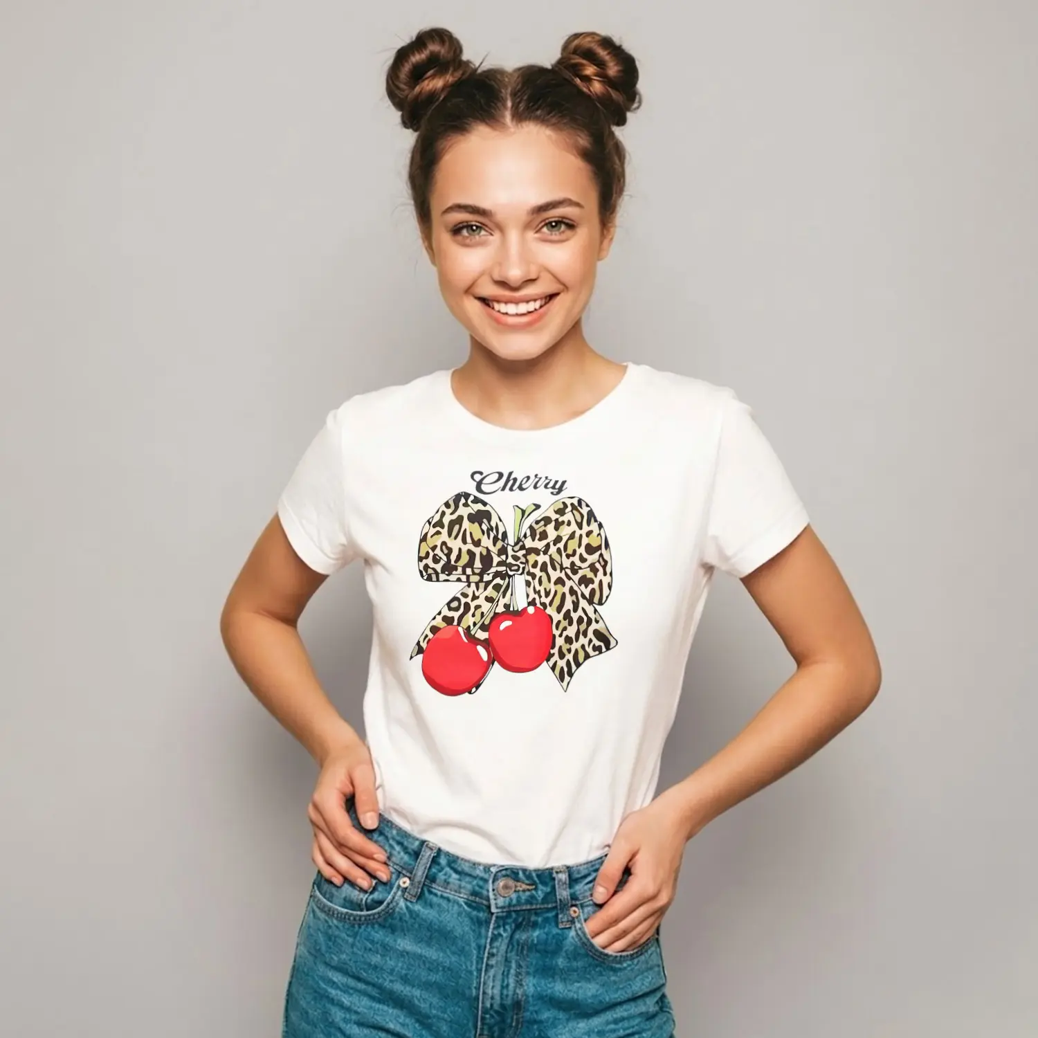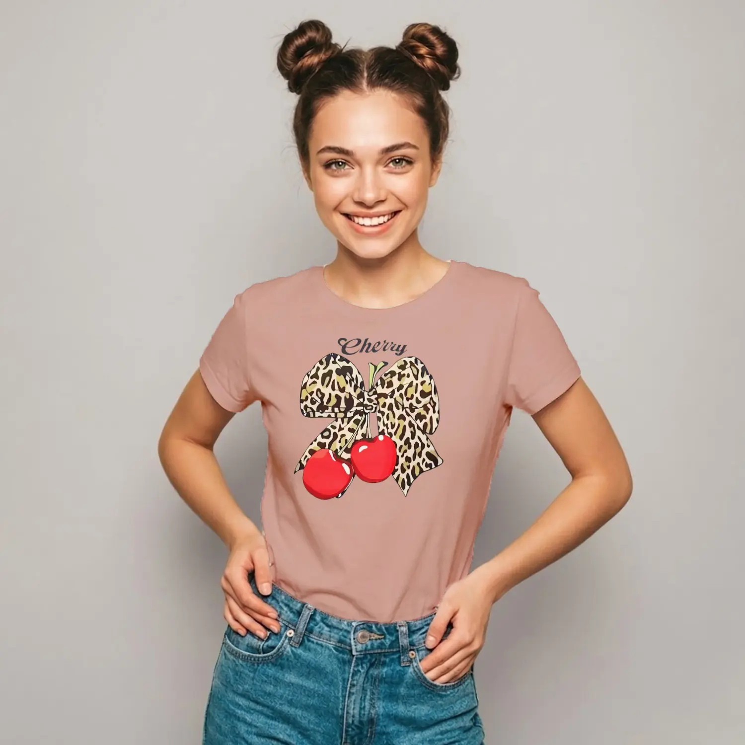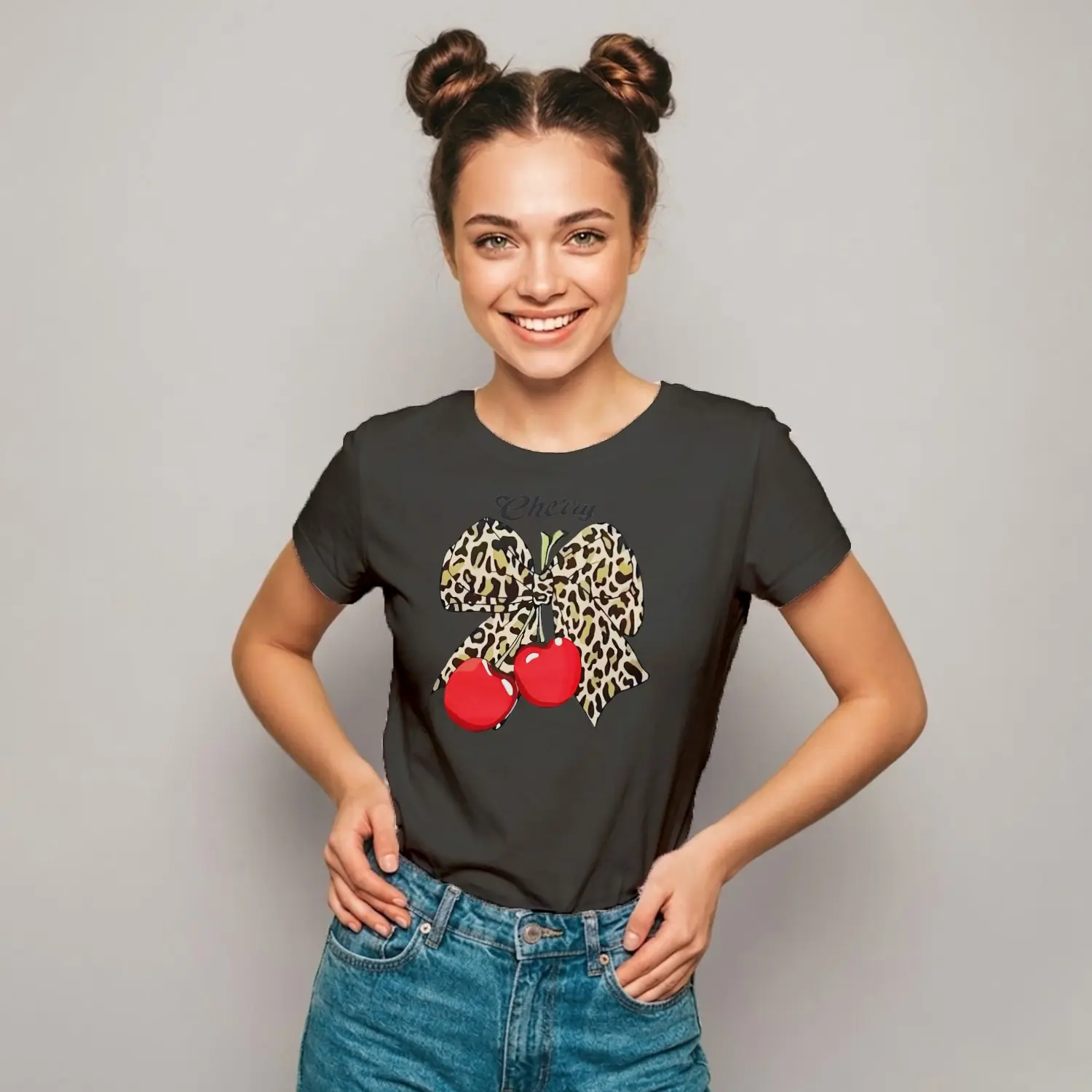 Leopar Fiyonklu Cherry Baskılı Kadın Tişörtü