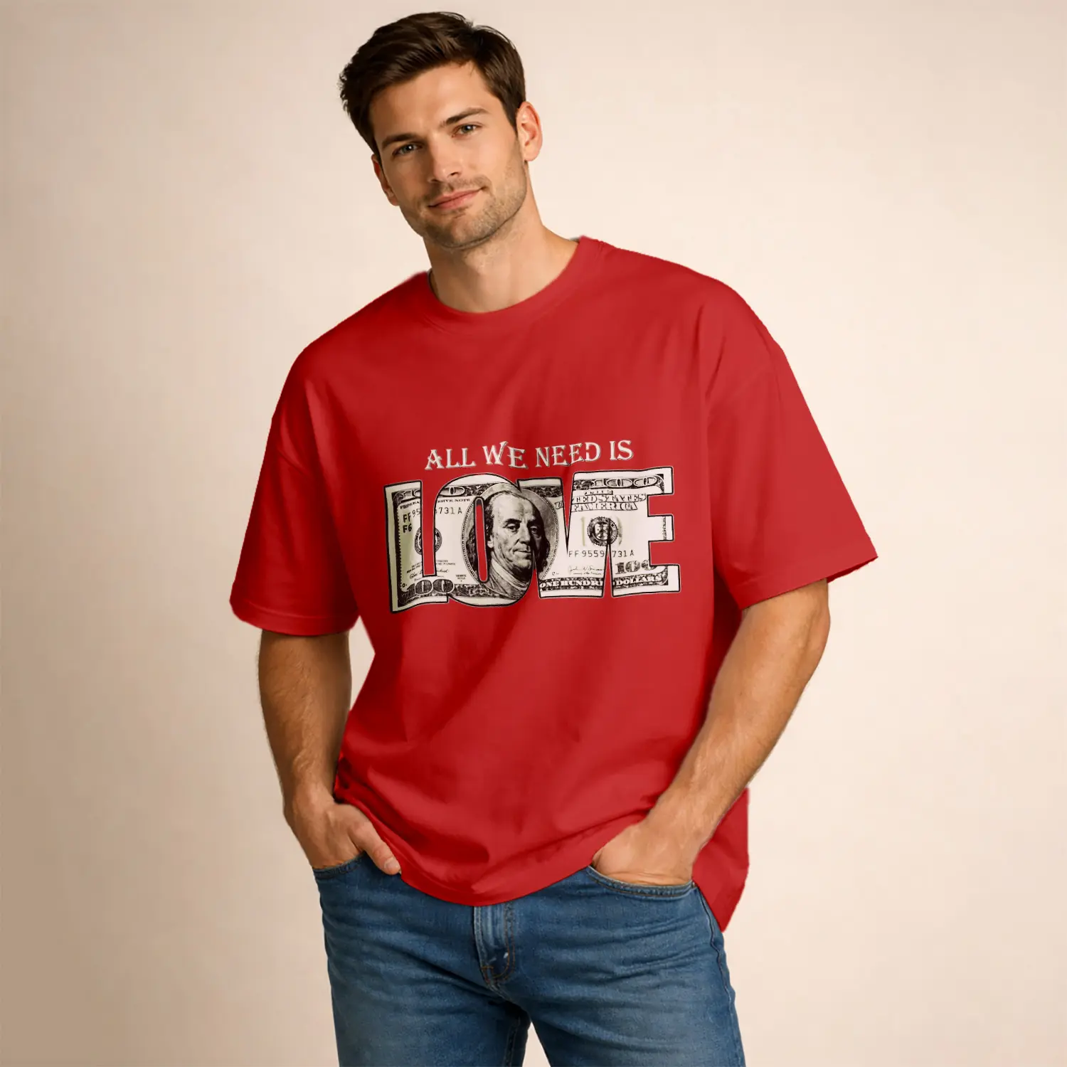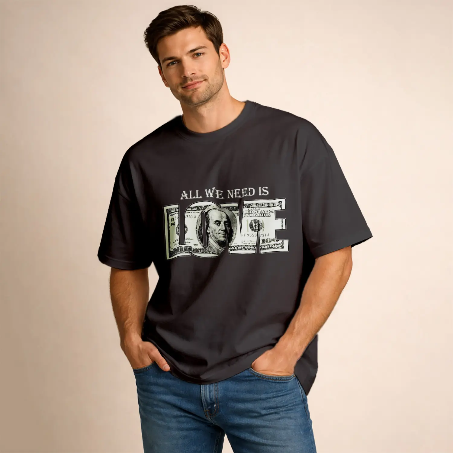 Love Yazılı Pudra Rengi Baskılı Erkek Tişört