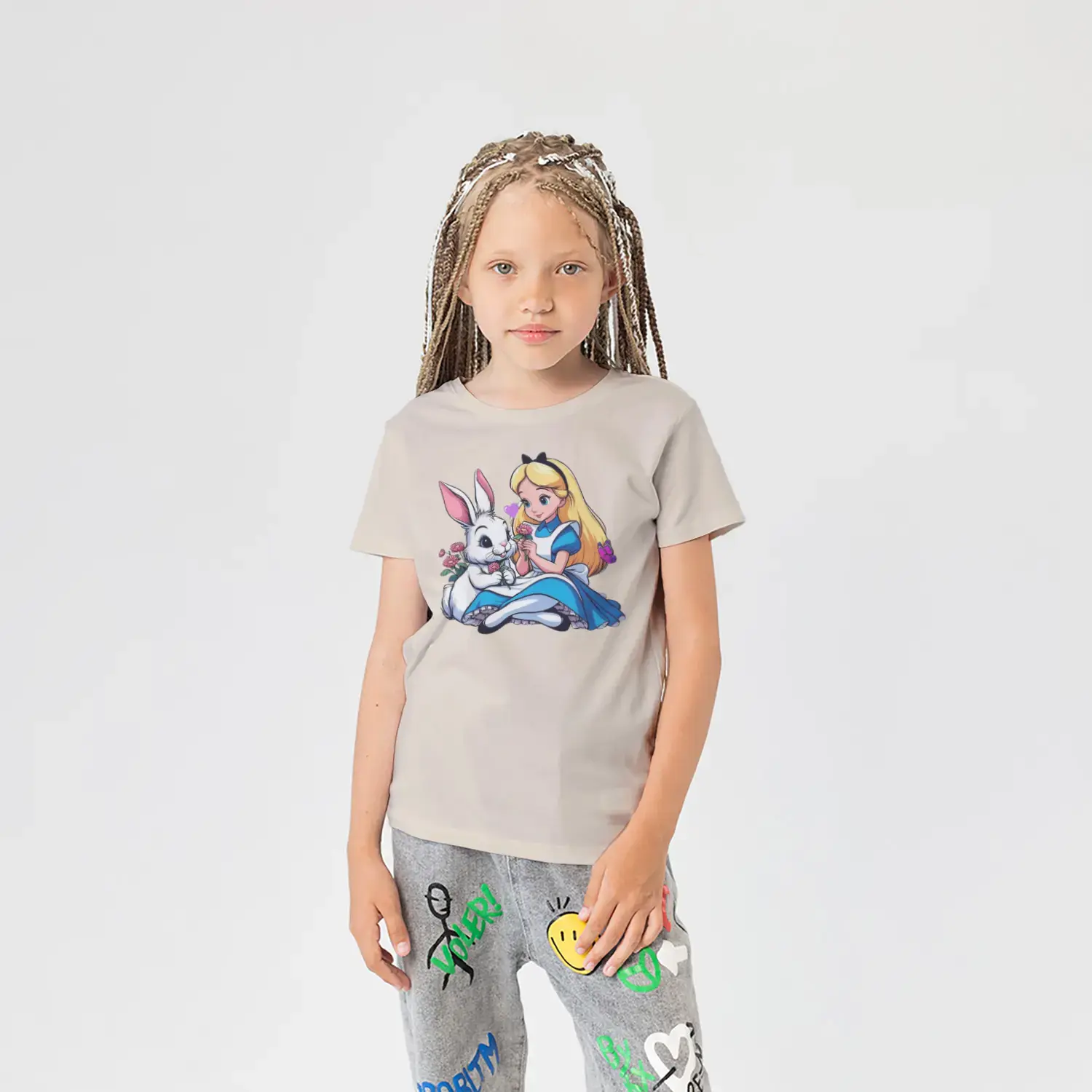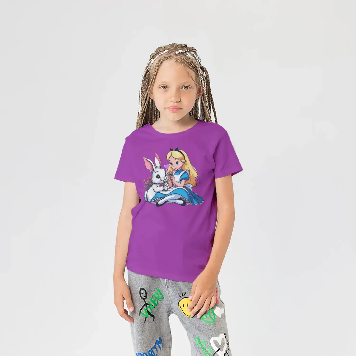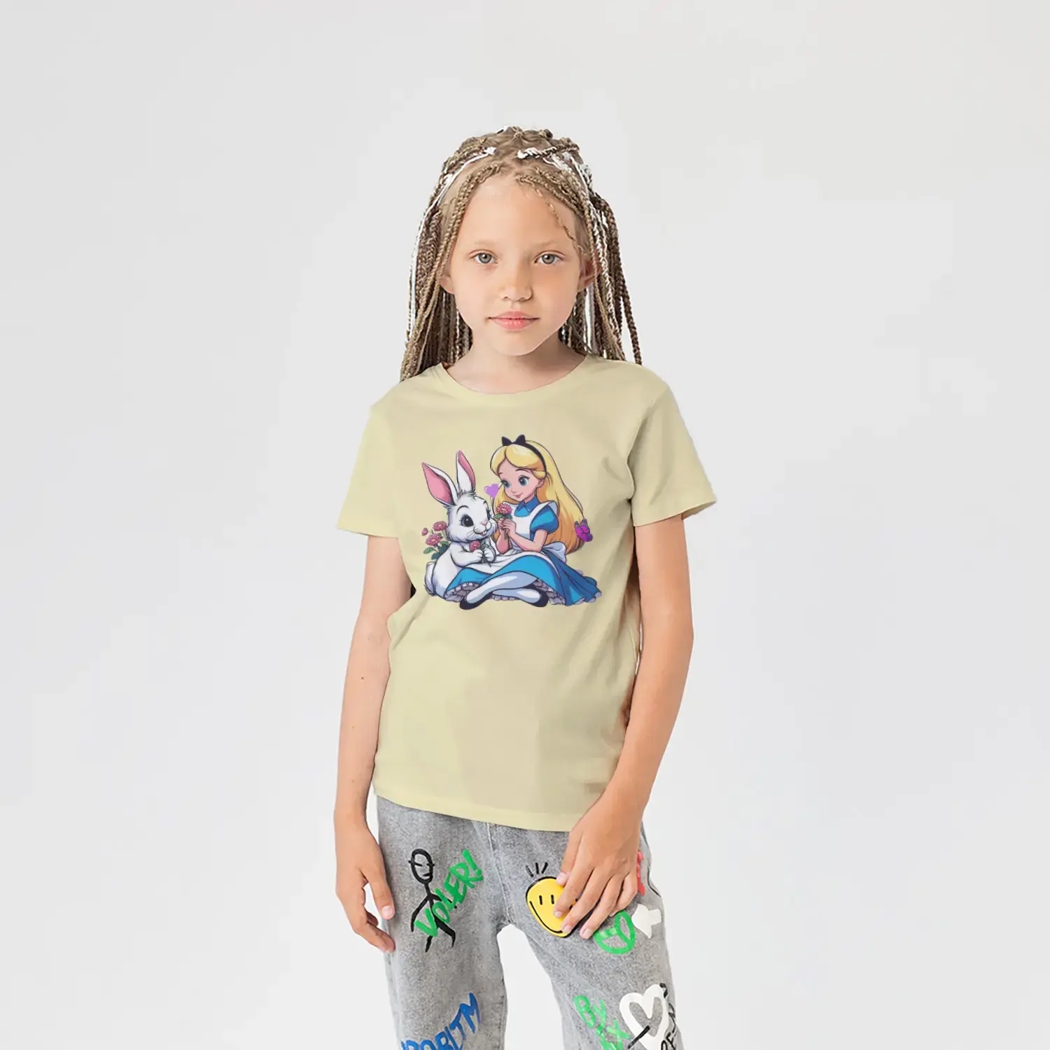 Mavi Elbiseli Sarisin Kiz Ve Beyaz Tavsan Baskılı Kiz Çocuk Tisortu Tişörtü