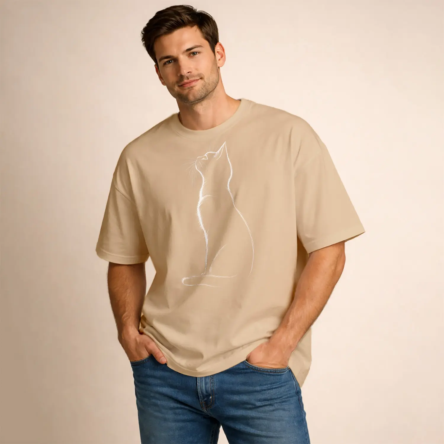 Minimalist Kedili Pembe Baskılı Erkek Tişört