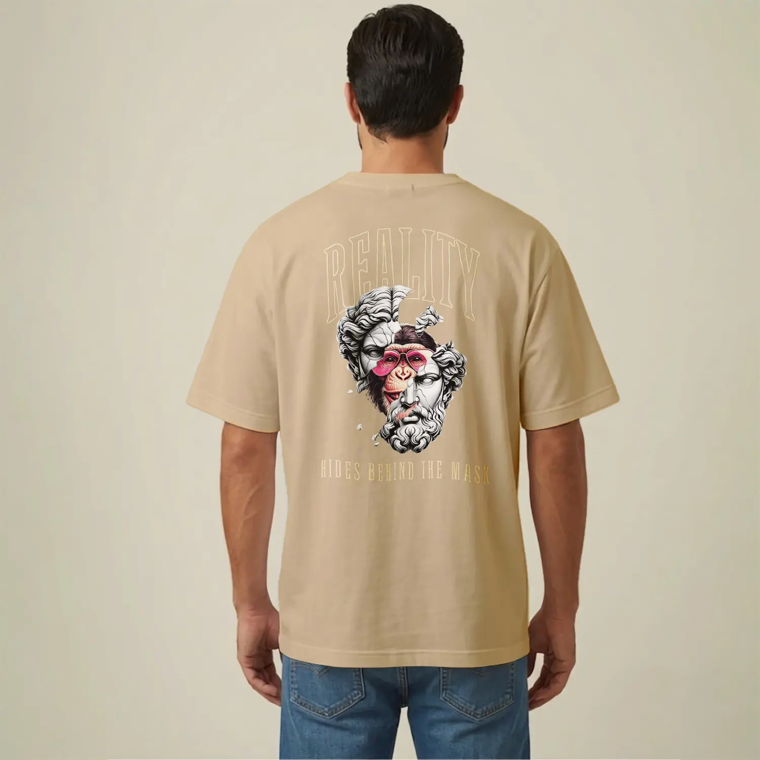 Modern Sanatsal Maymun ve Heykel Baskılı Erkek Tişört