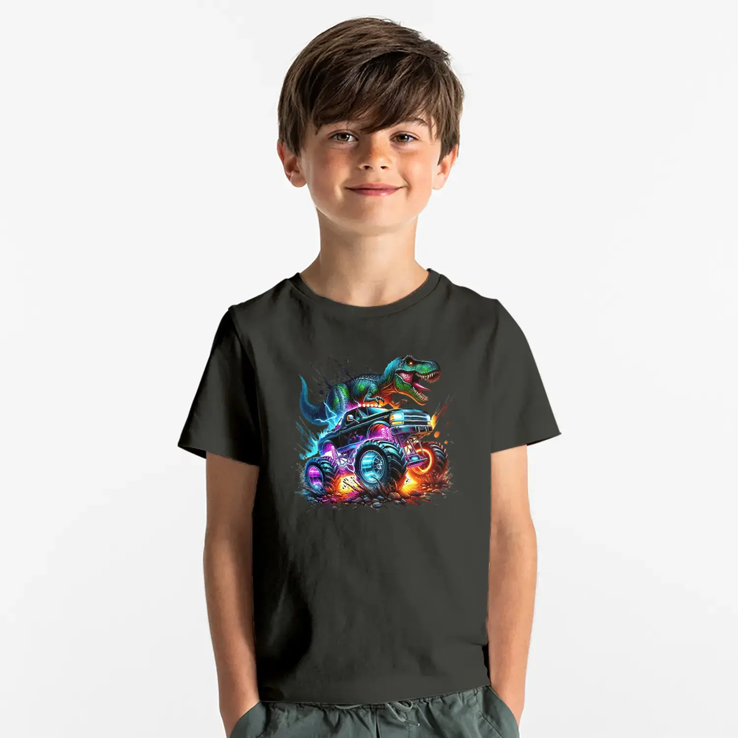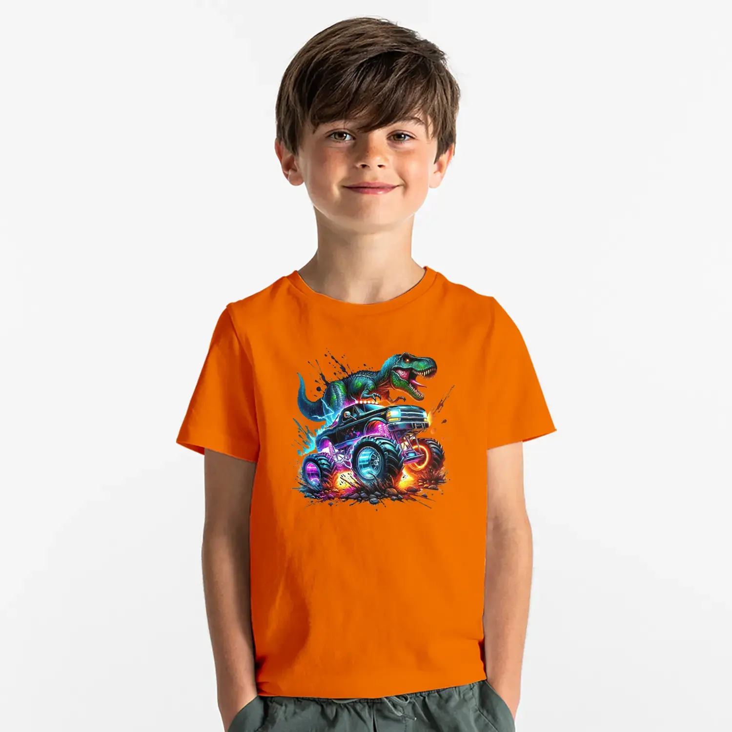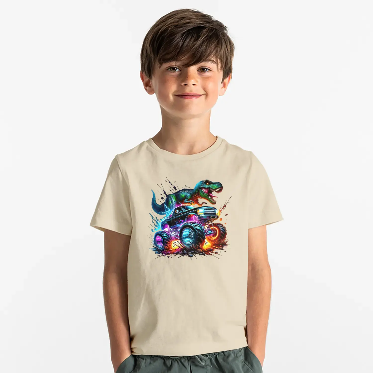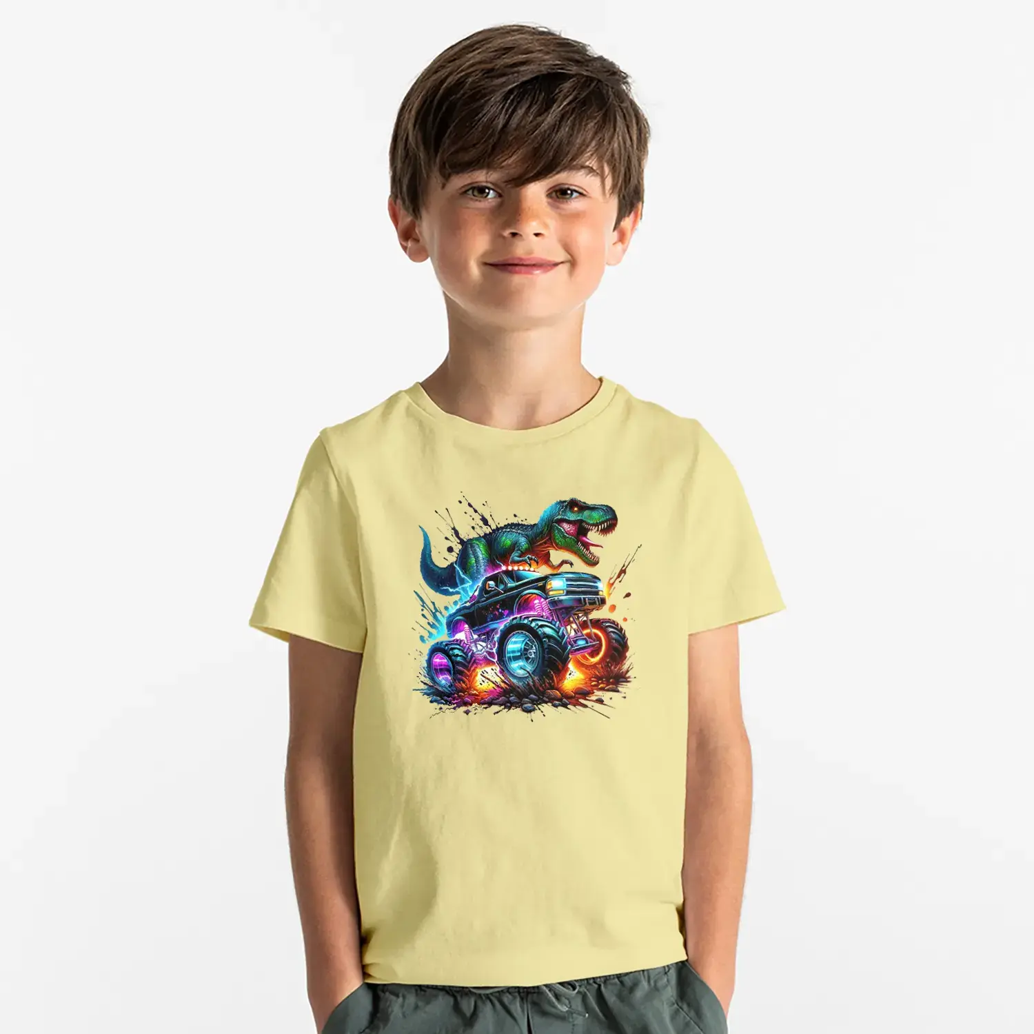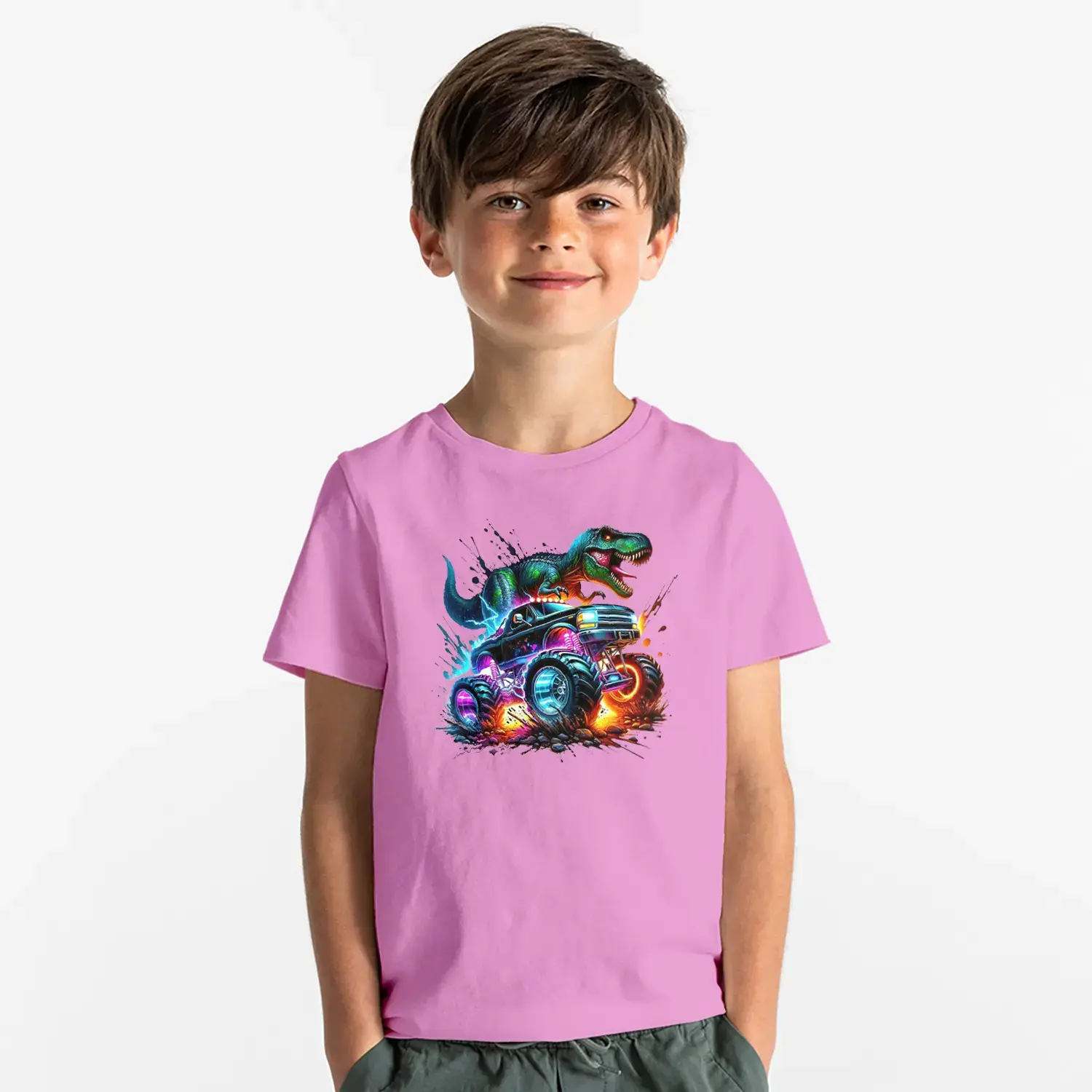 Neon Dinozor Arabali Baskılı Erkek Çocuk Tişörtü