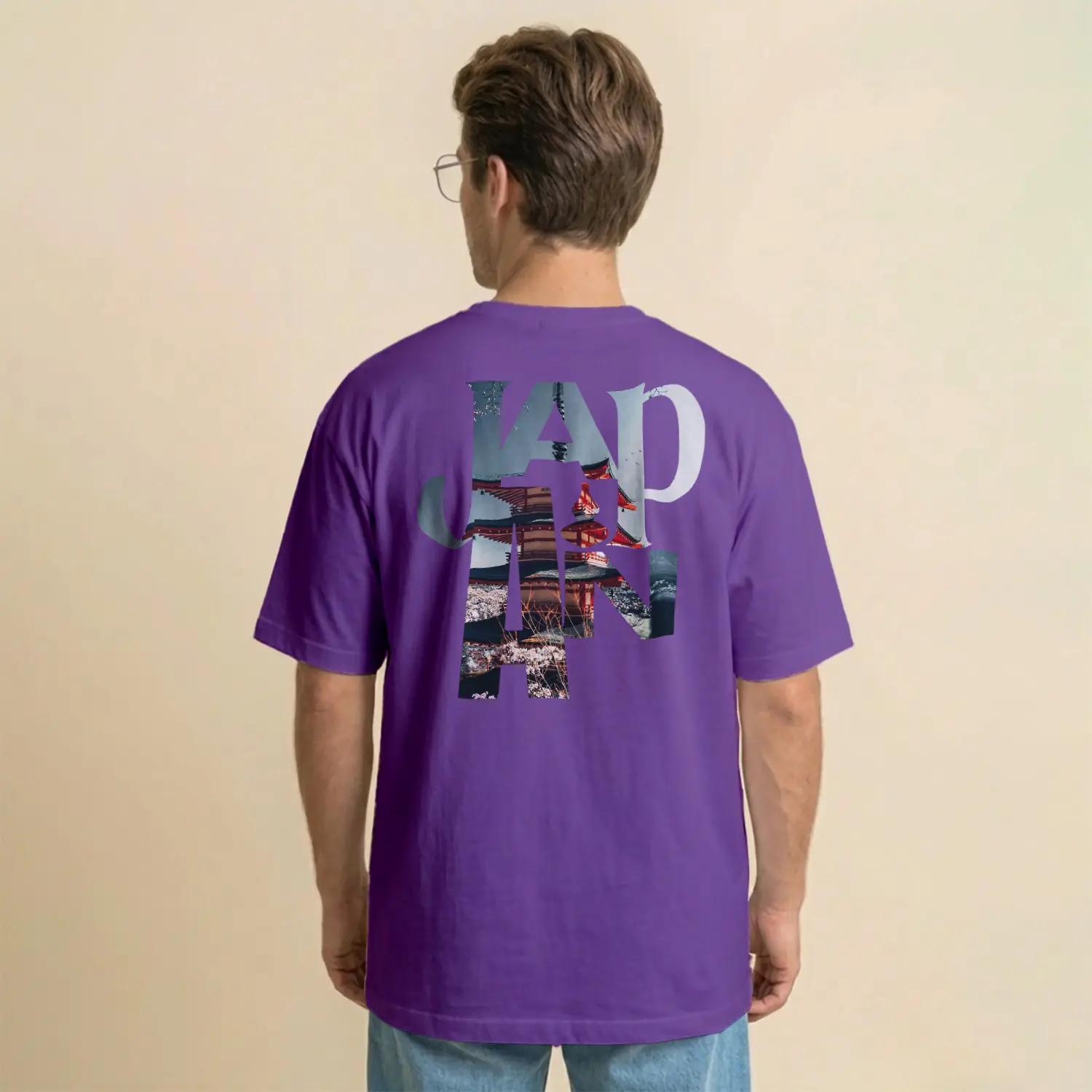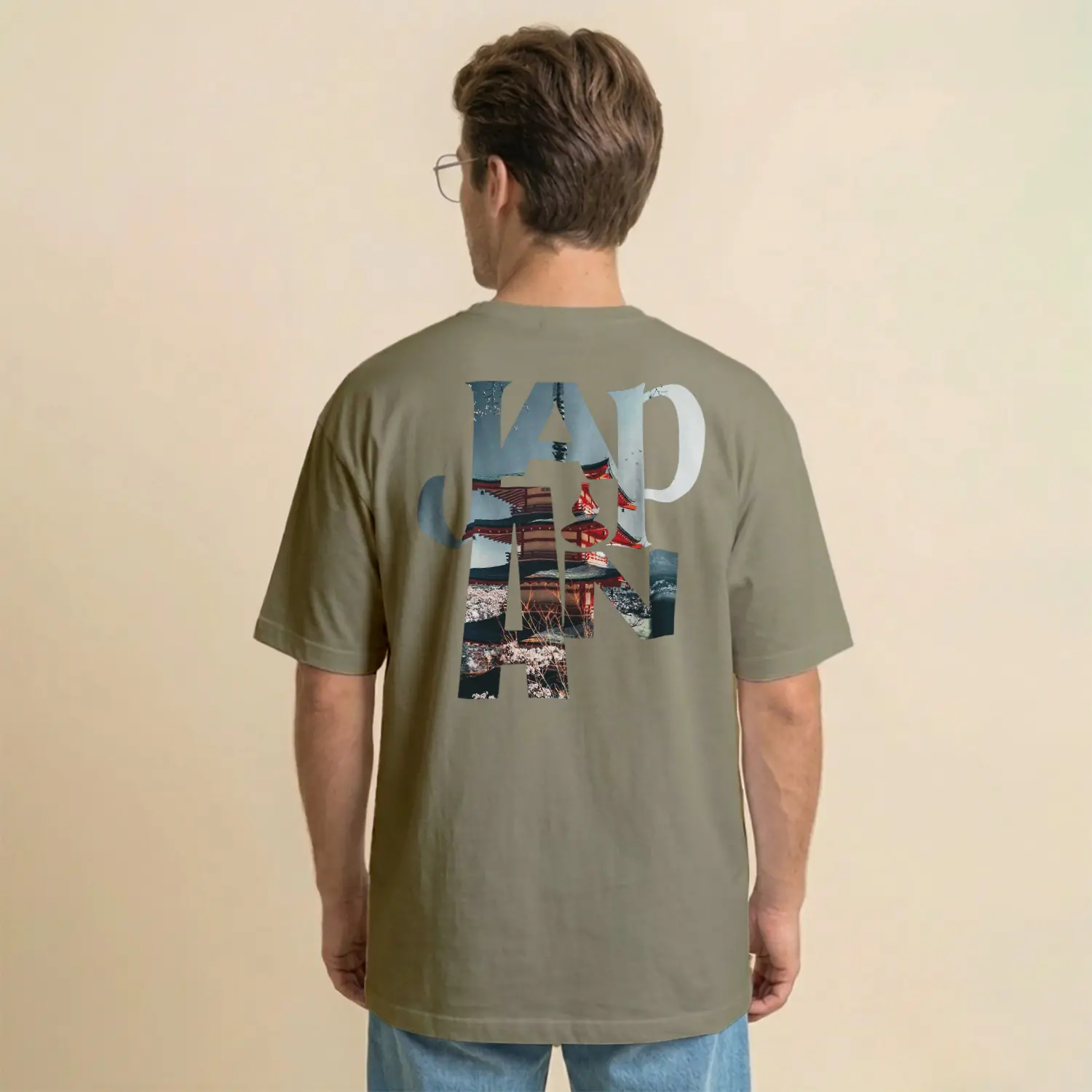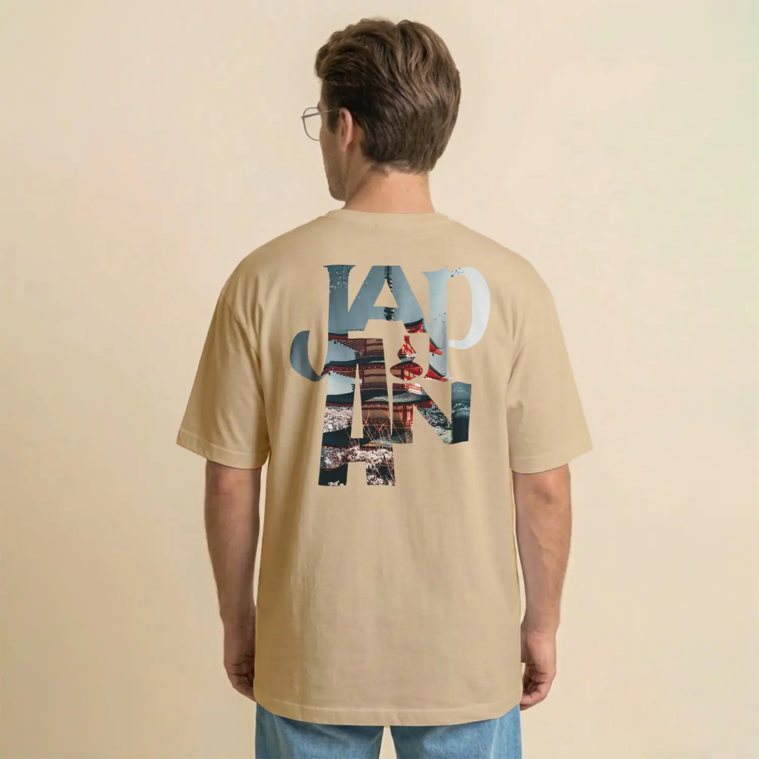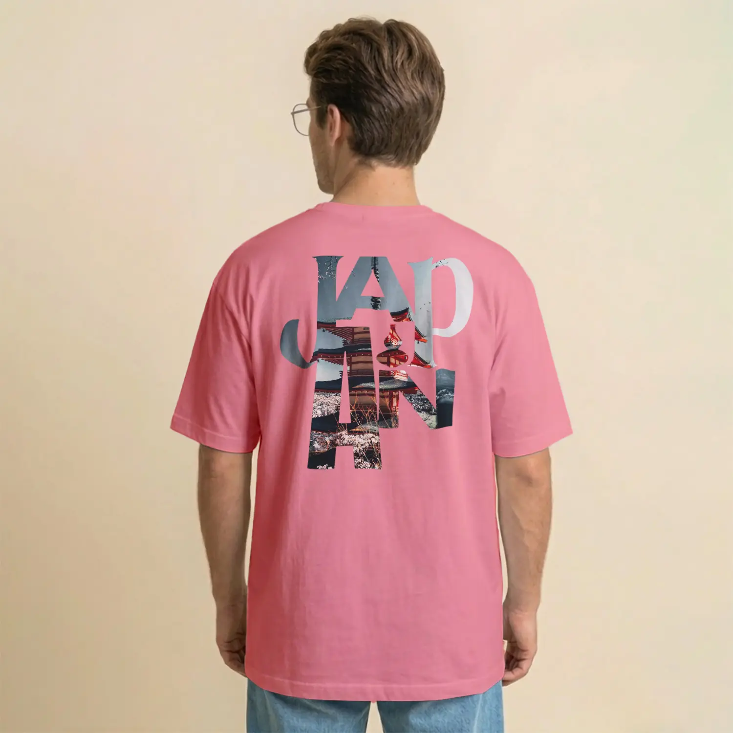 Pastel Pembe Japonya Temalı Baskılı Erkek Tişört
