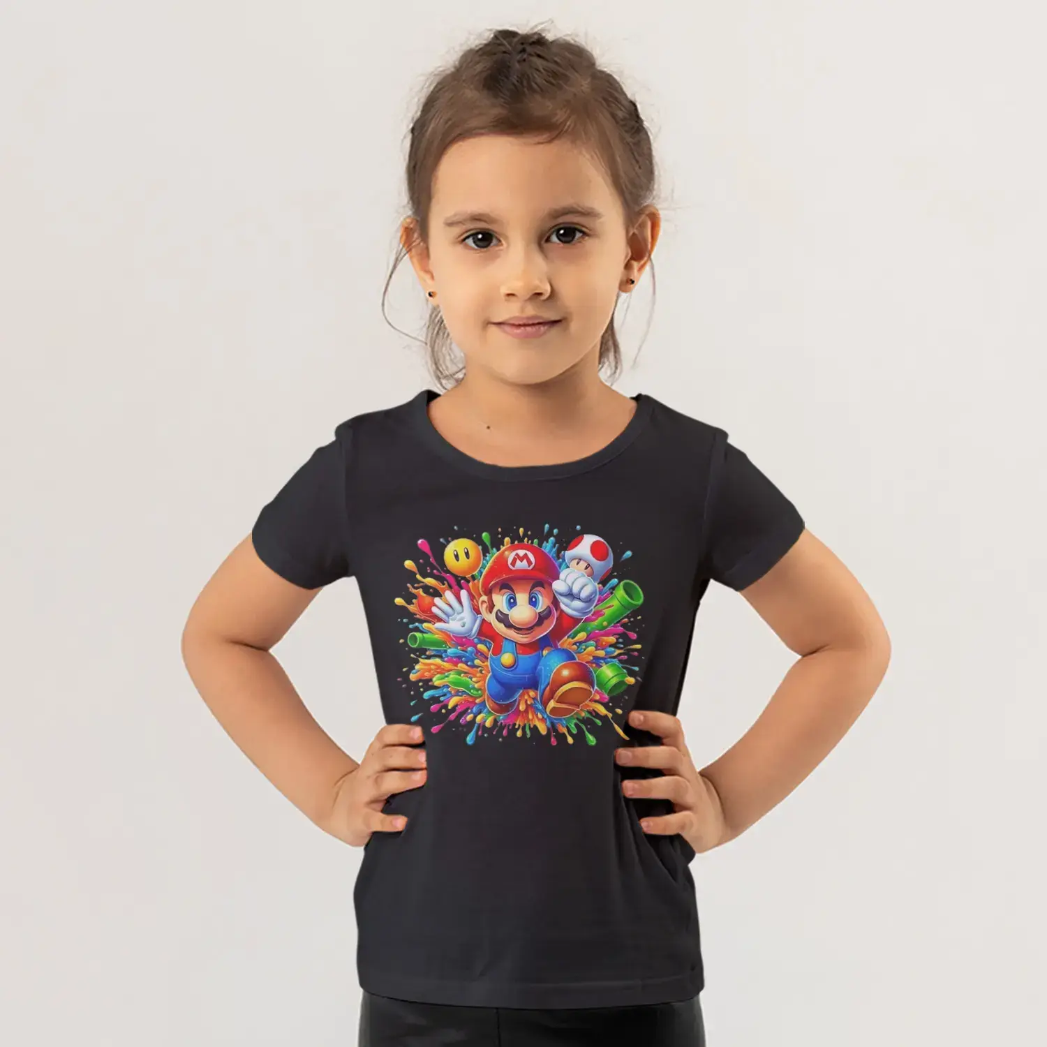 Renkli Boya Sicramali Kırmızı Sapkali Tulum Giyen Sevincli Adam Baskılı Kiz Çocuk Tisortu Tişörtü