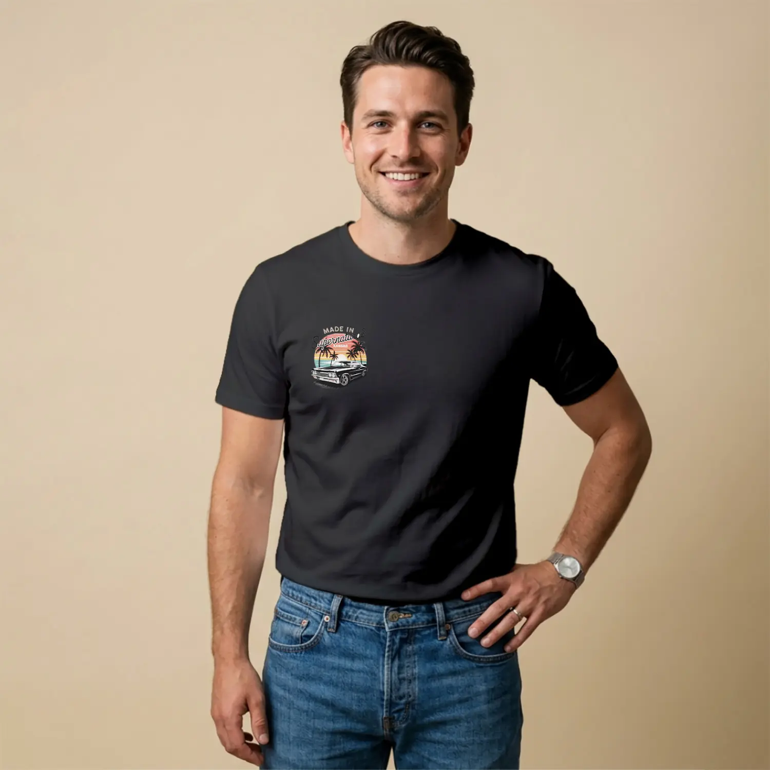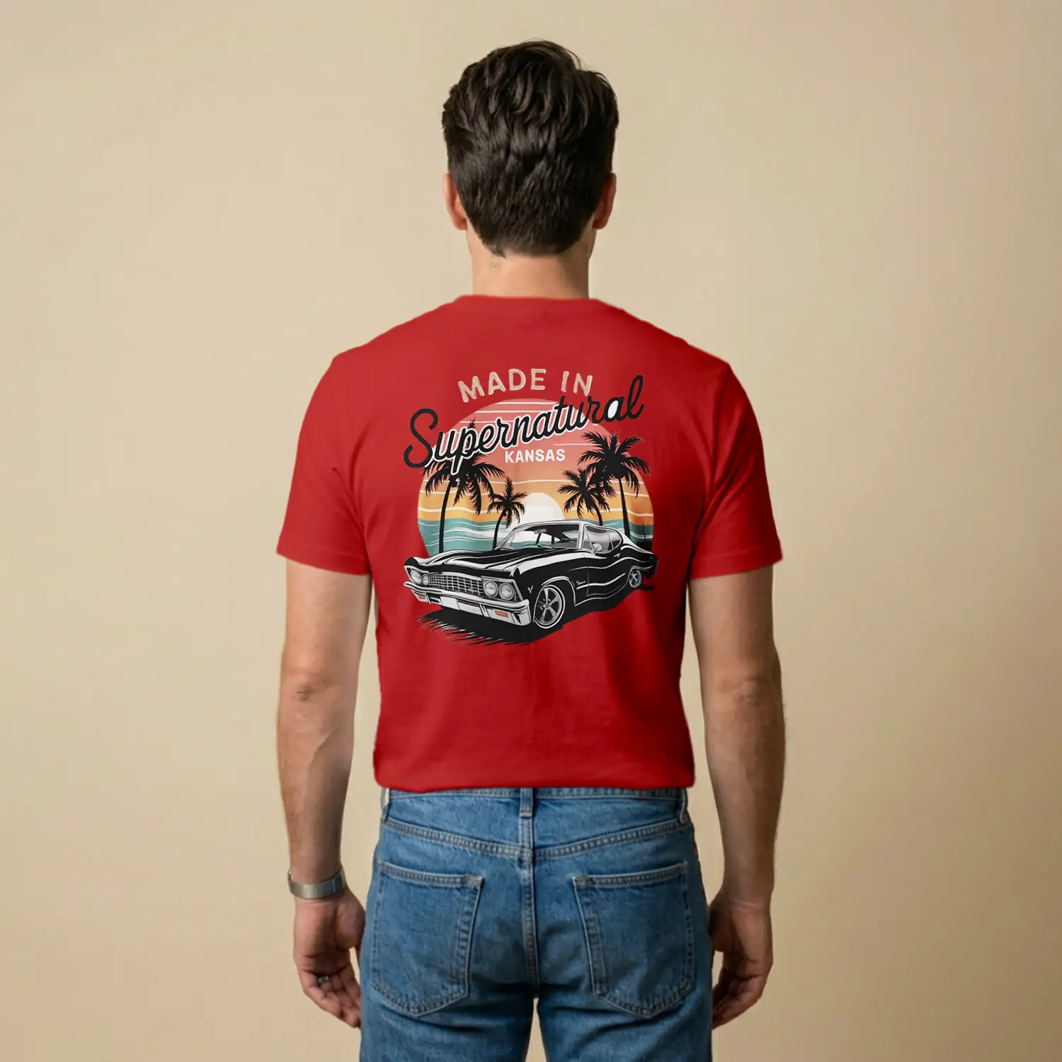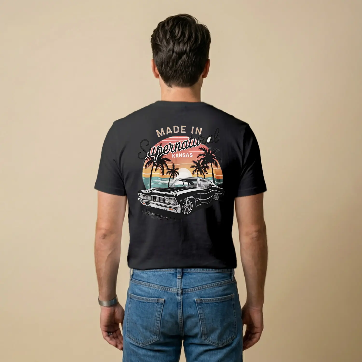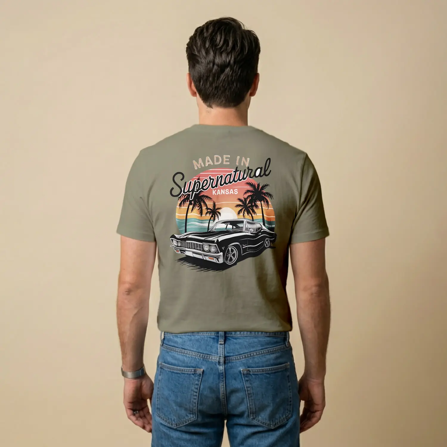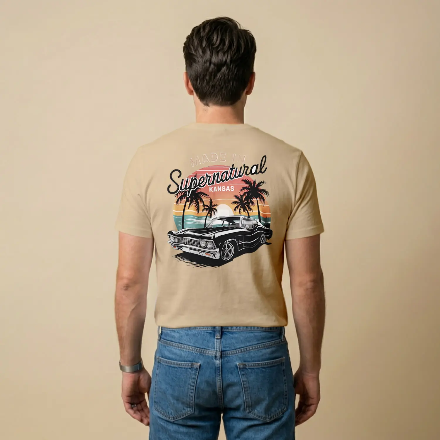 Retro Palmiye ve Araba Tasarımlı Baskılı Erkek Tişört