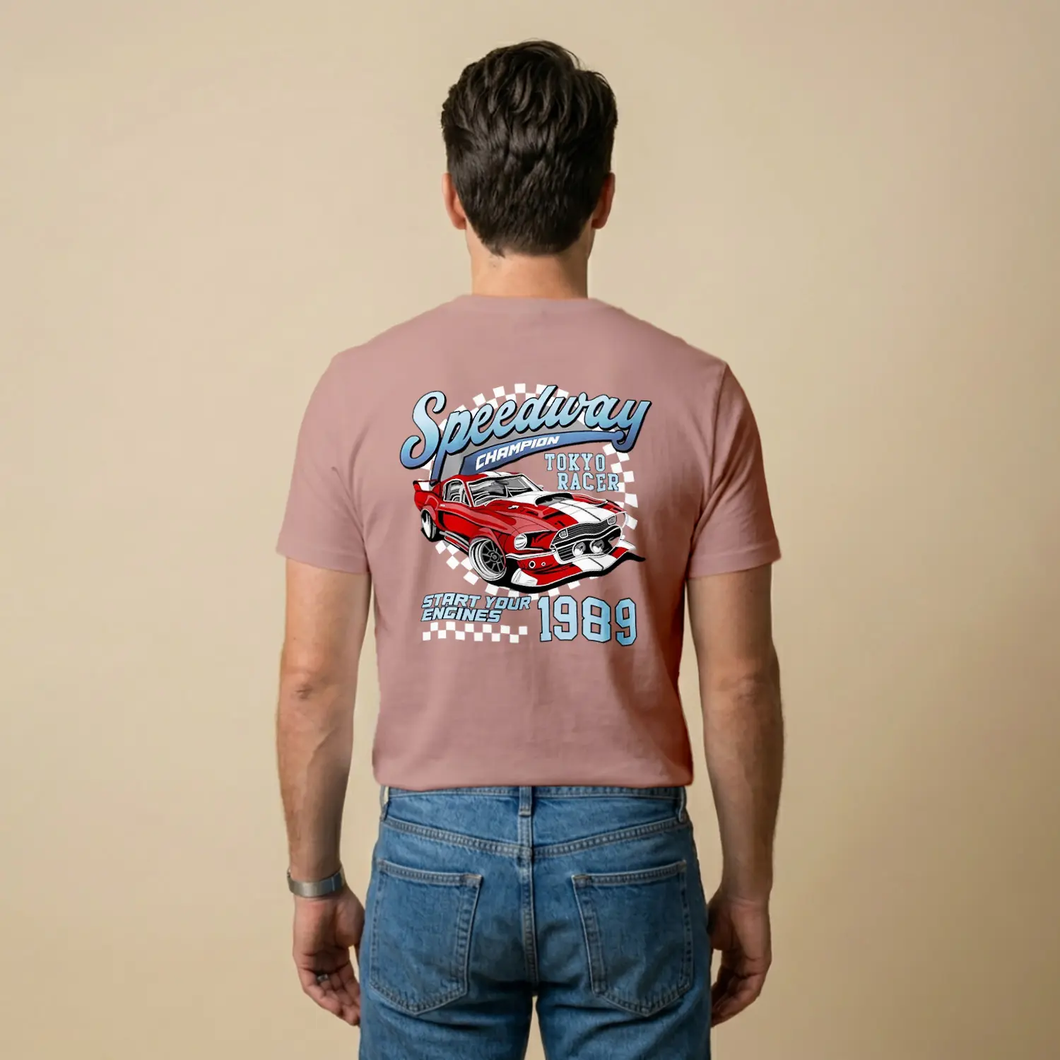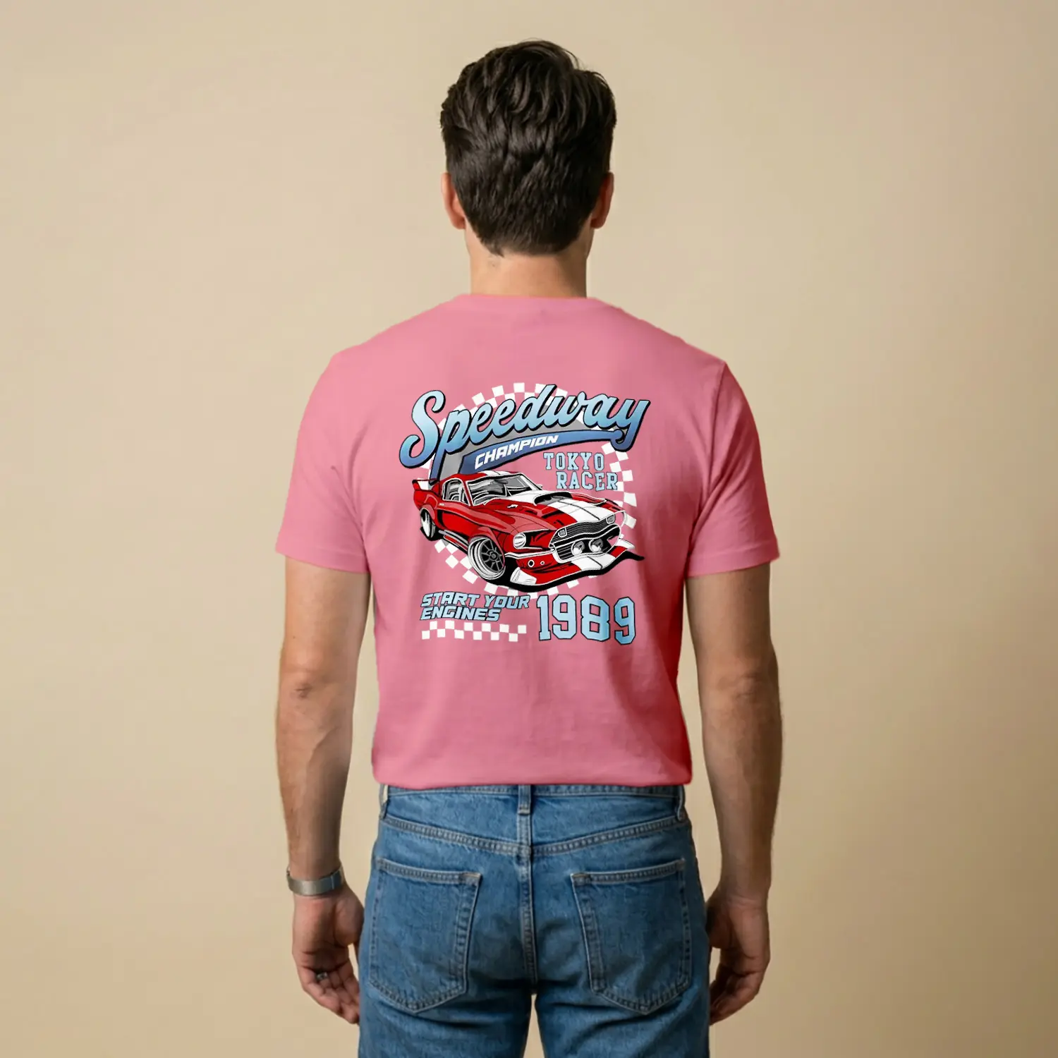 Retro Yaris Arabasi Temalı Pembe Baskılı Erkek Tişörtü