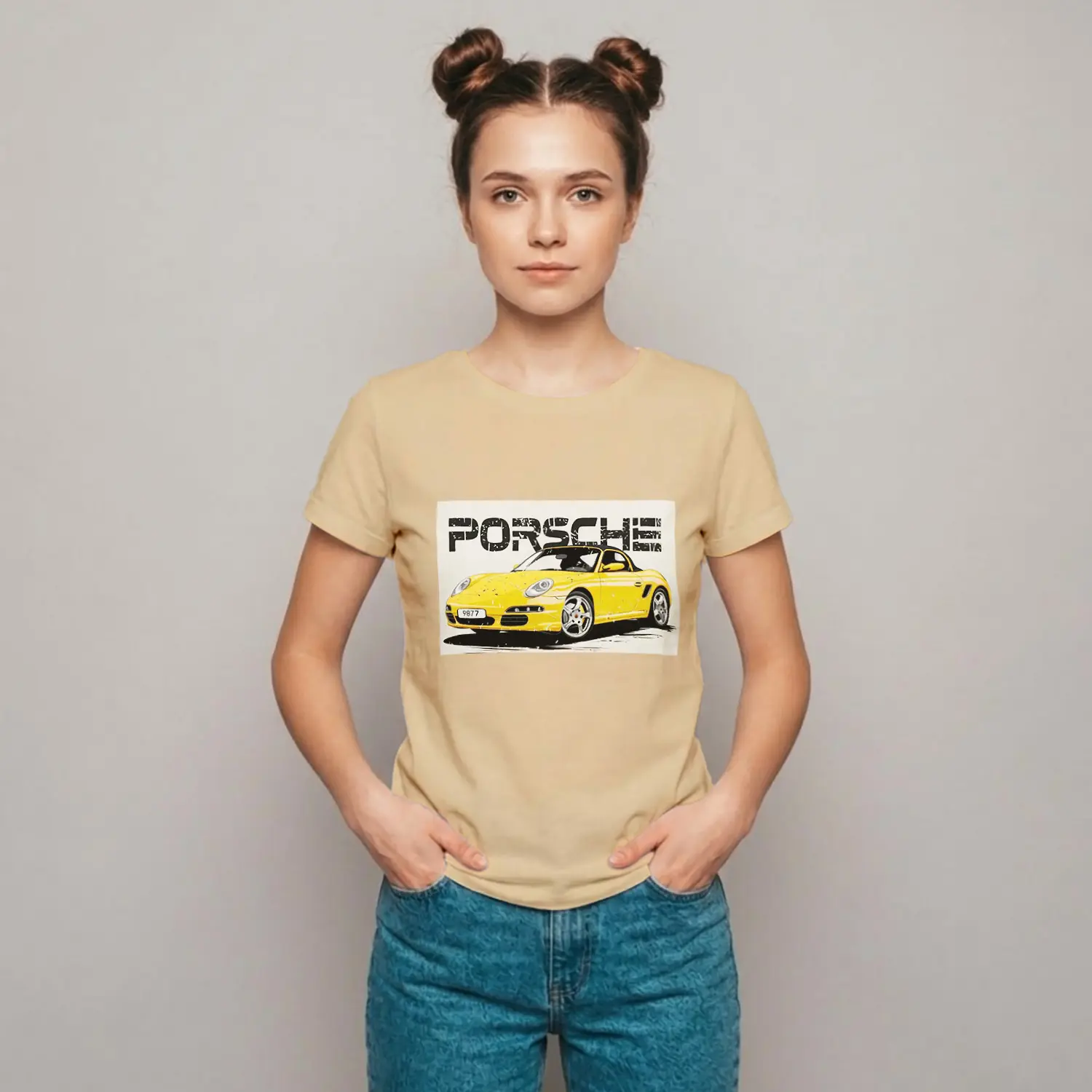 Sarı Spor Araba Baskılı Kadın Tişört