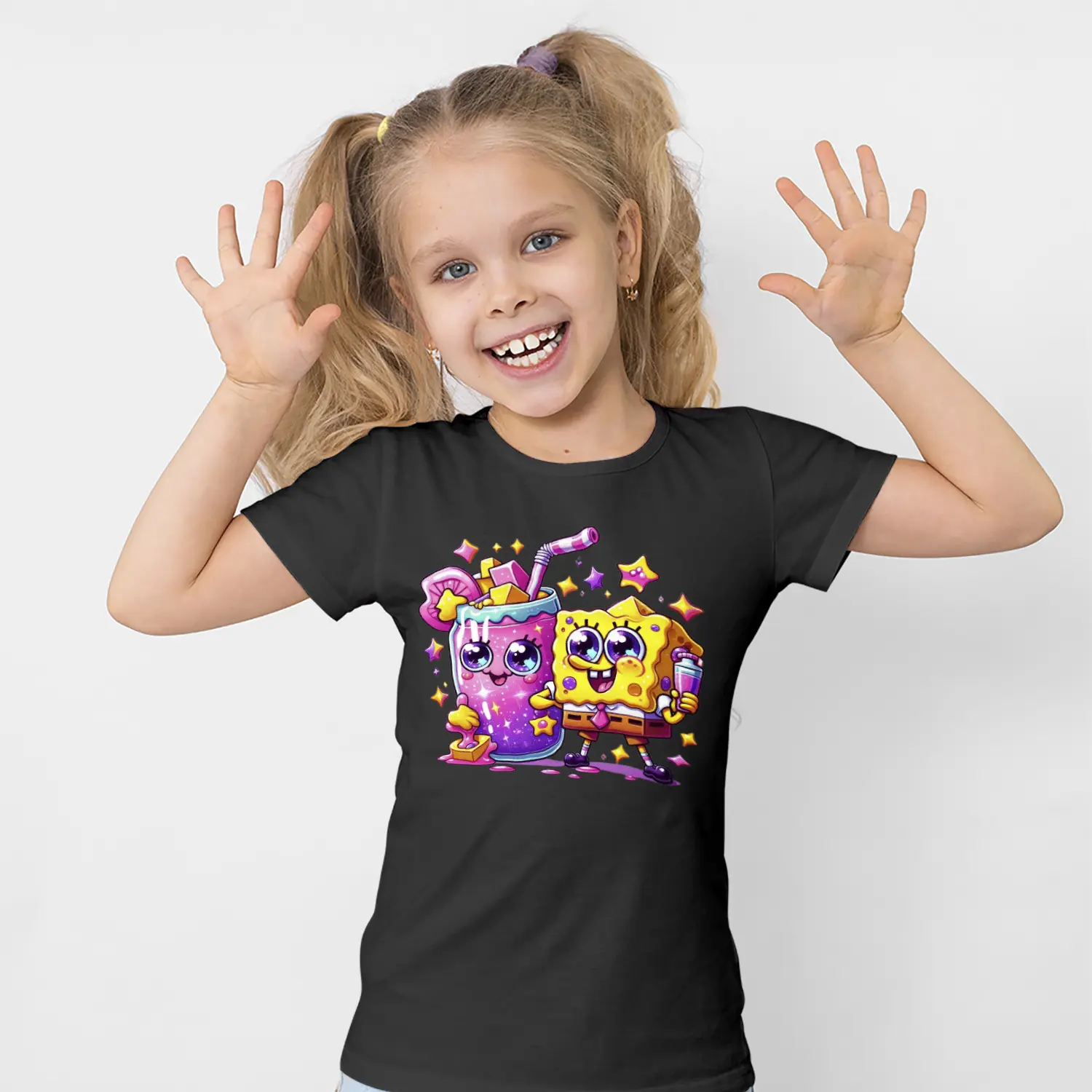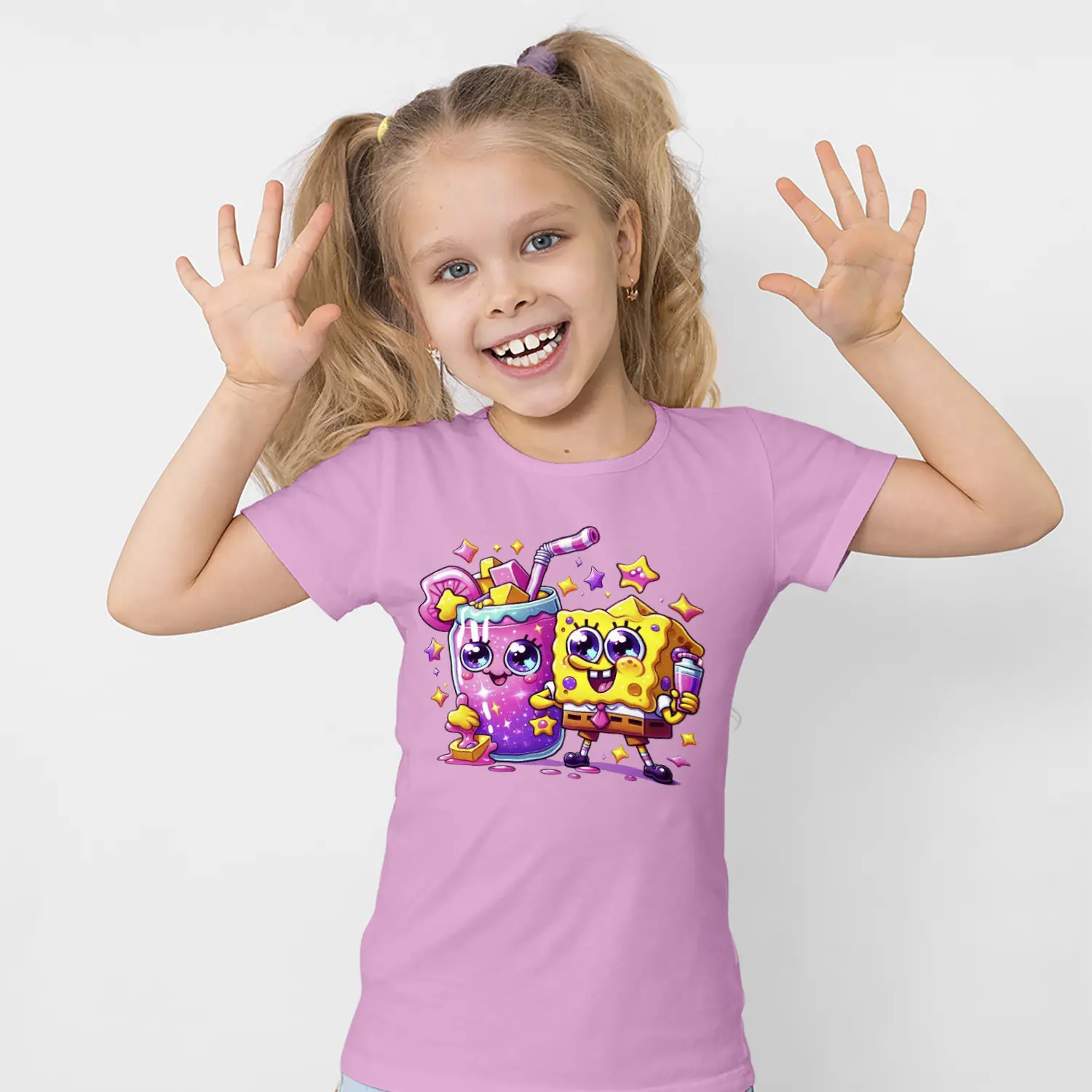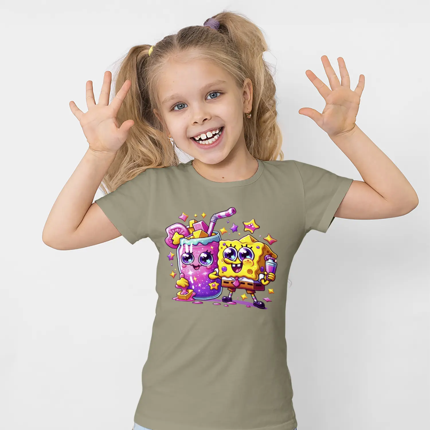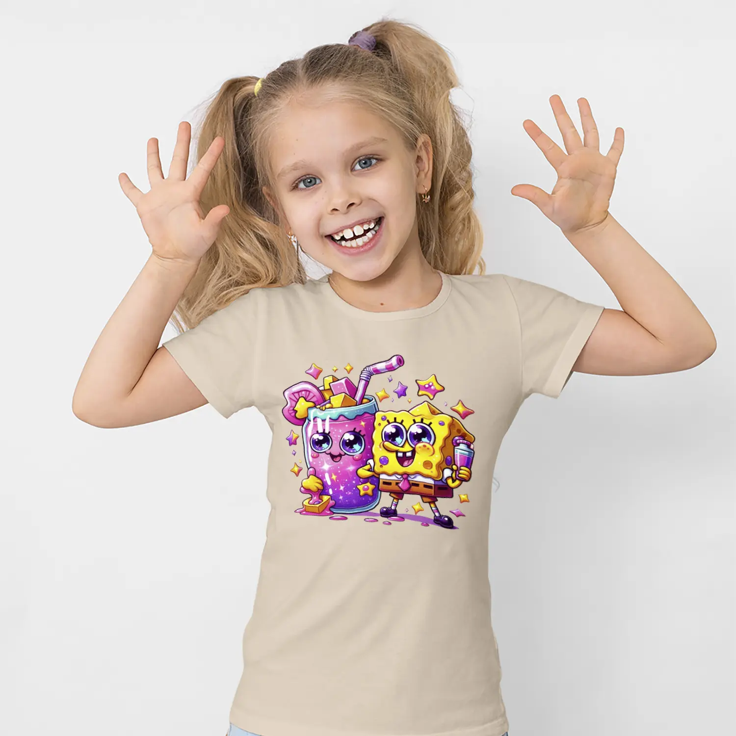 Sarı Sunger Karakter Ve Sevimli Icecek Figürlü Baskılı Kiz Çocuk Tisortu Tişörtü