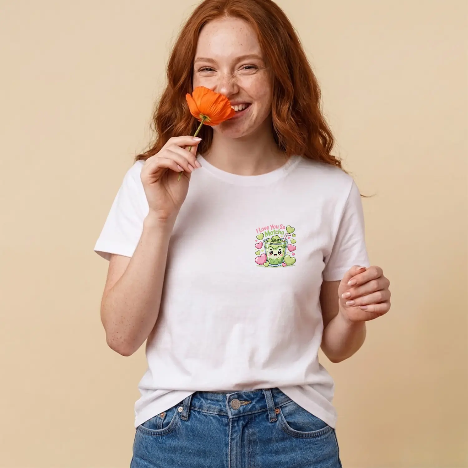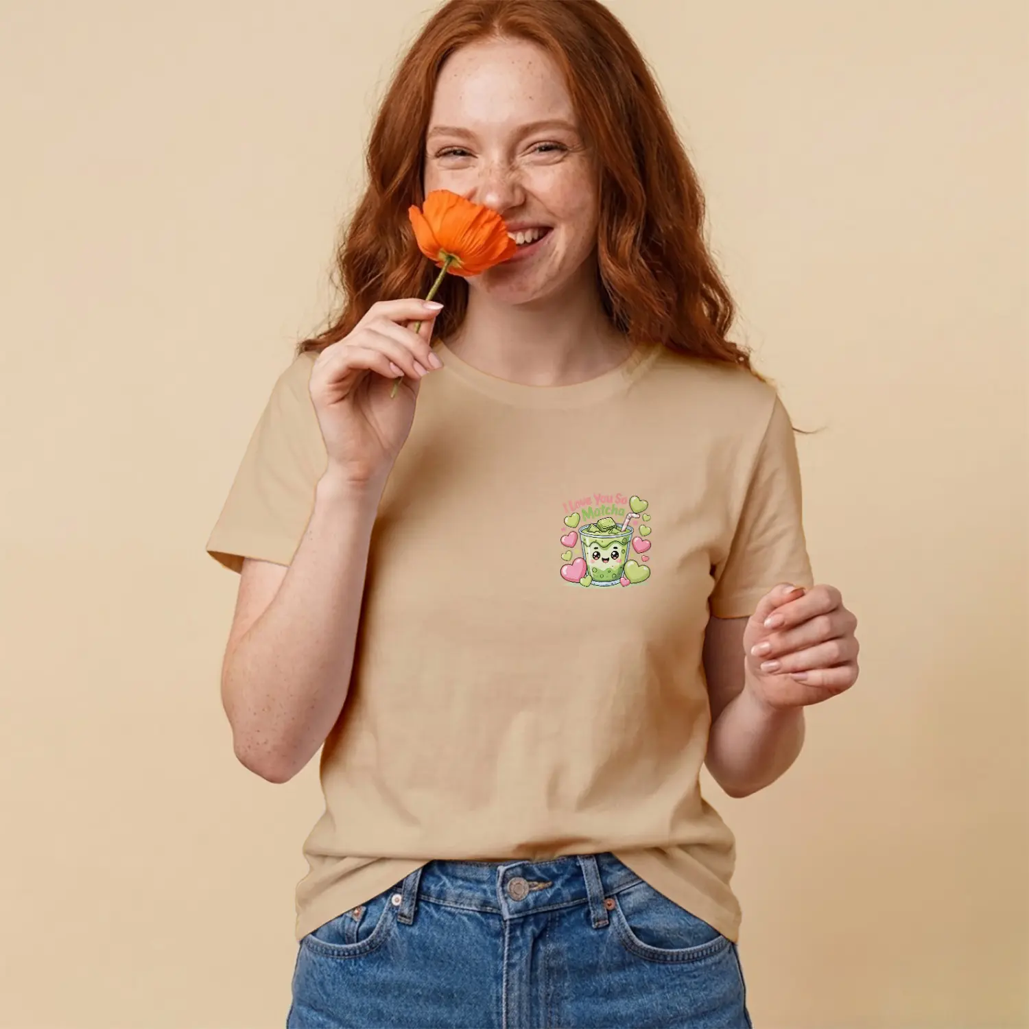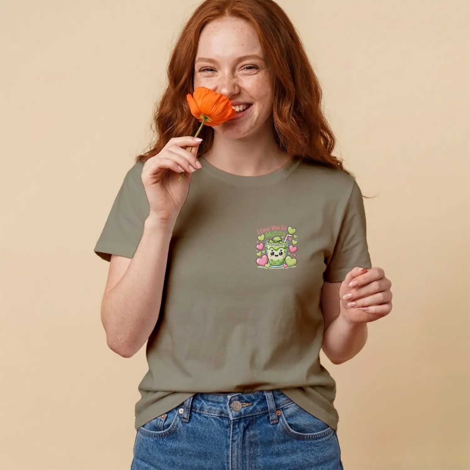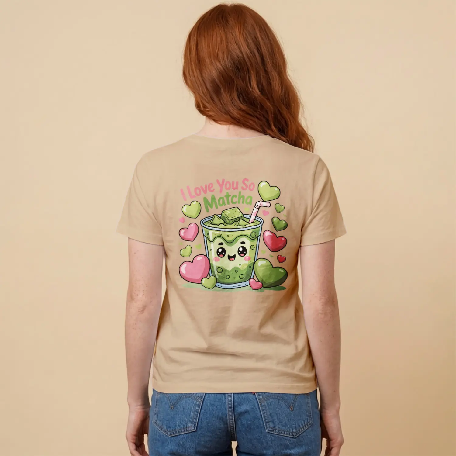 Sevimli Matcha Kalpler Baskılı Kadın Tişört