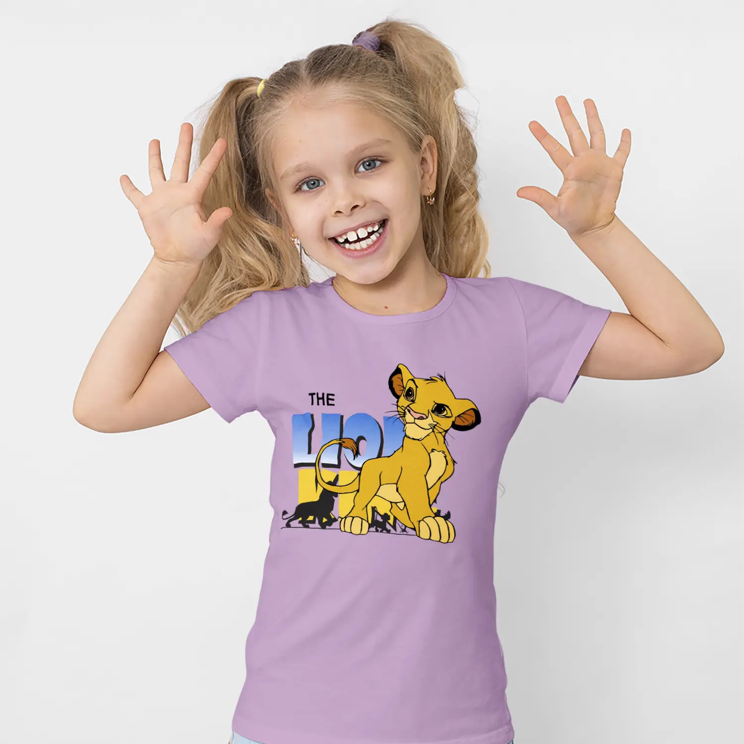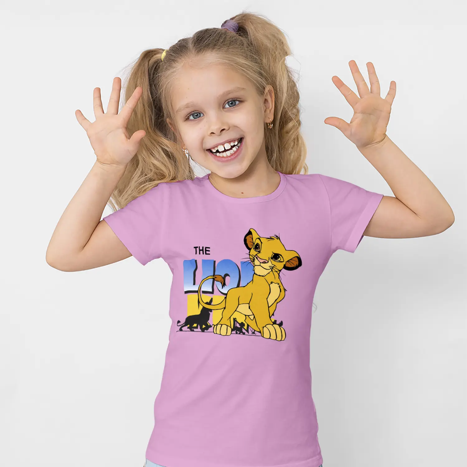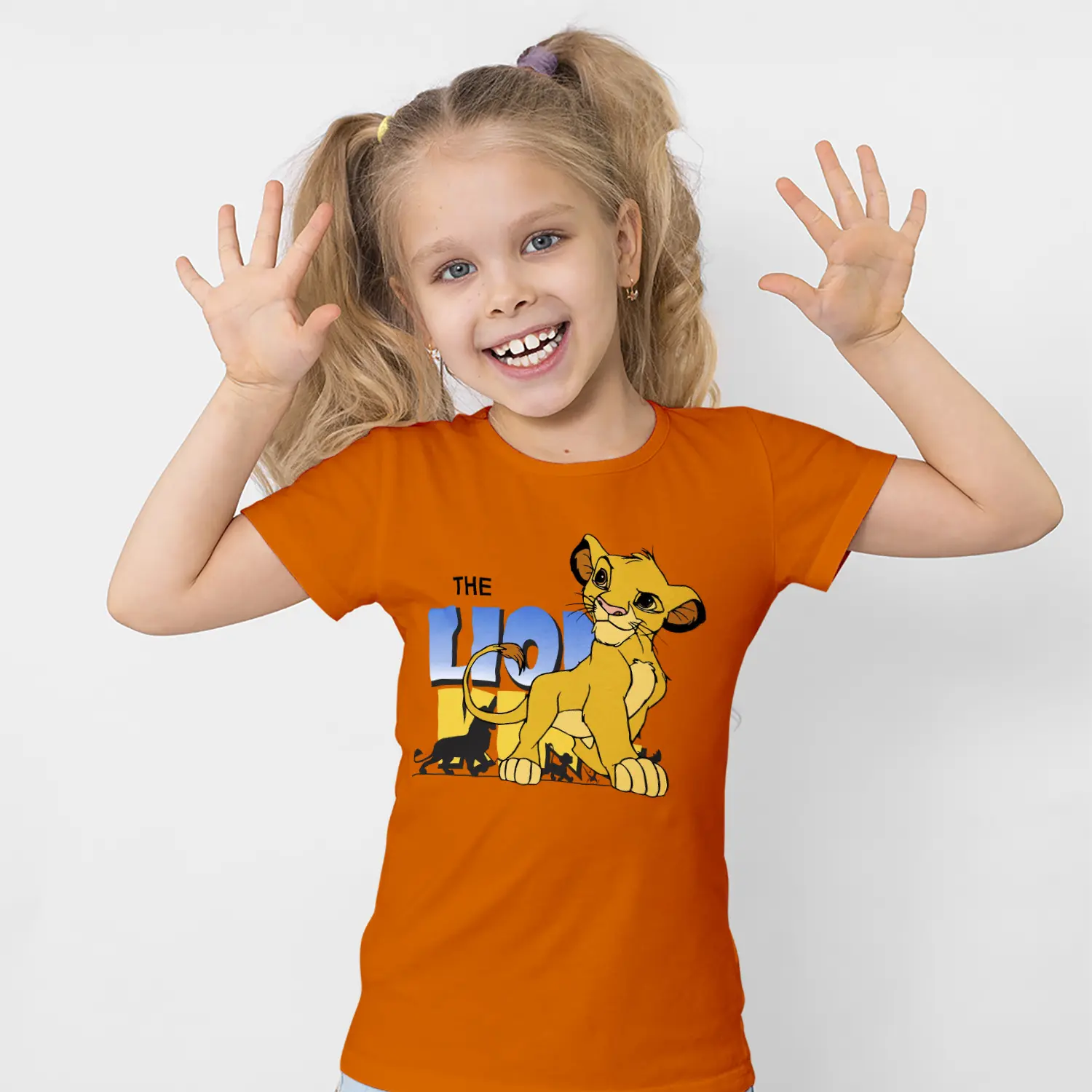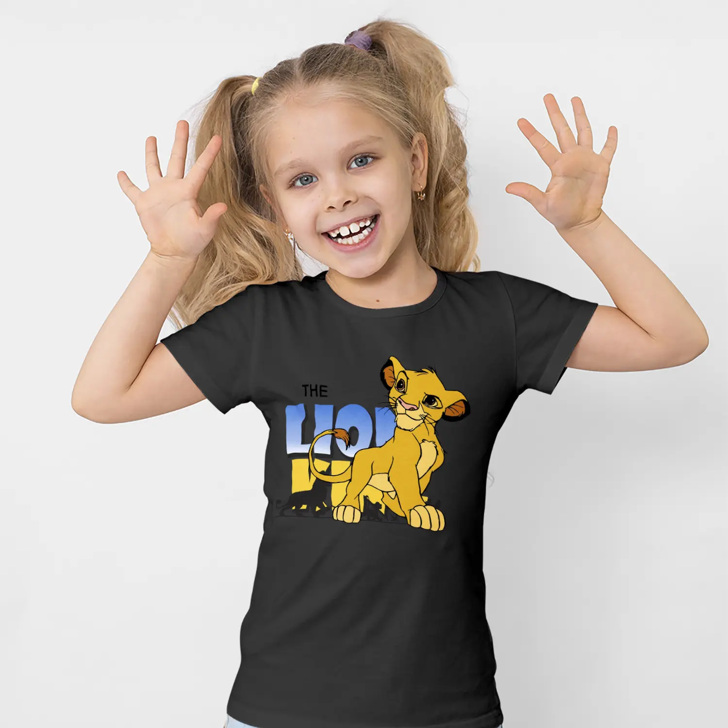 Aslan Yavrusu ve Gün Batımı Siluetli Karikatür Figürlü Baskılı Kız Çocuk Tişörtü
