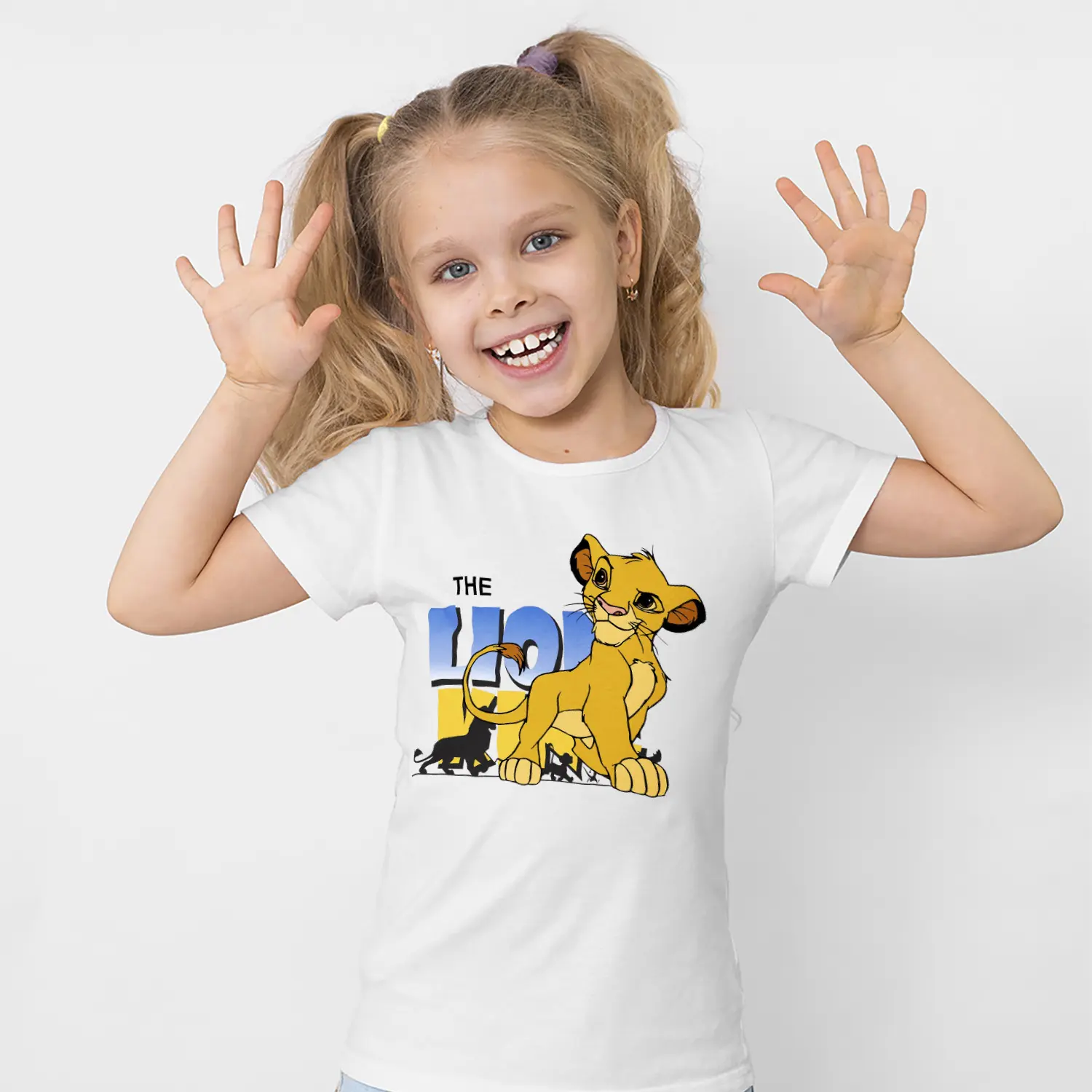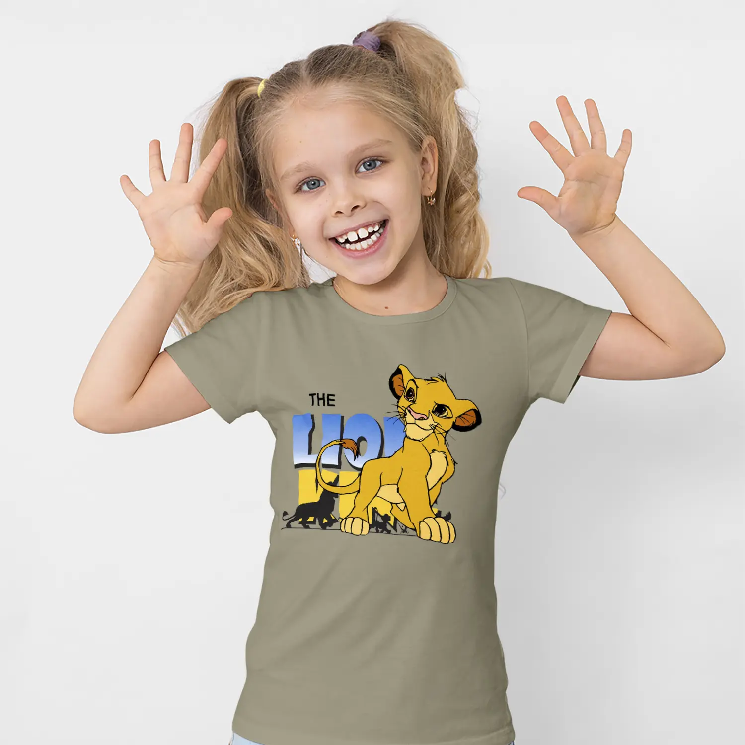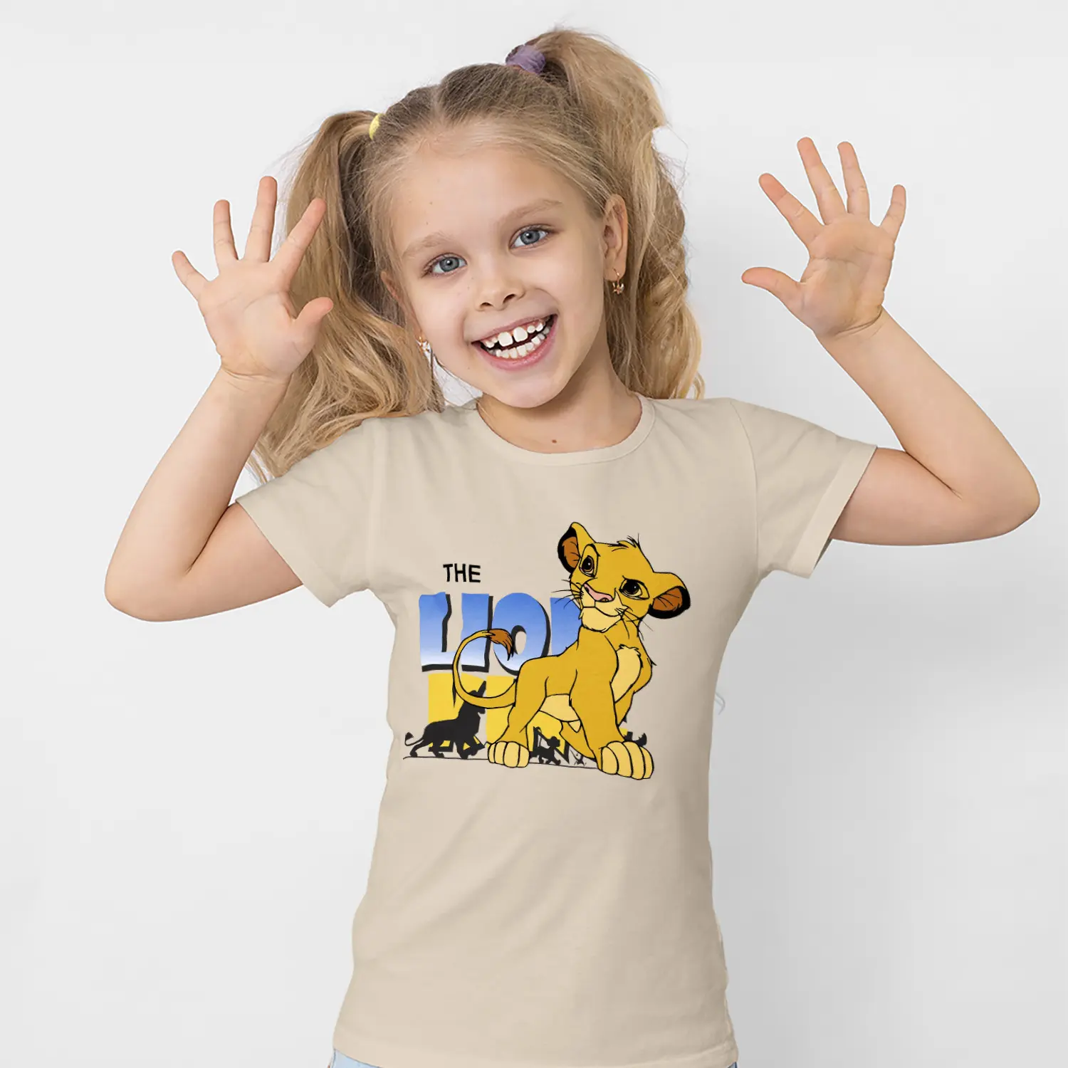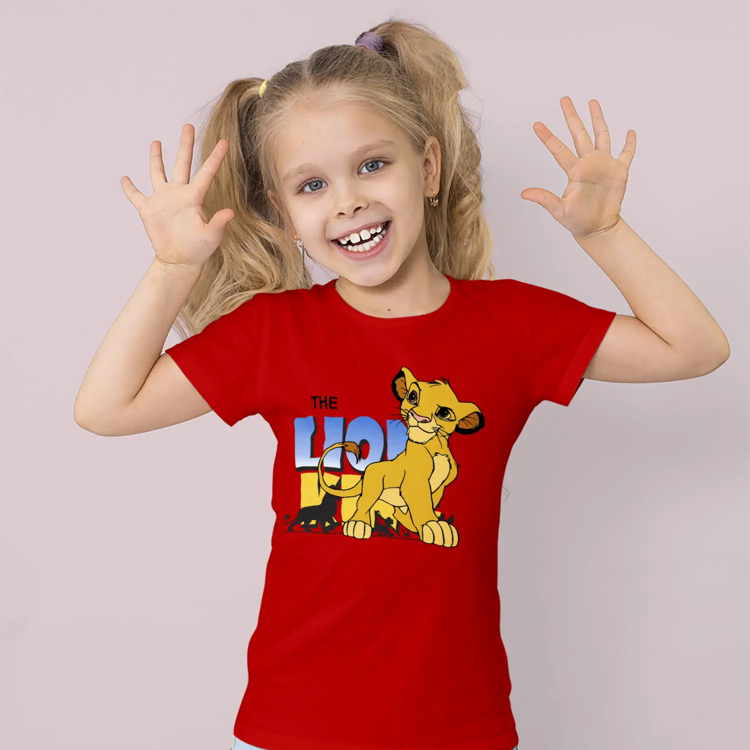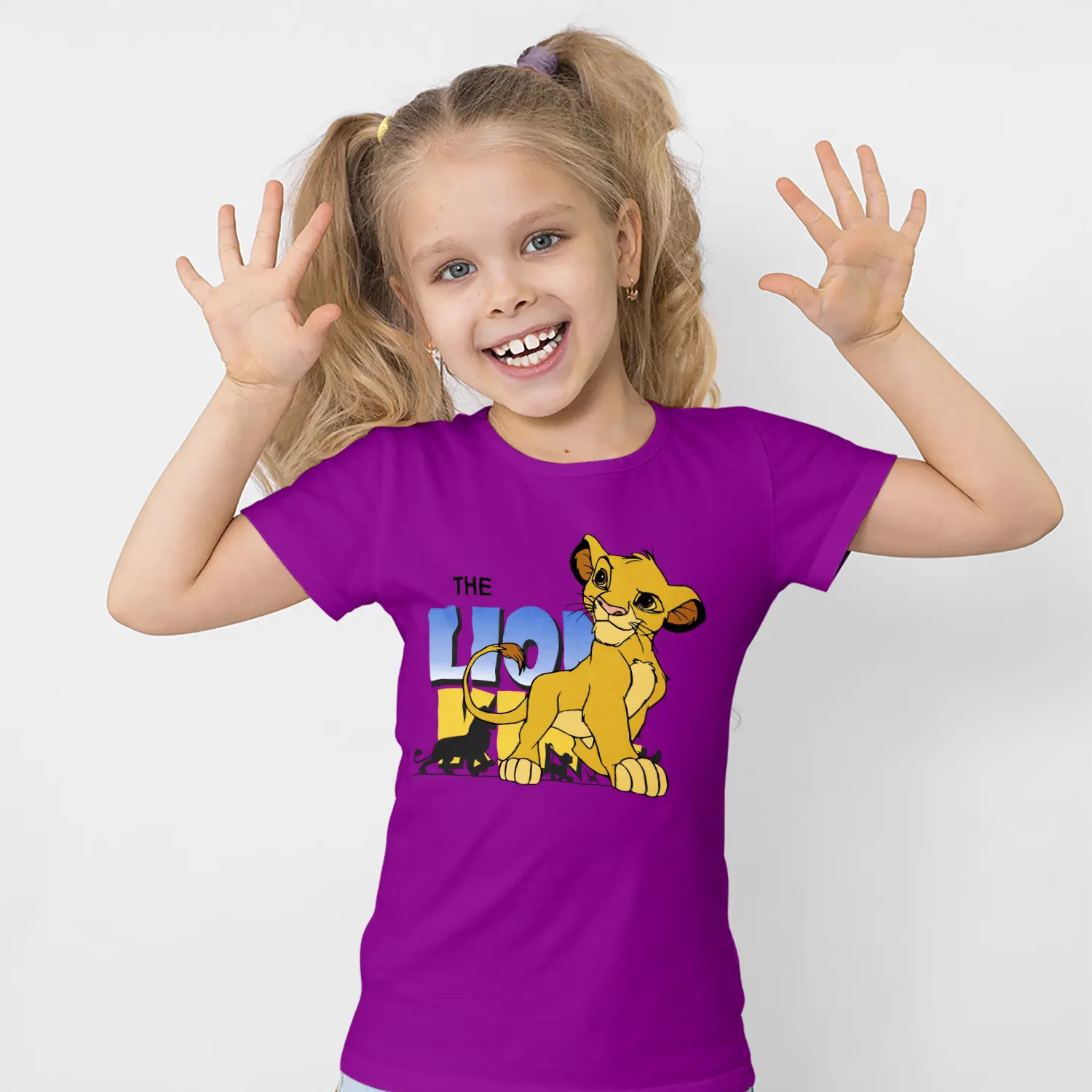 Aslan Yavrusu ve Gün Batımı Siluetli Karikatür Figürlü Baskılı Kız Çocuk Tişörtü