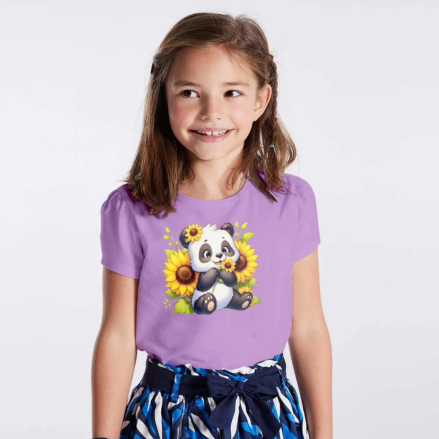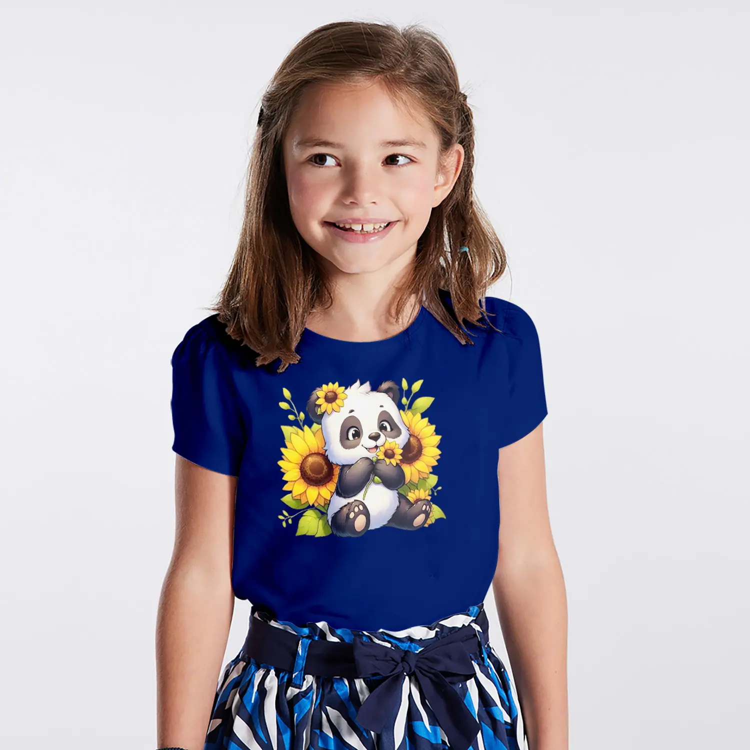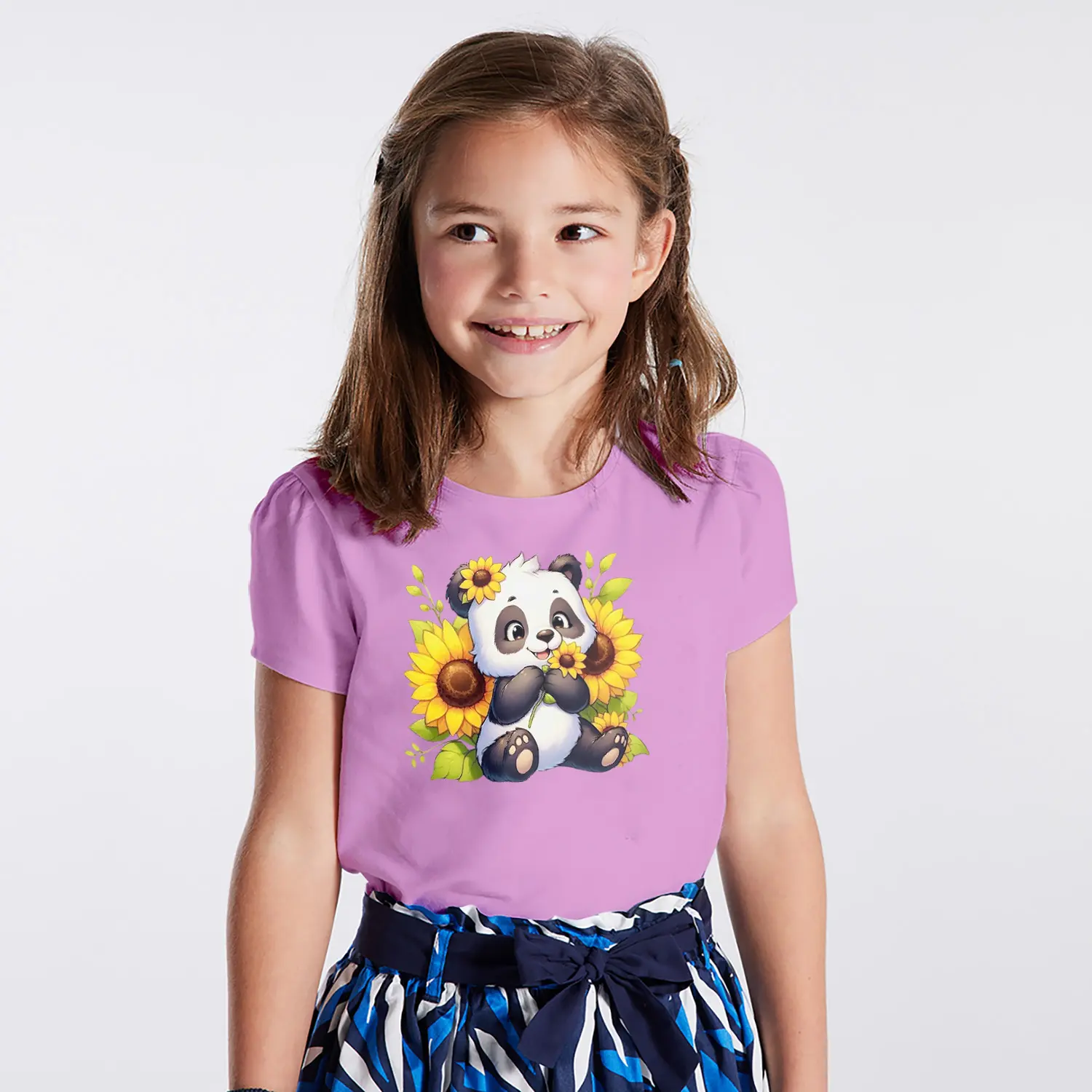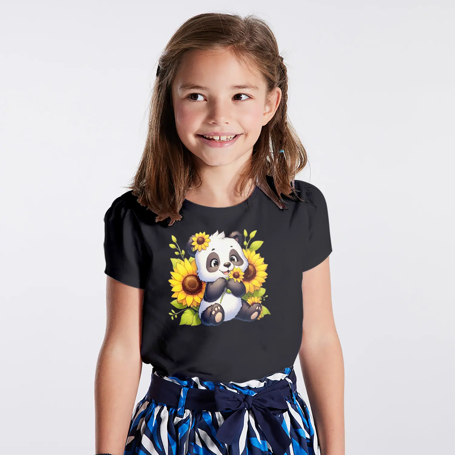 Ayçiçekli Sevimli Panda Figürlü Baskılı Kız Çocuk Tişörtü