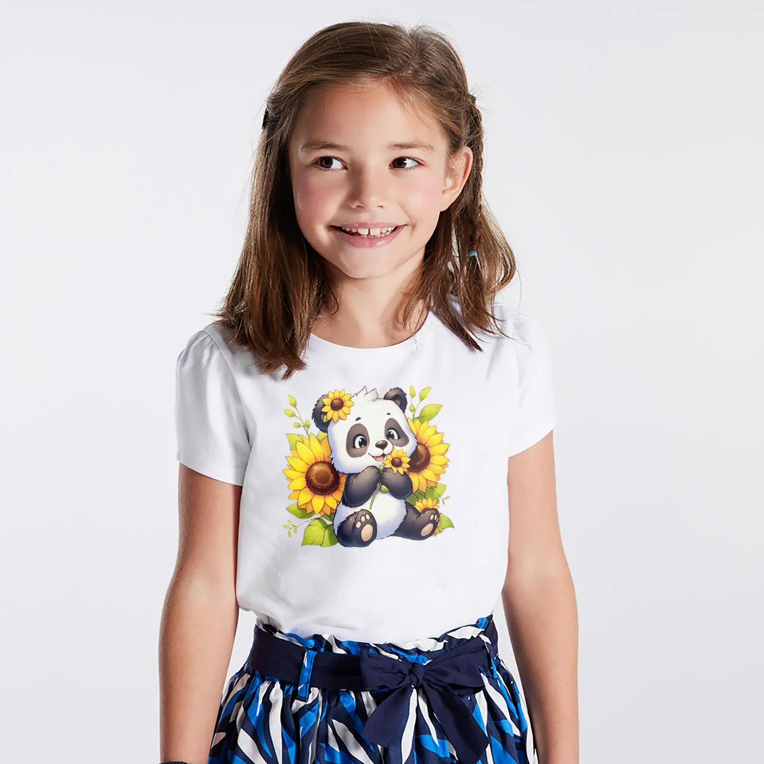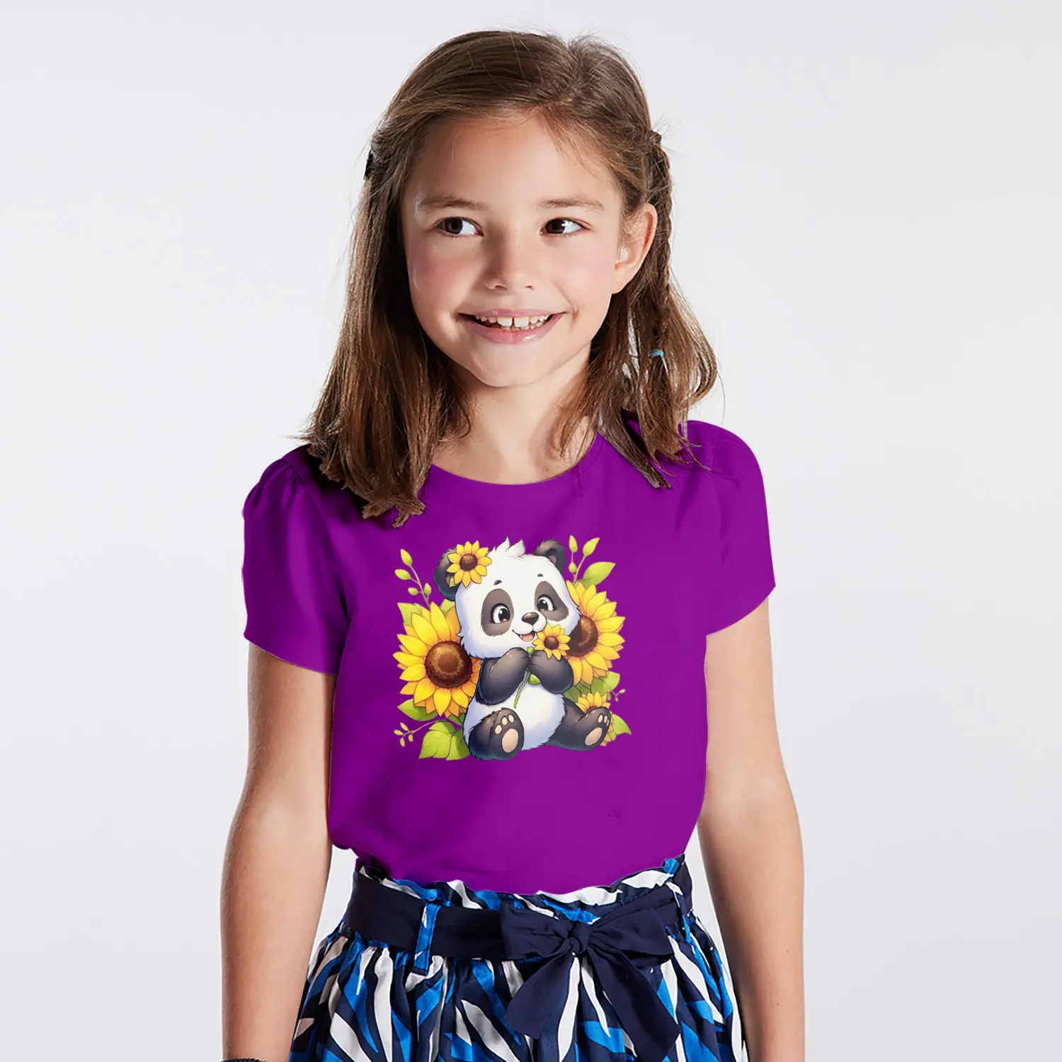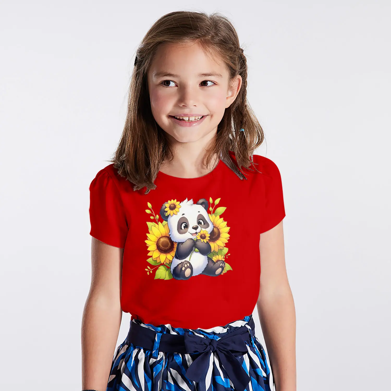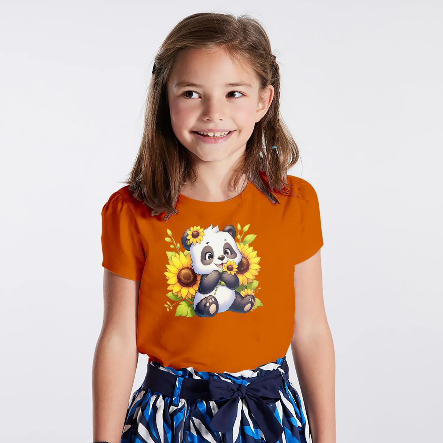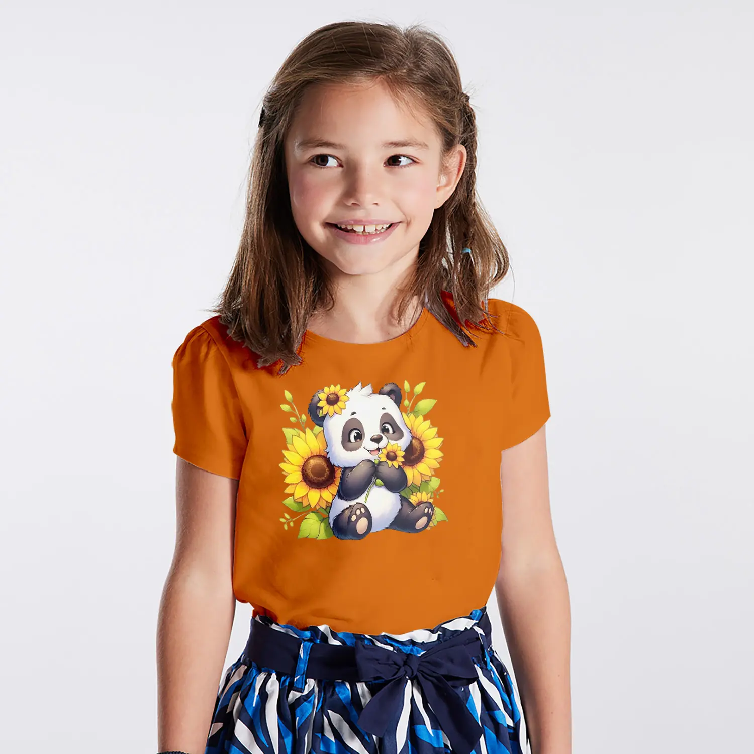 Ayçiçekli Sevimli Panda Figürlü Baskılı Kız Çocuk Tişörtü
