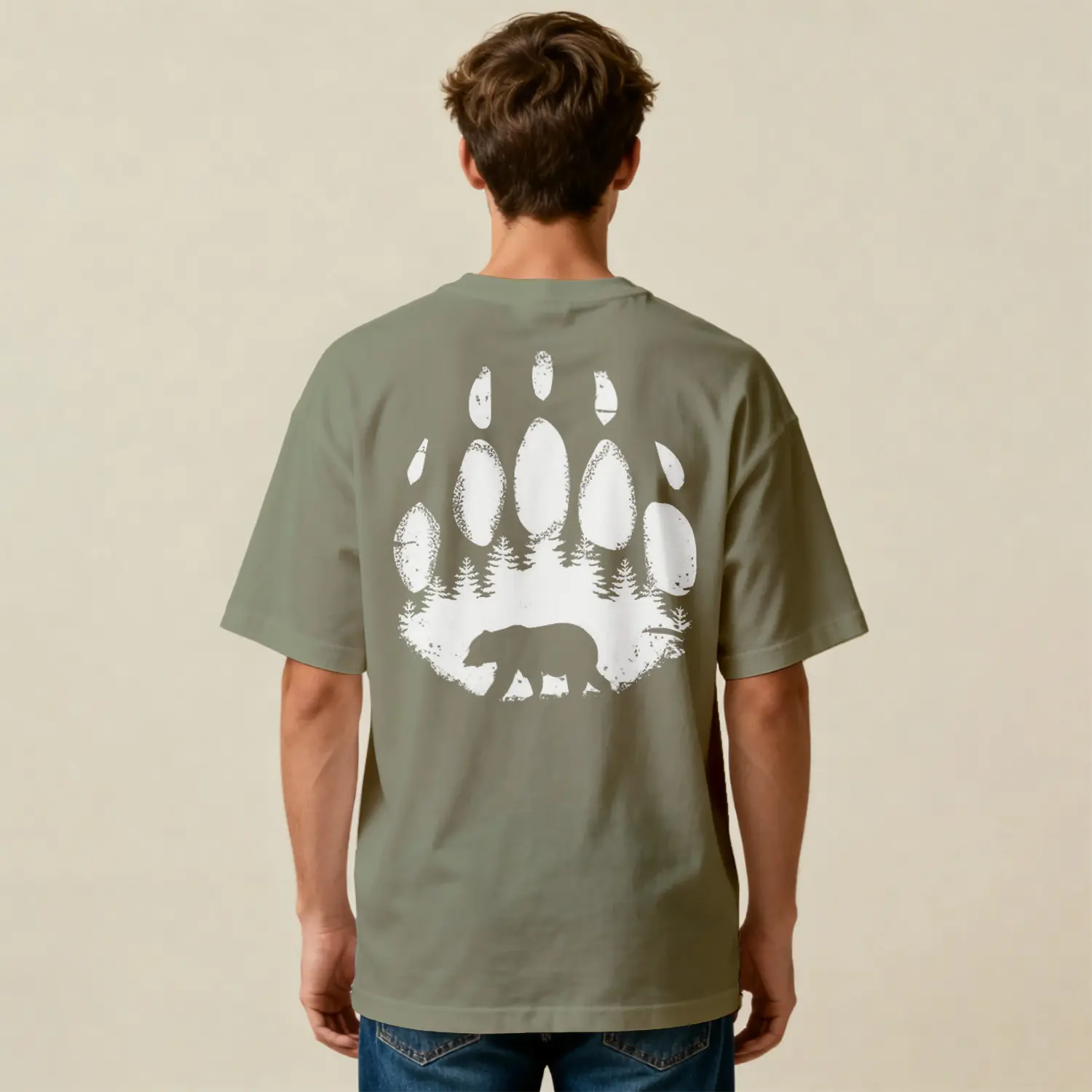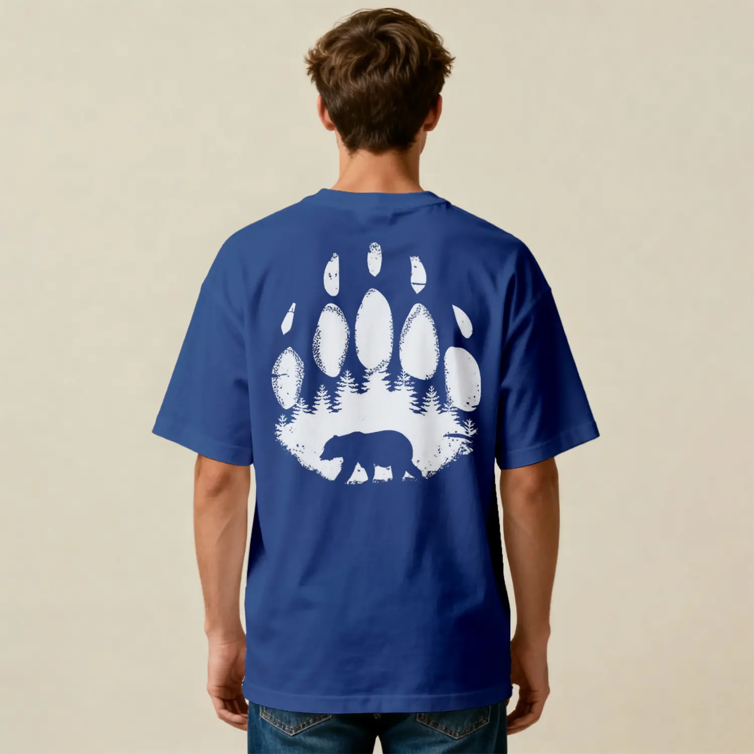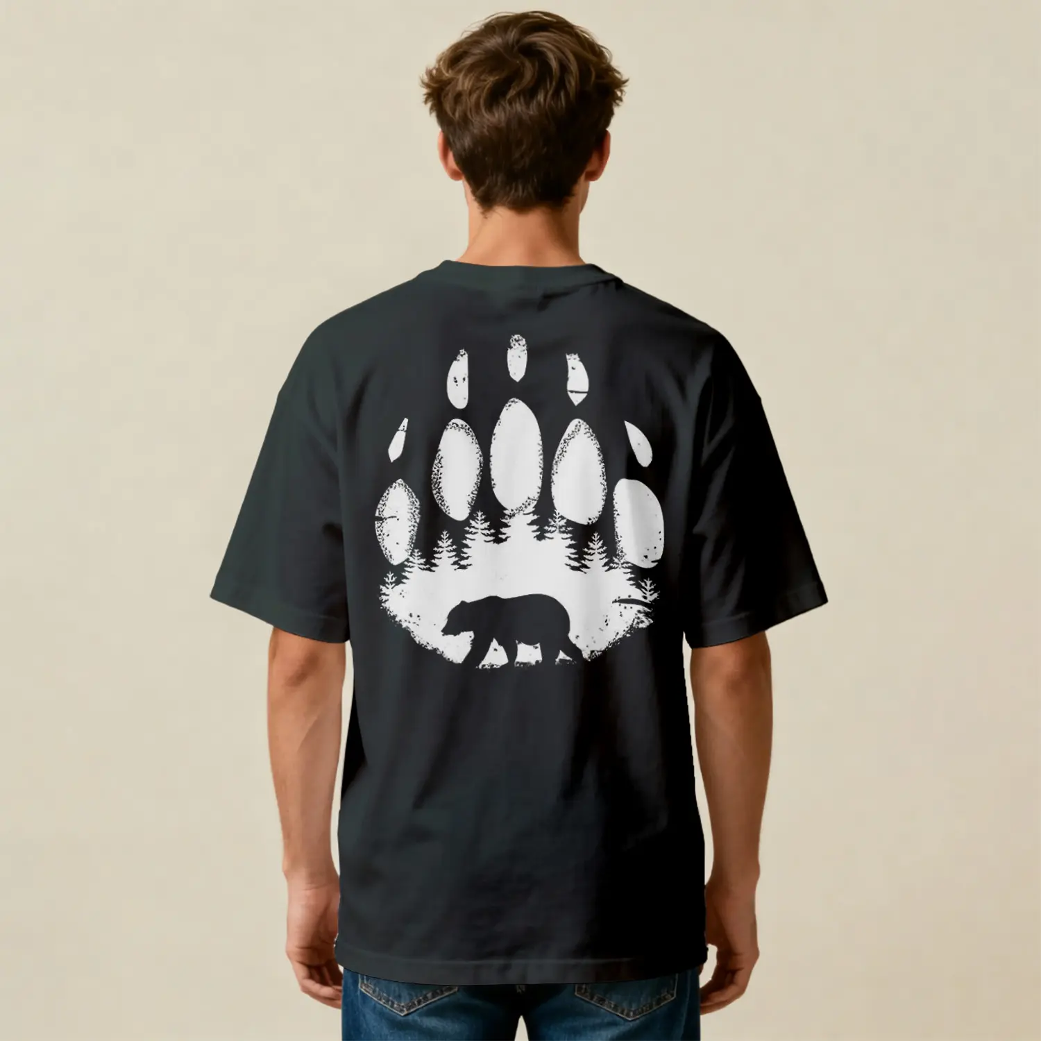 Ayı Ve Orman Desenli Oversize Baskılı Erkek Tişört