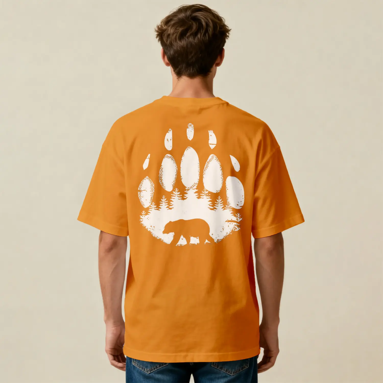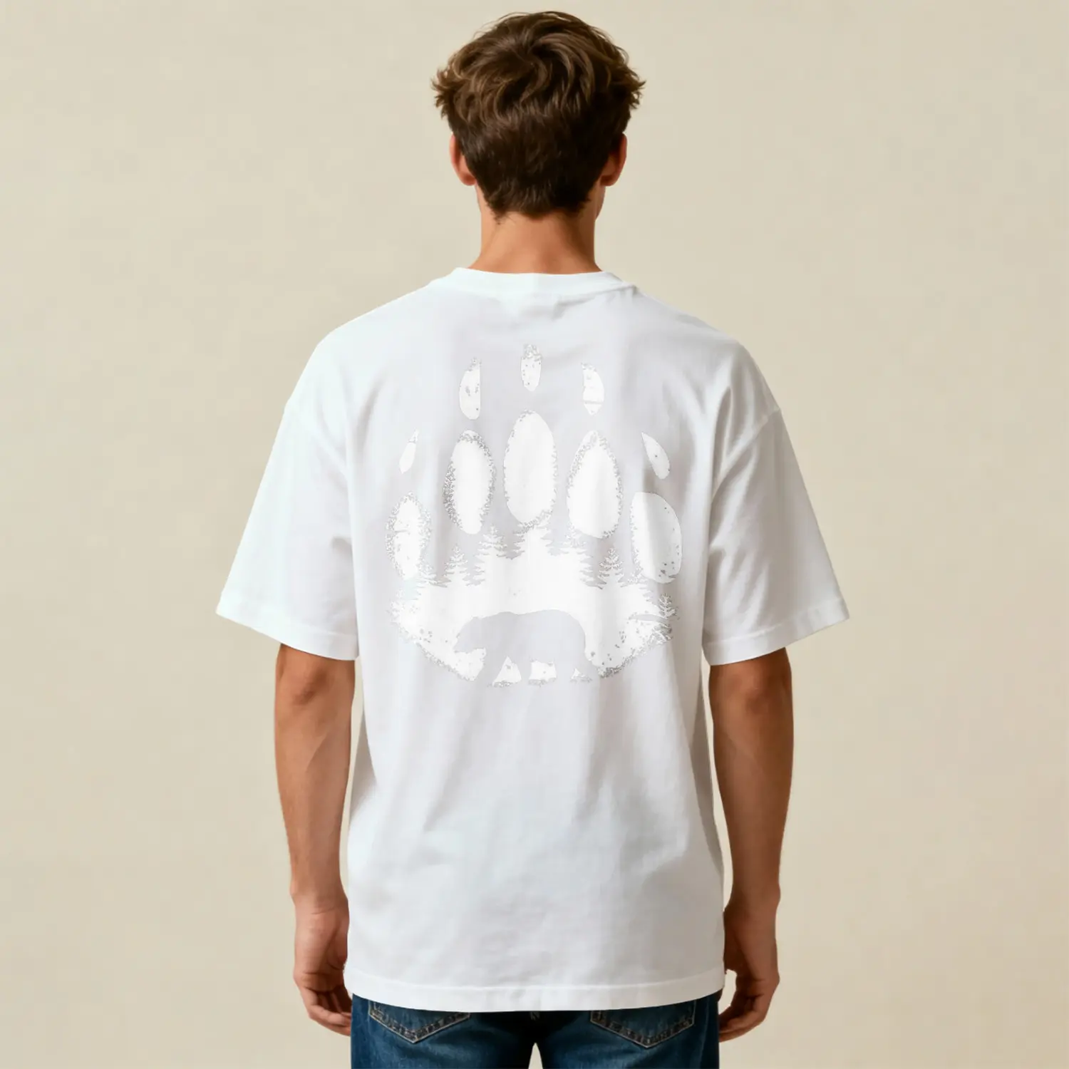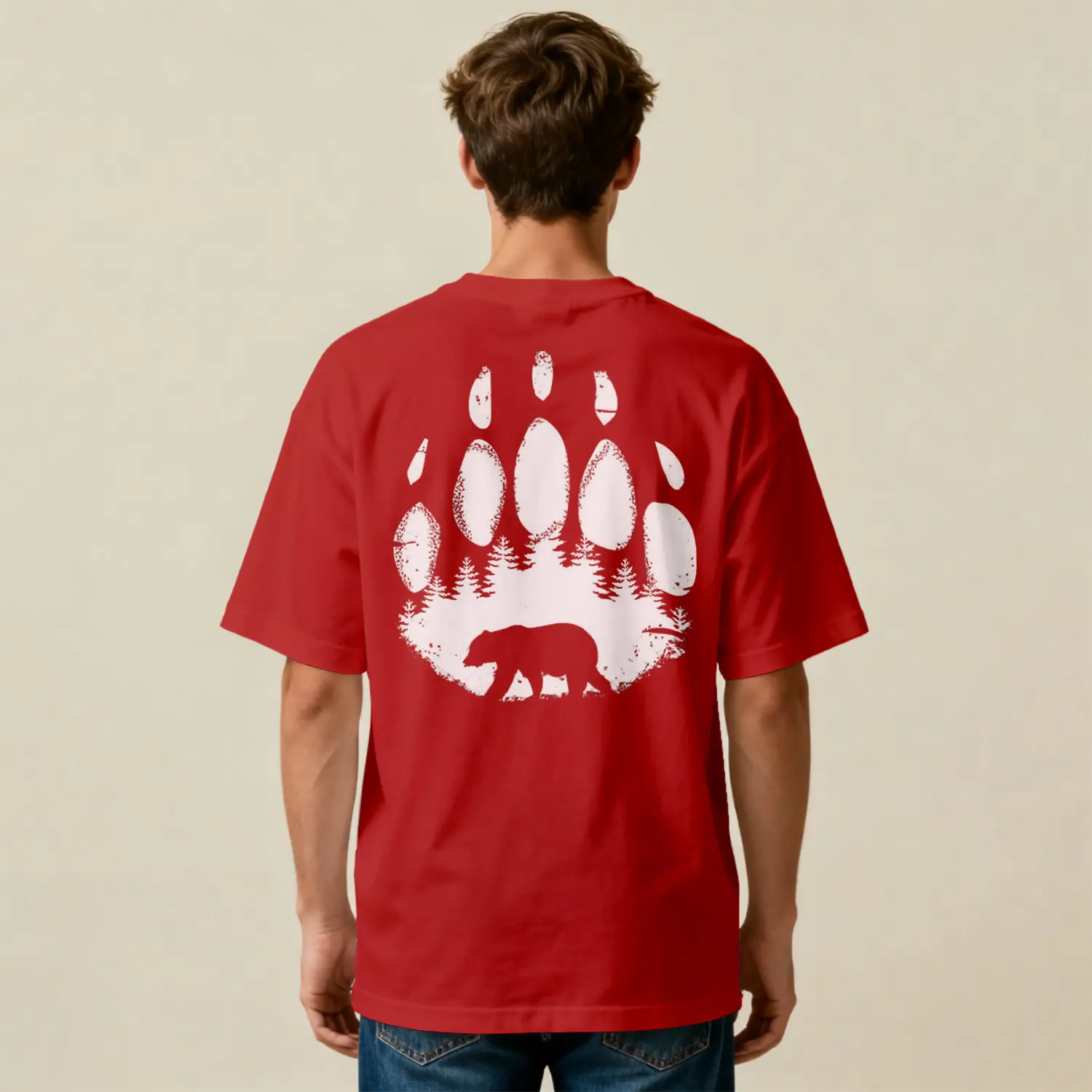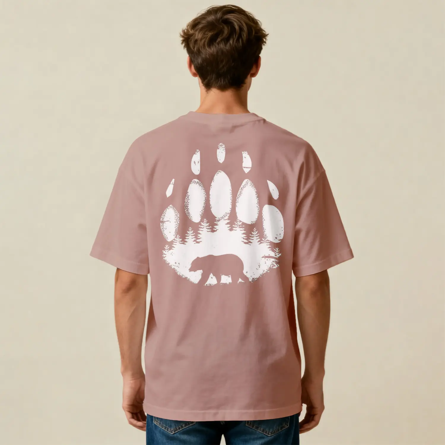 Ayı Ve Orman Desenli Oversize Baskılı Erkek Tişört