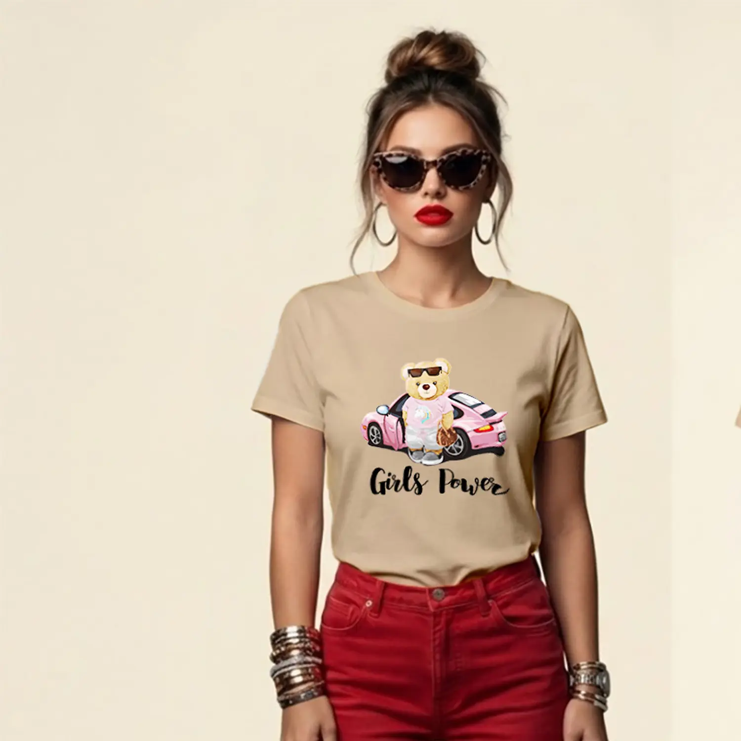 Ayıcık Desenli Girls Power Baskılı Kadın Tişört