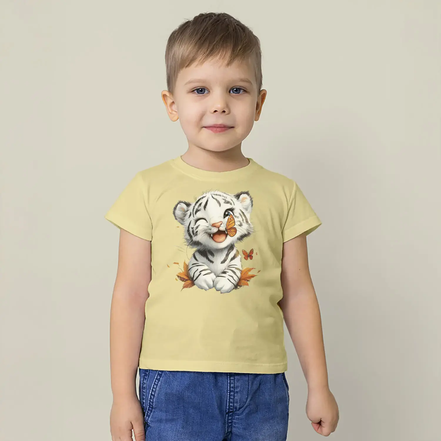 Beyaz Kaplan Yavrusu Kelebek Baskılı Erkek Çocuk Tişörtü