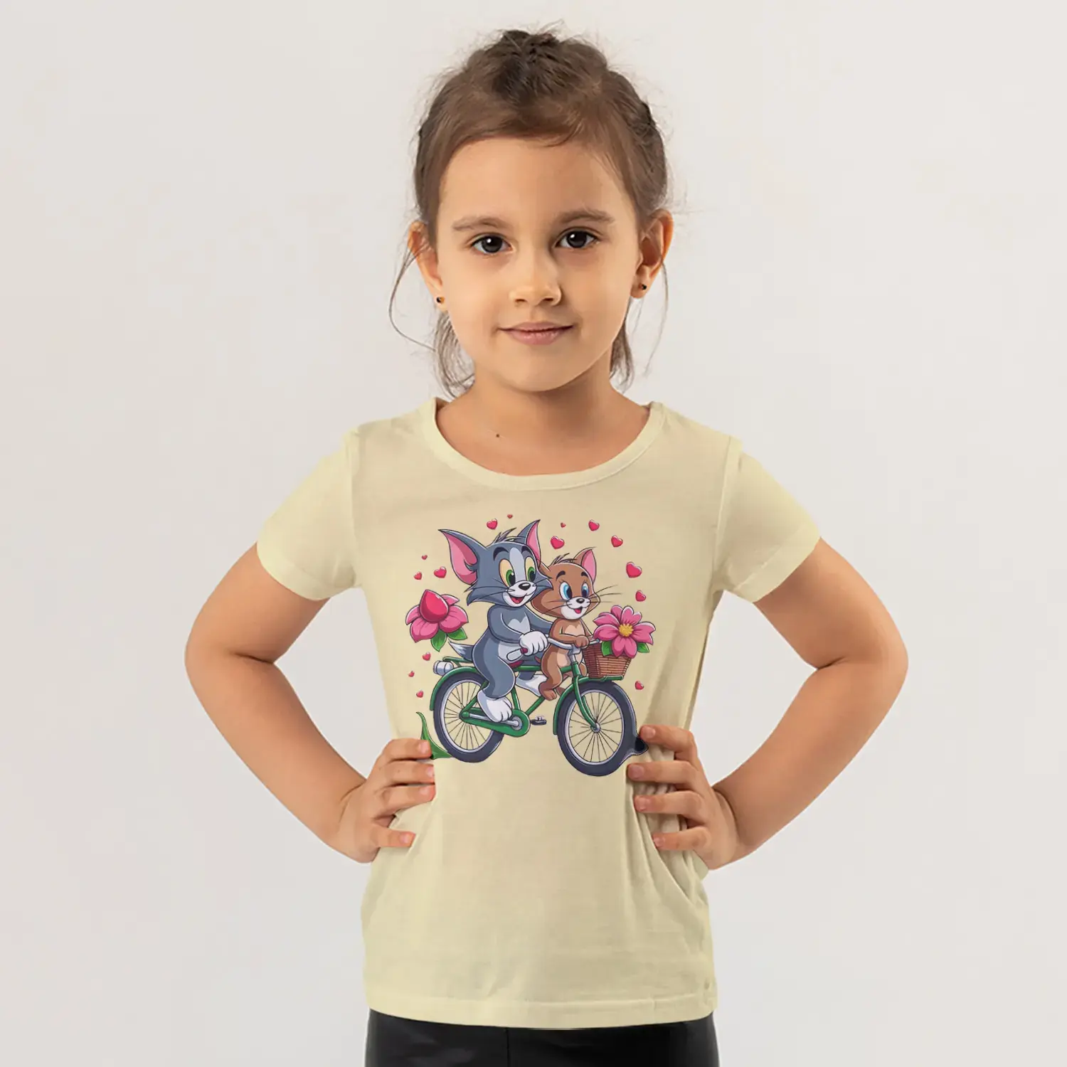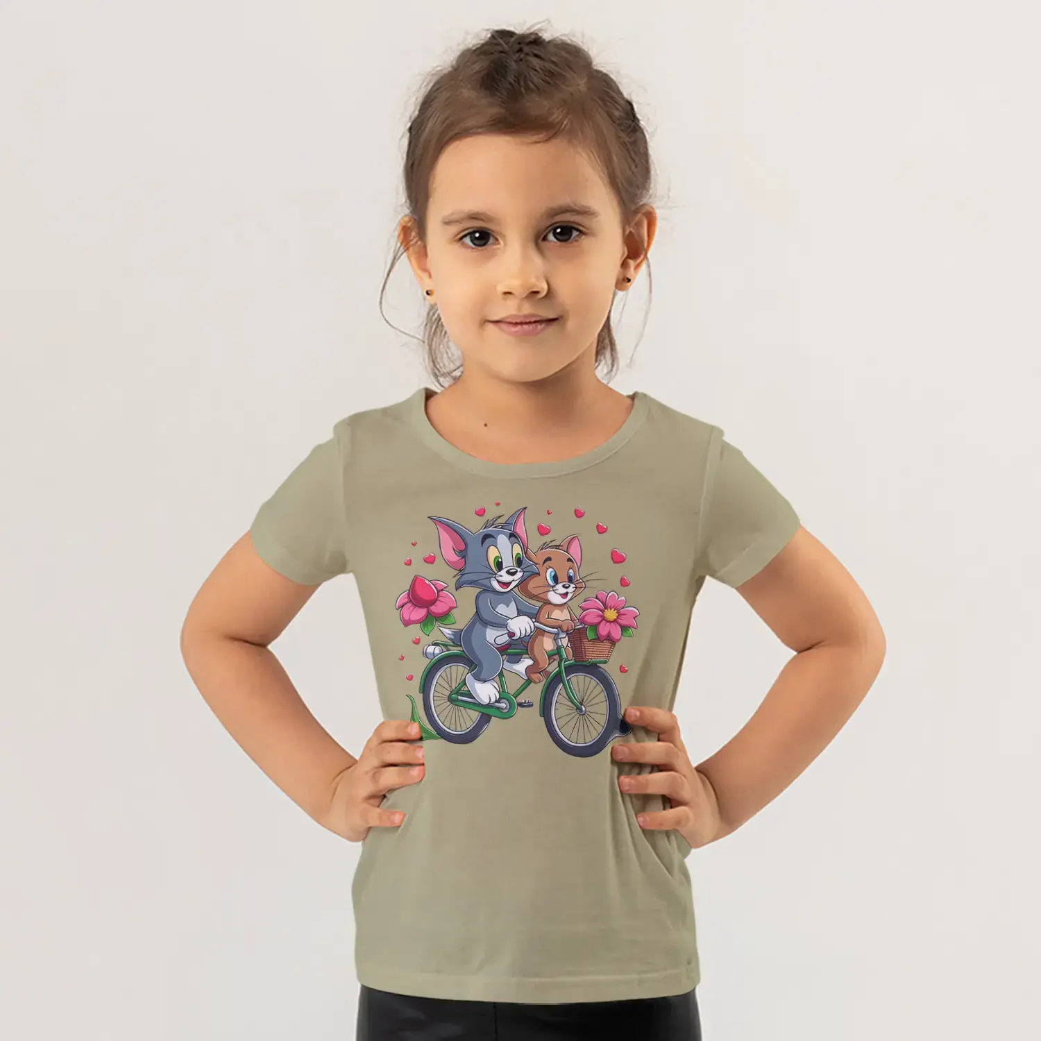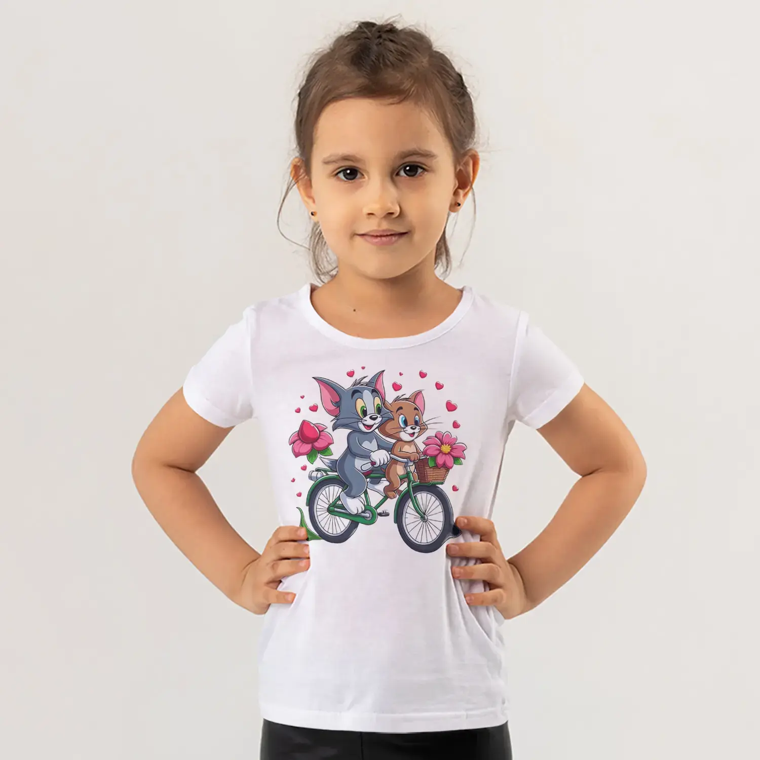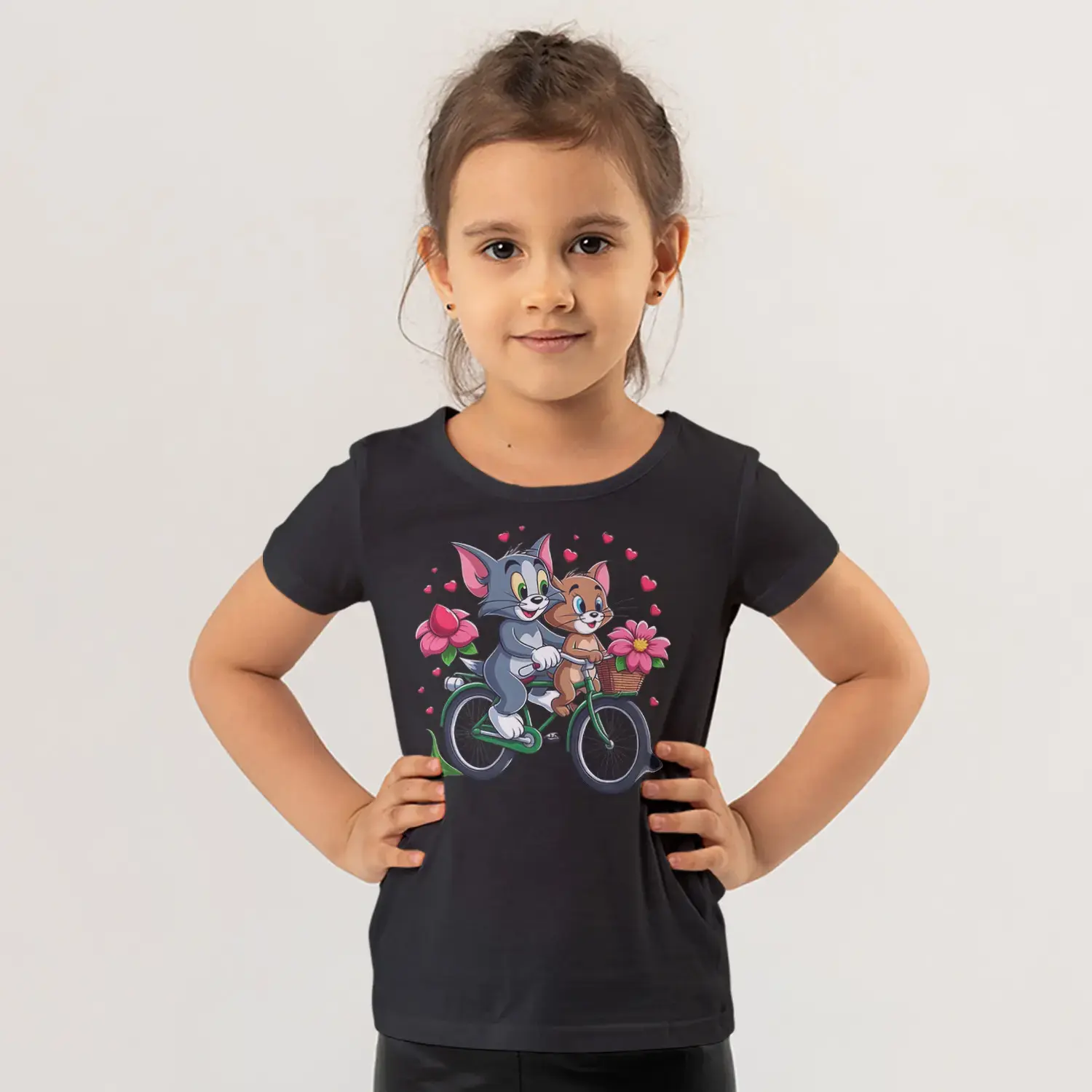 Bisikletli Gri Kedi ve Küçük Fare Çiçekli Kalp Baskılı Kız Çocuk Tişörtü için 10 değerlendirme