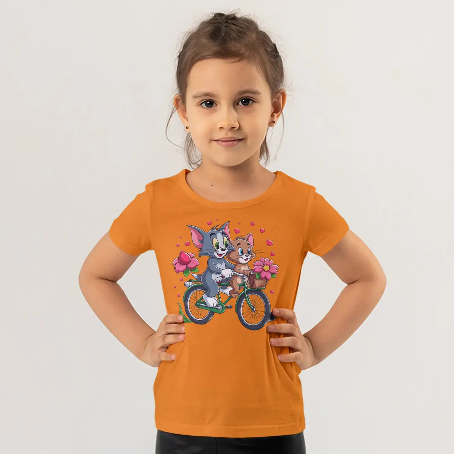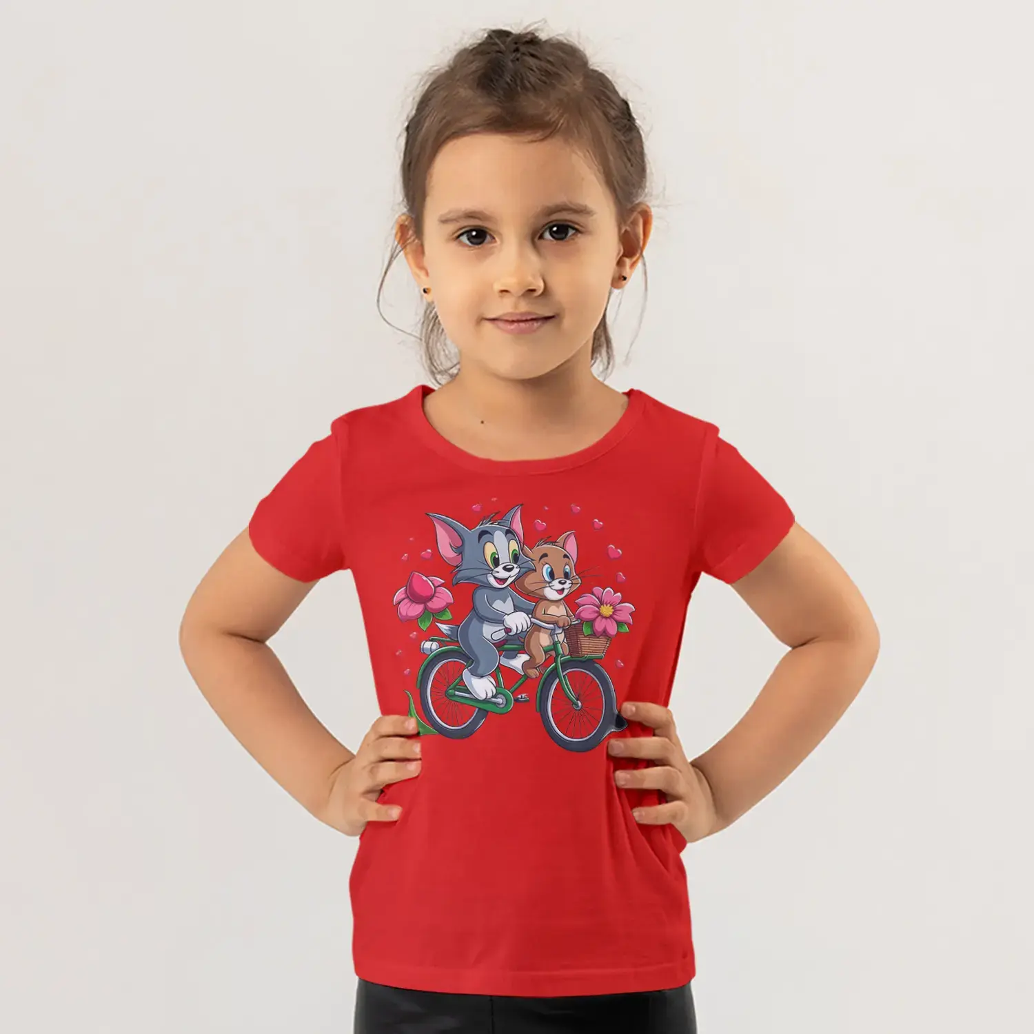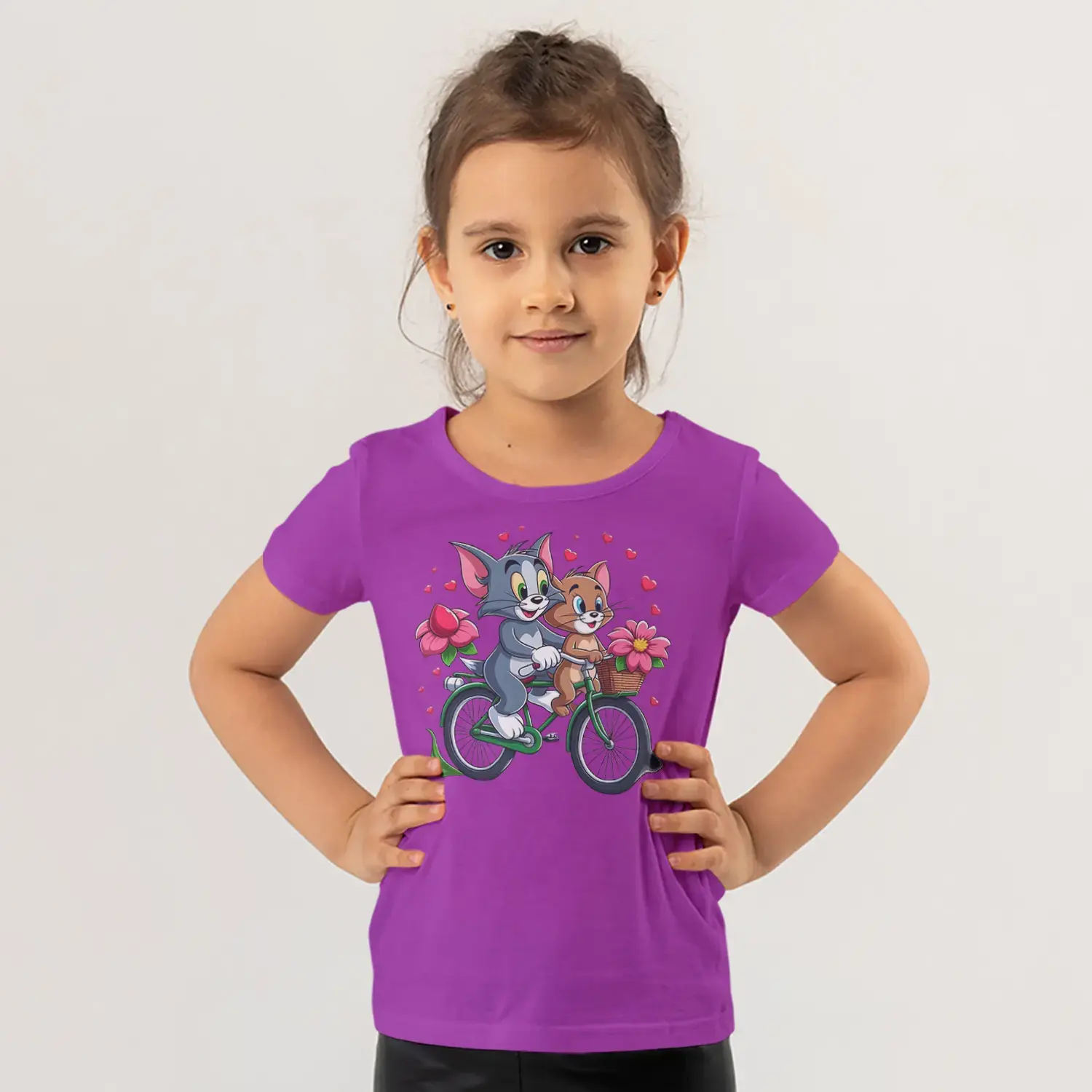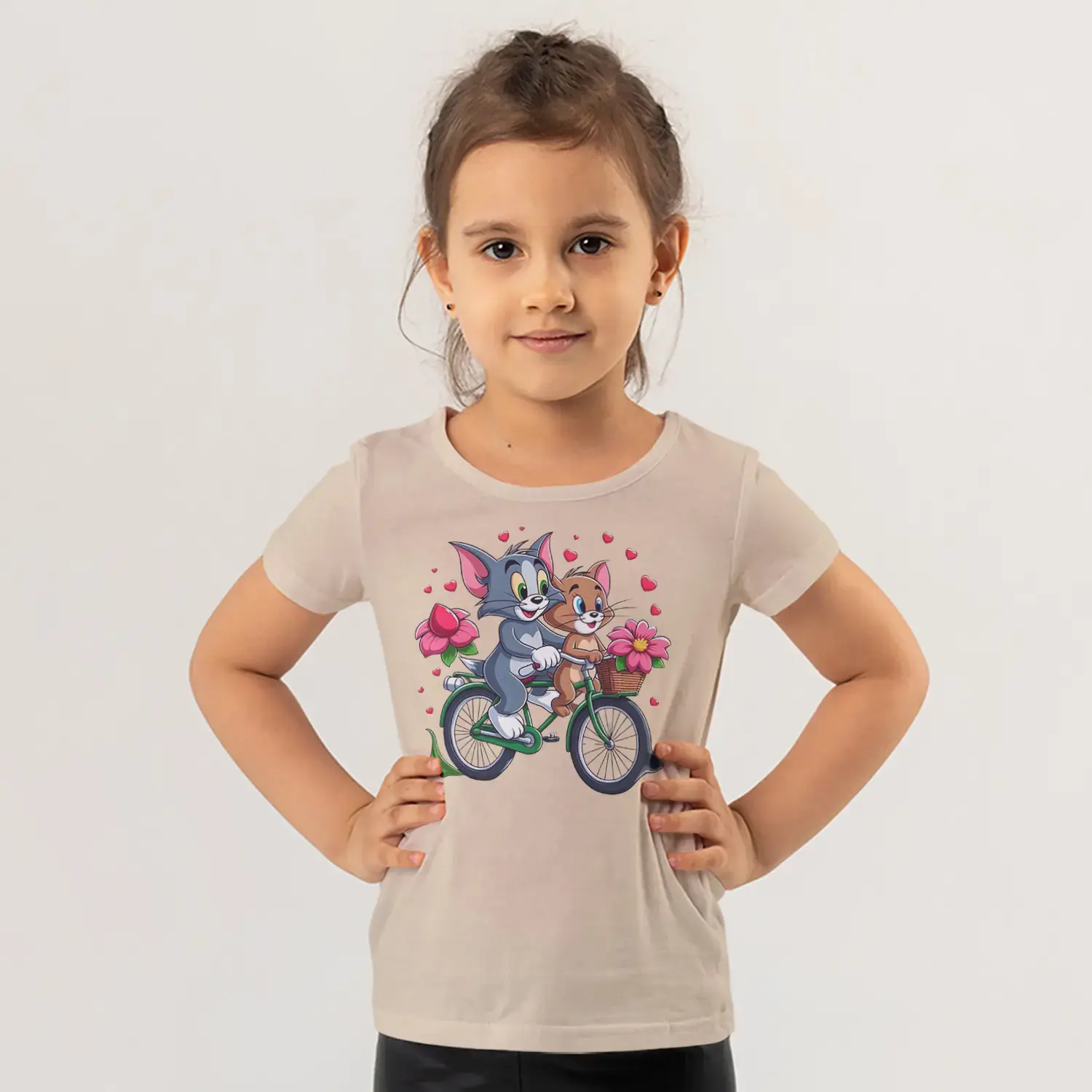 Bisikletli Gri Kedi ve Küçük Fare Çiçekli Kalp Baskılı Kız Çocuk Tişörtü için 10 değerlendirme