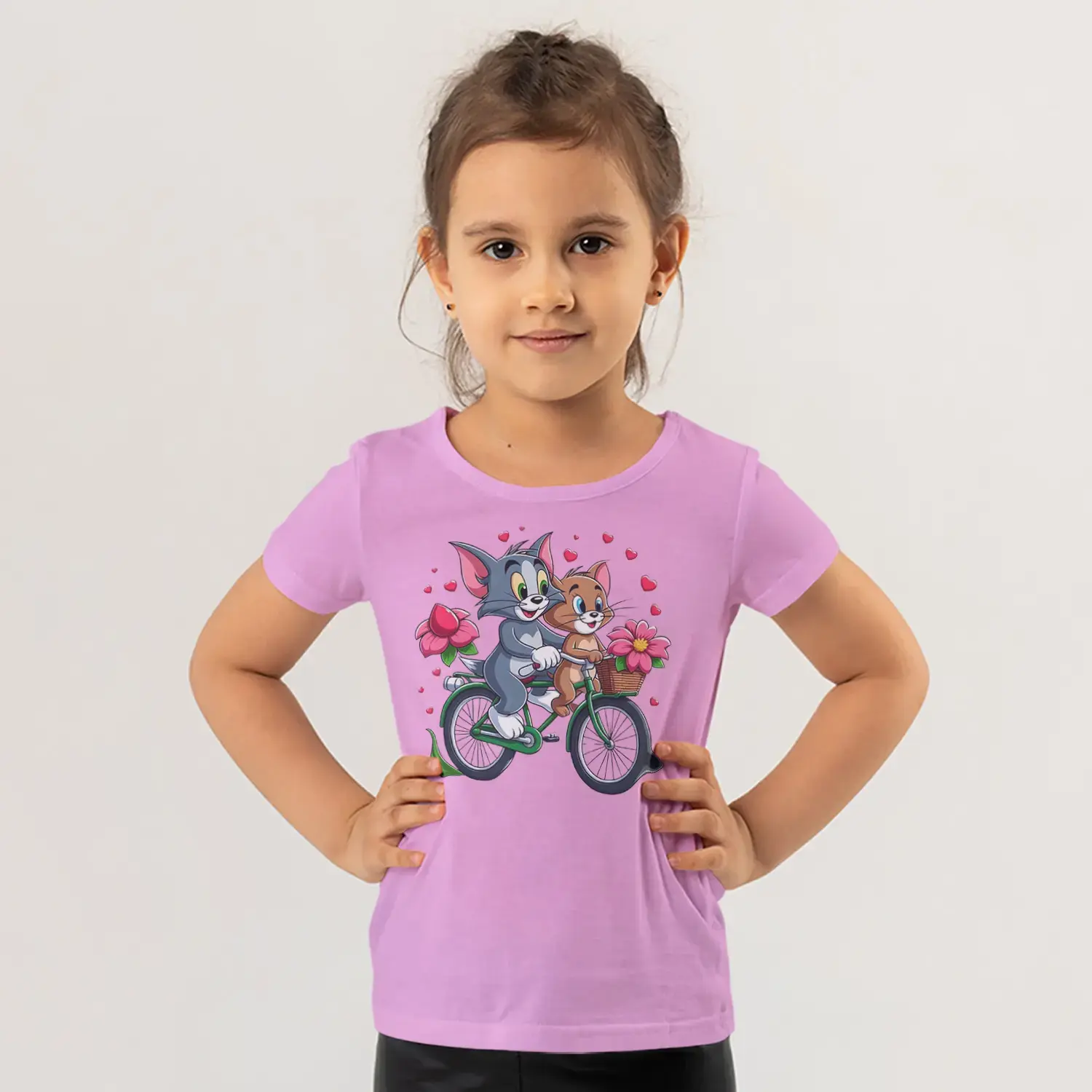 Bisikletli Gri Kedi ve Küçük Fare Çiçekli Kalp Baskılı Kız Çocuk Tişörtü