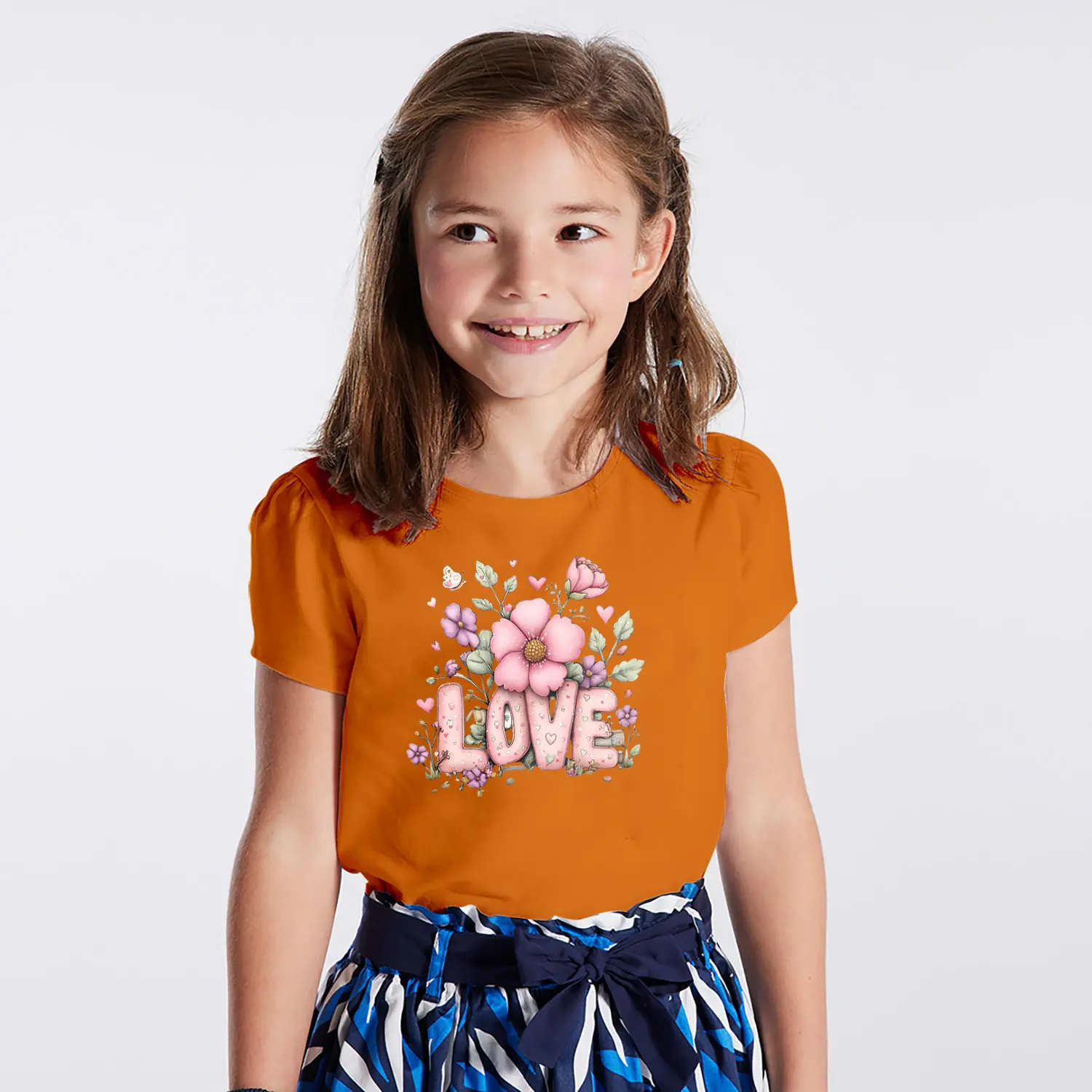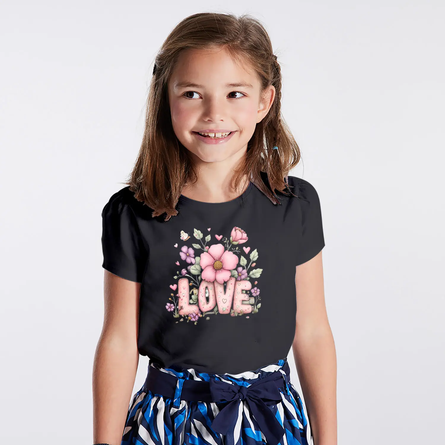 Cicekli Kalpli Love Yazılı Baskılı Kiz Çocuk Tisortu Tişörtü