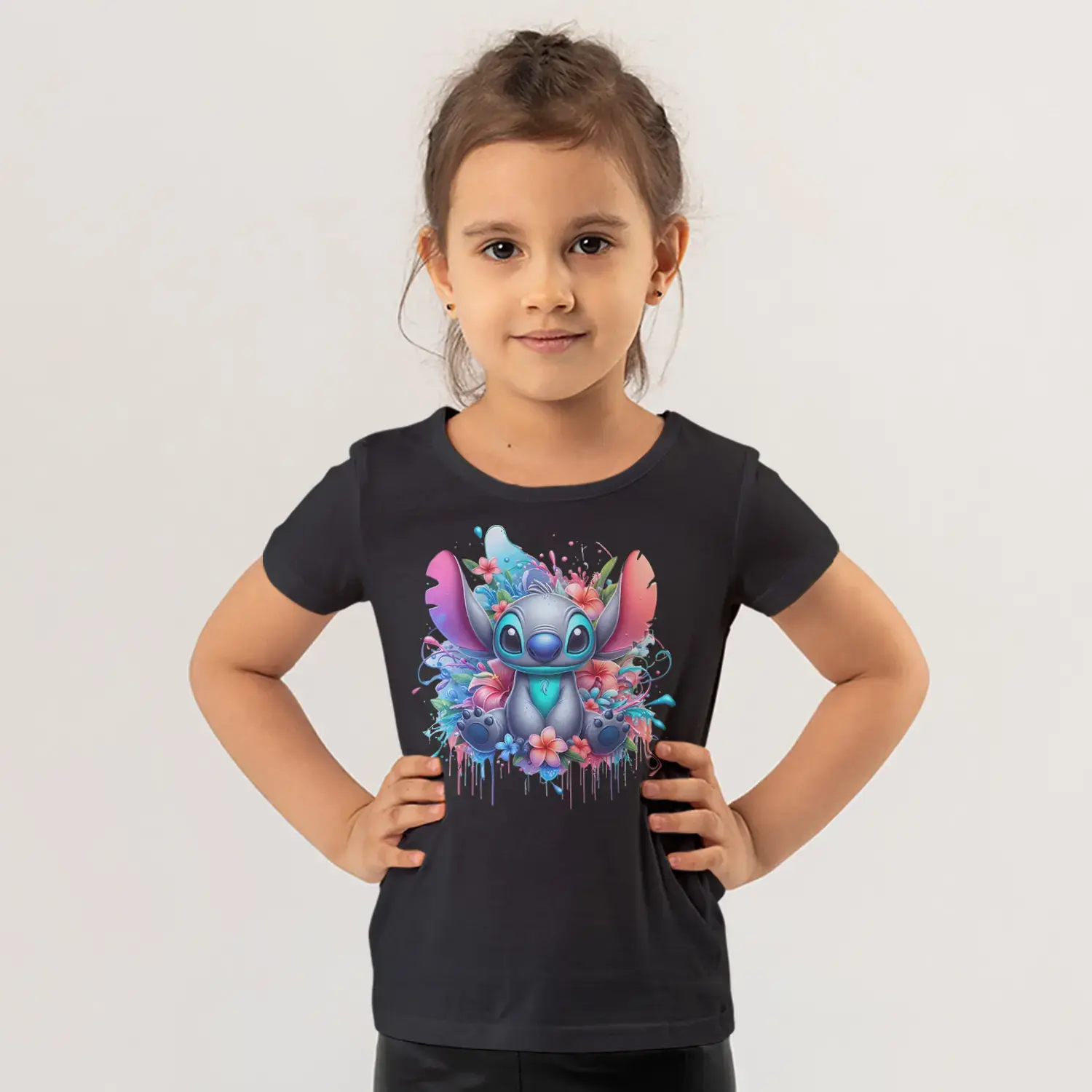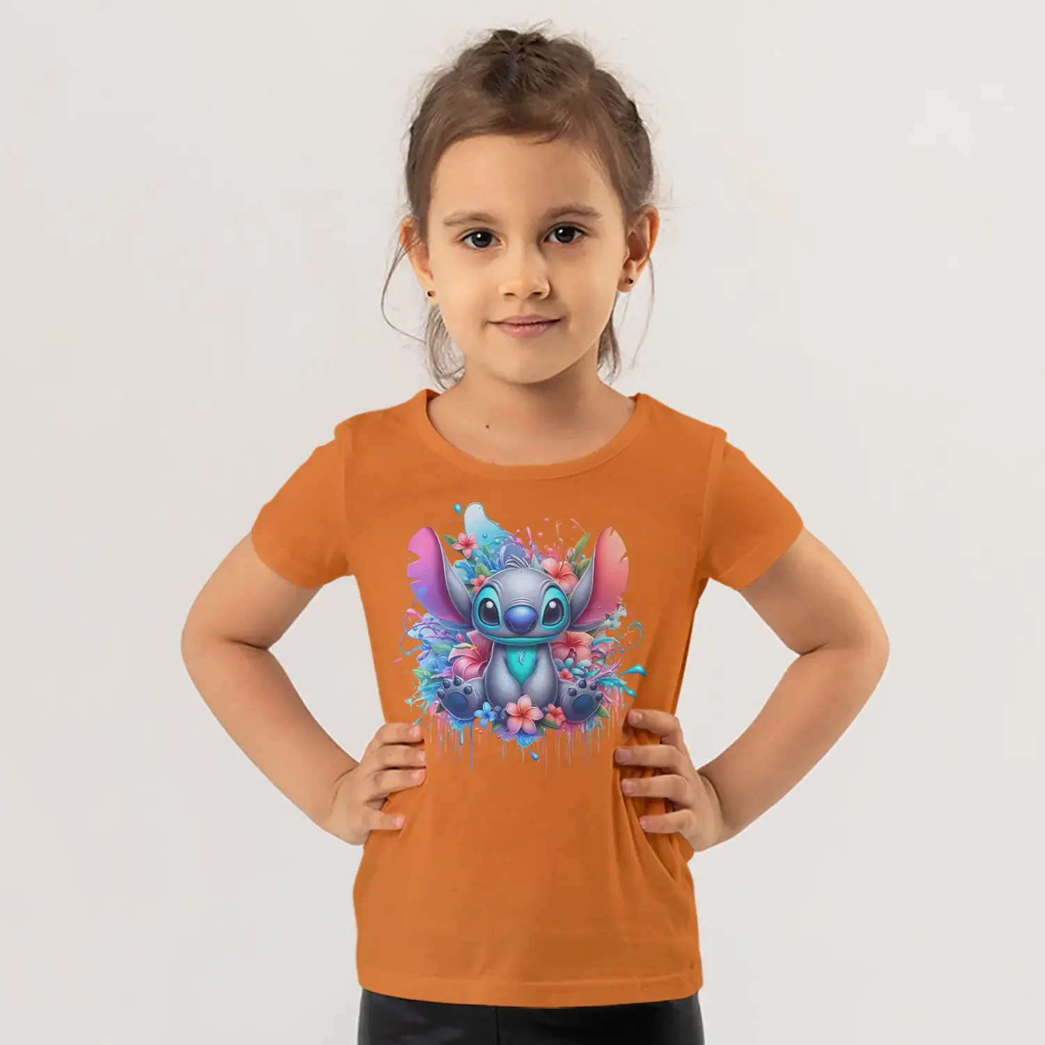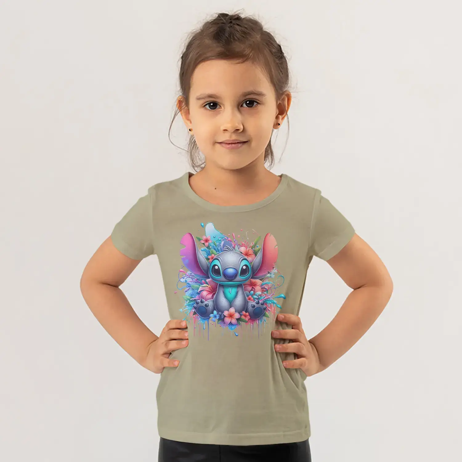 Çiçekli Mavi Büyük Kulaklı Sevimli Uzaylı Yaratık Suluboya Baskılı Kız Çocuk Tişörtü