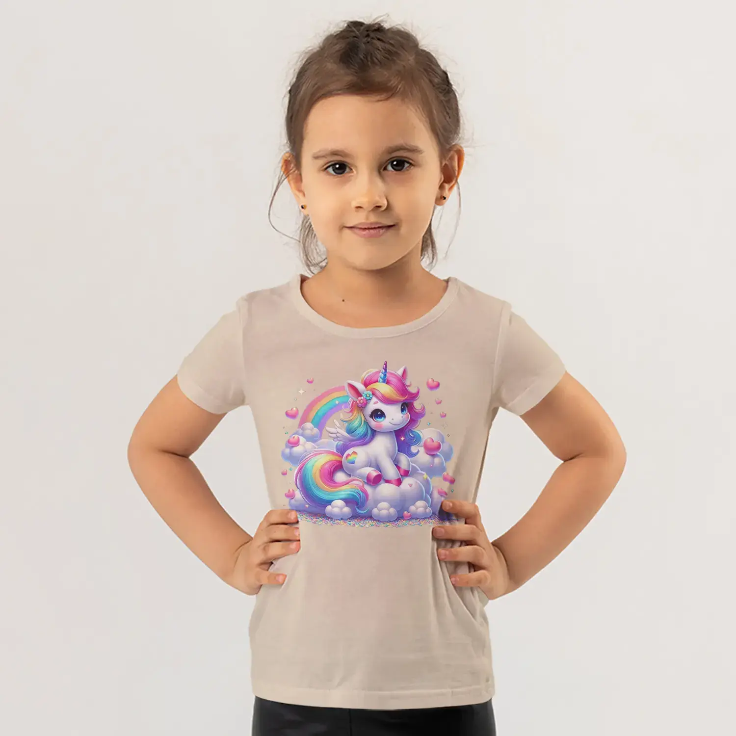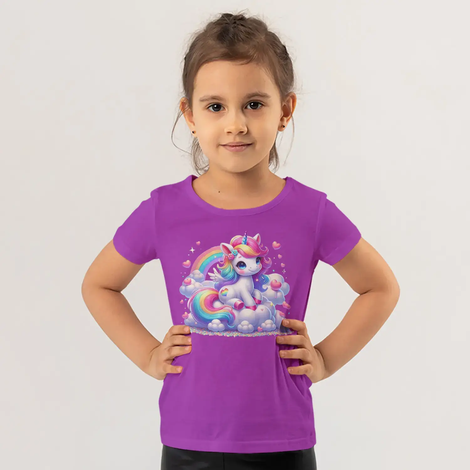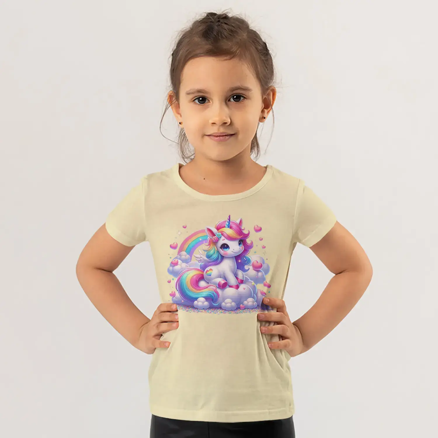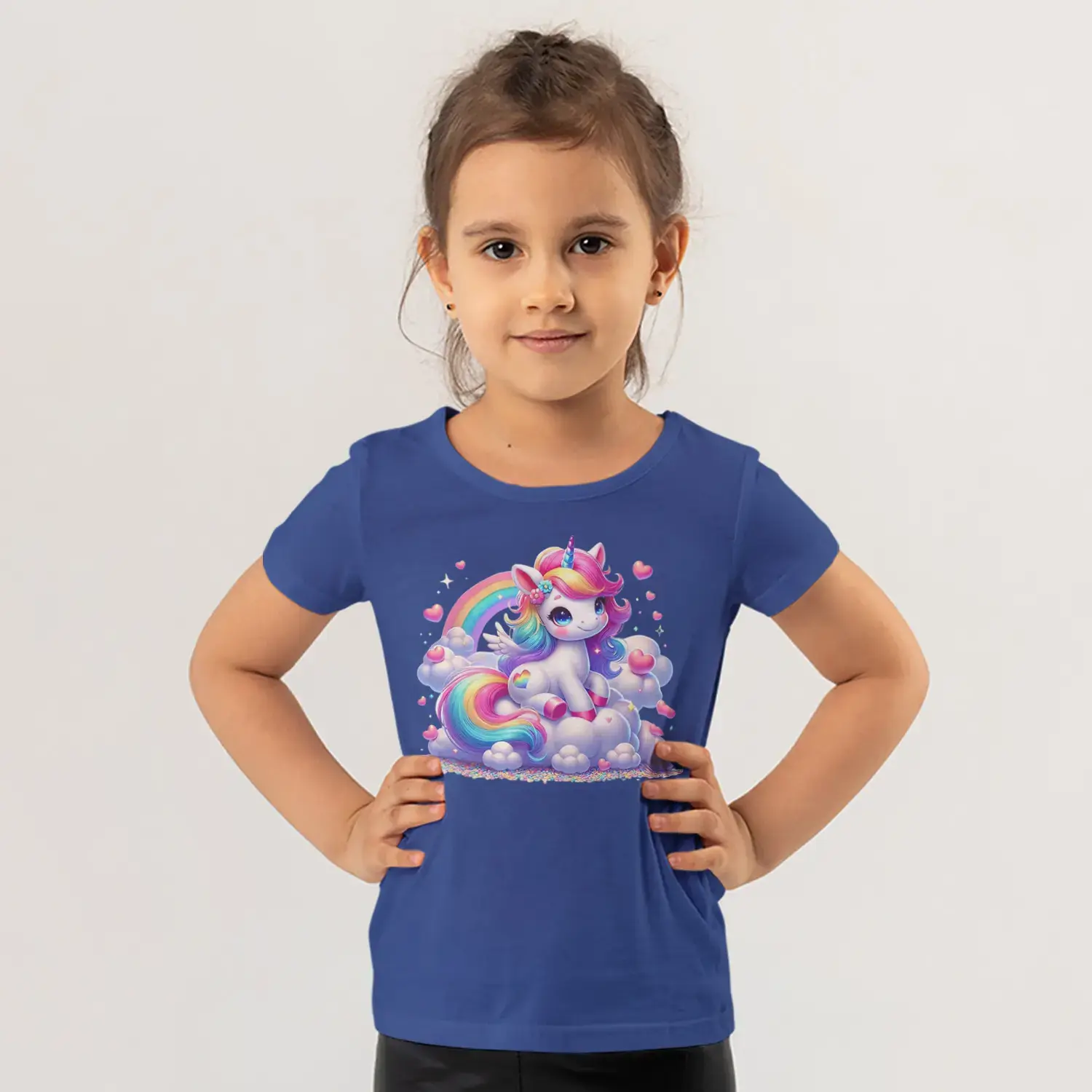 Gökkuşağı Bulutlu Boynuzlu Sevimli Tek Boynuzlu At Kalp Baskılı Kız Çocuk Tişörtü için 10 değerlendirme