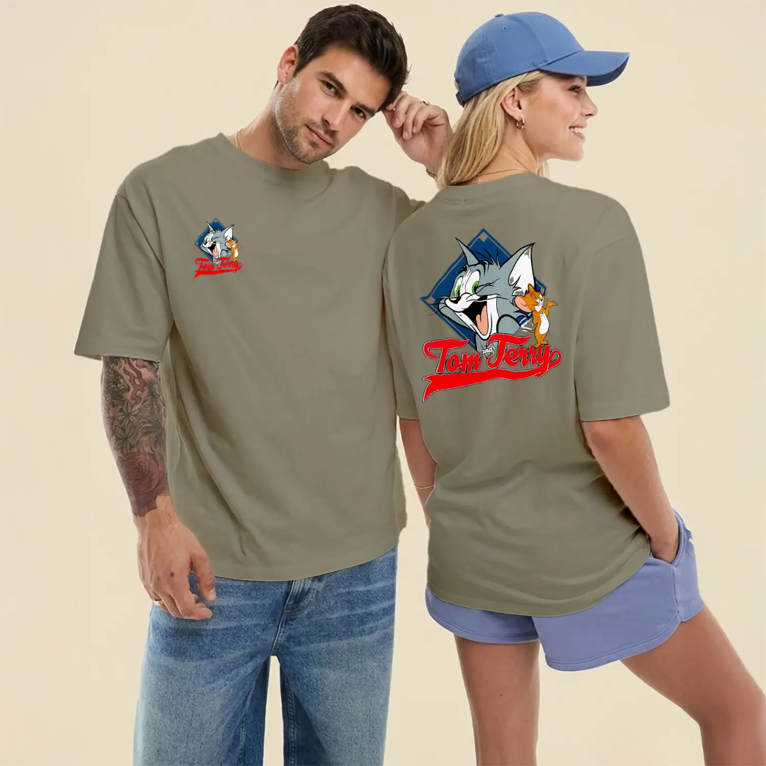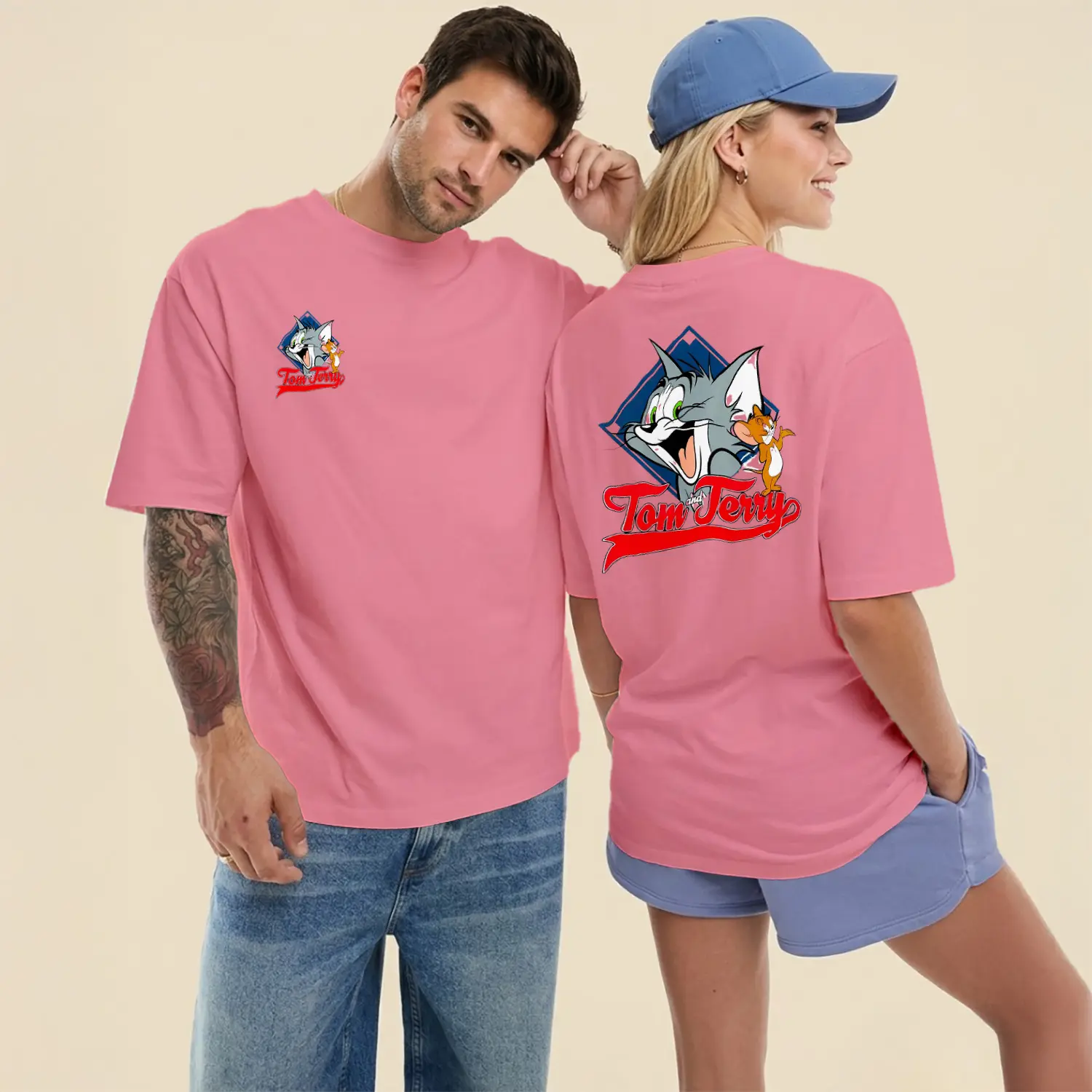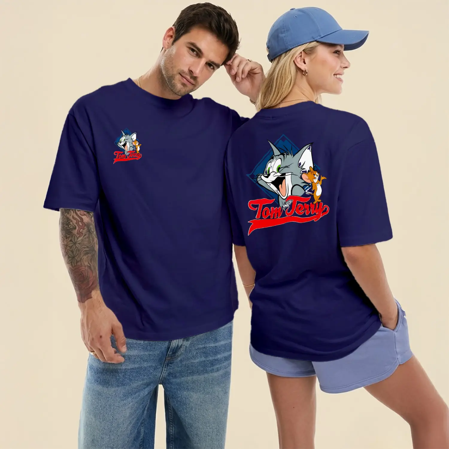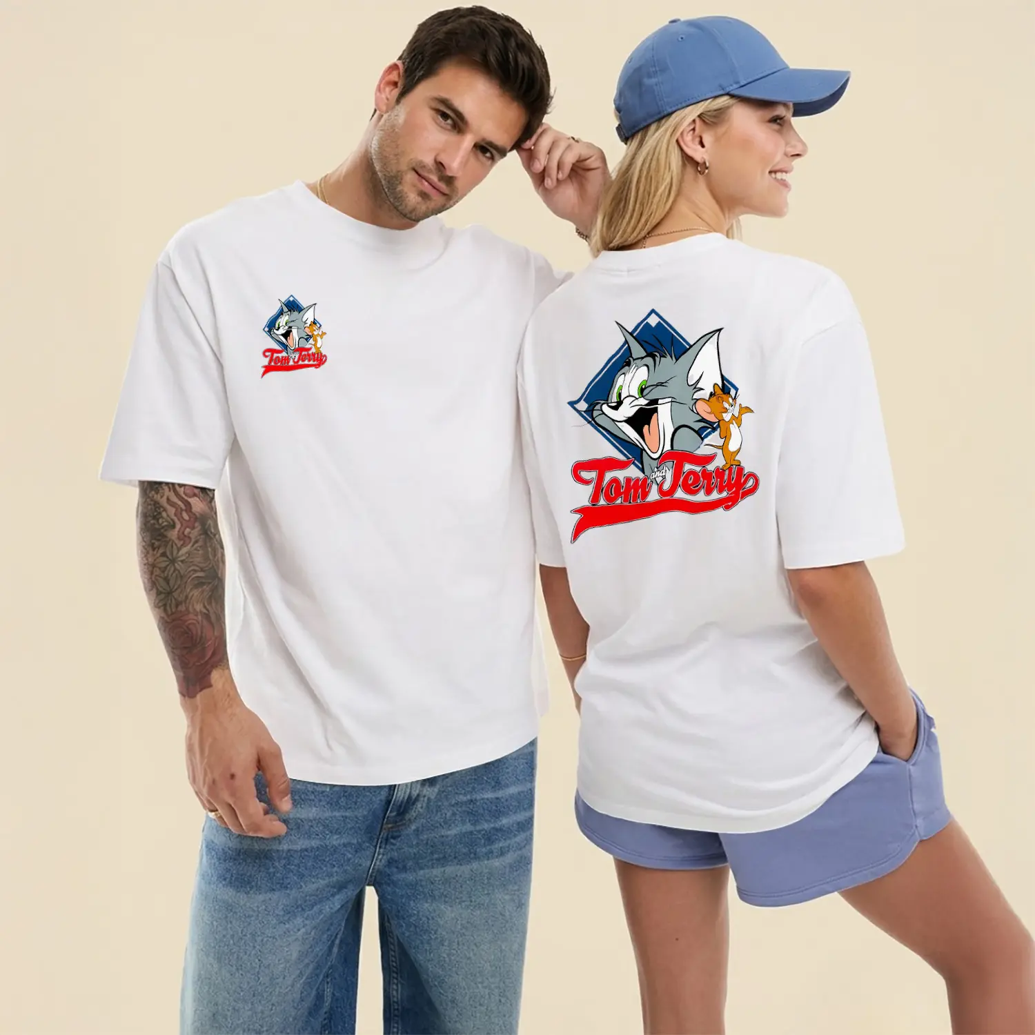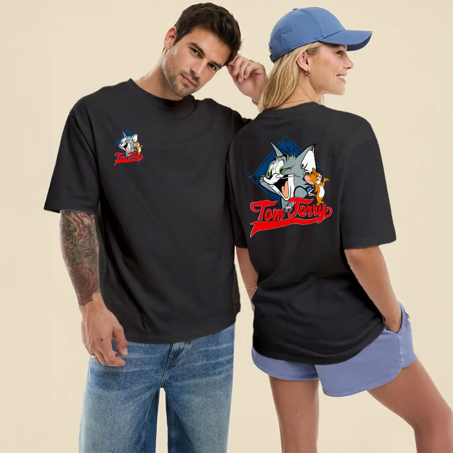 Gülen Kedi ve Fare Karikatür Figürlü Ön Arka Baskılı Unisex Tişört için 8 değerlendirme