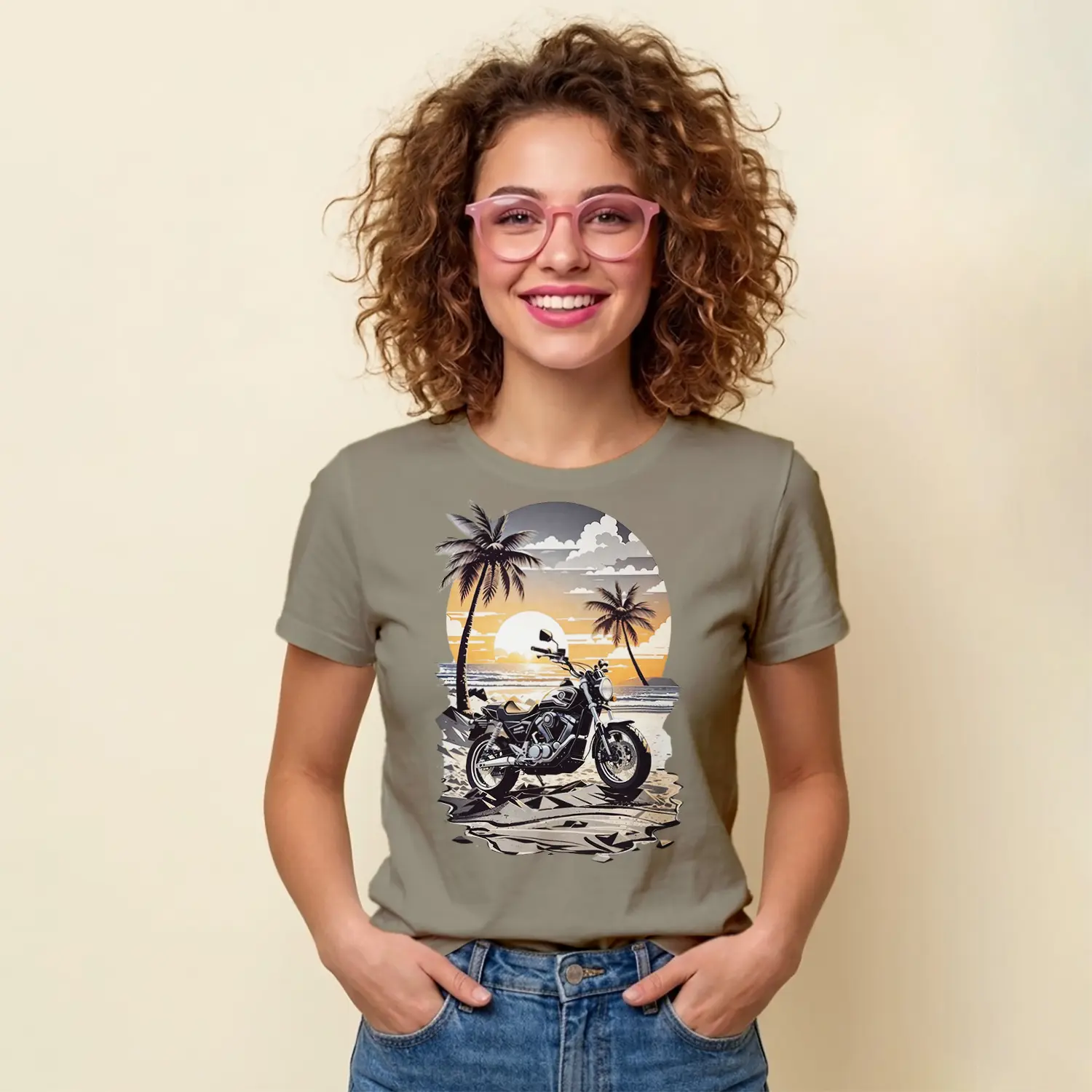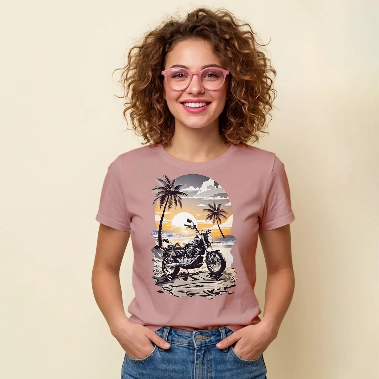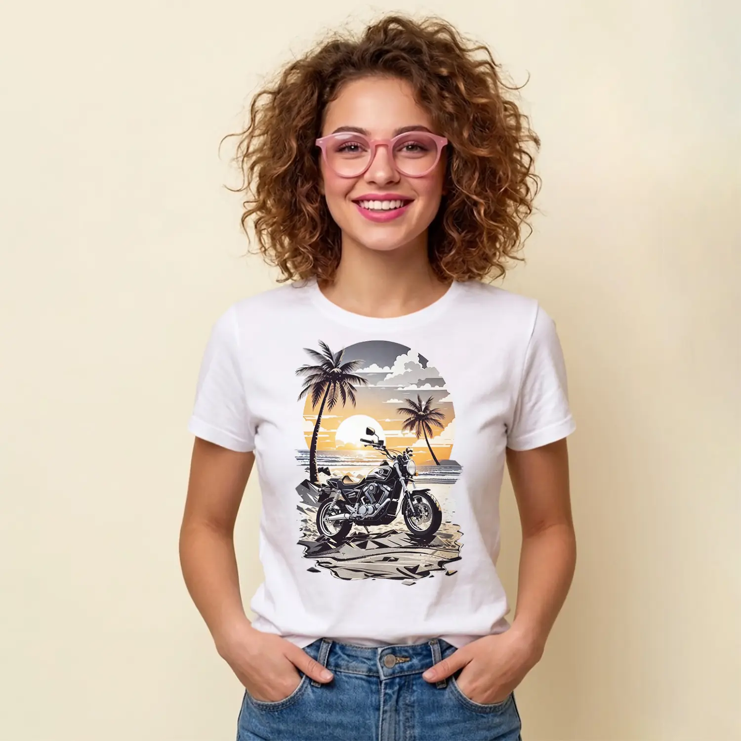 Gün Batımı Palmiye Ve Motosiklet Baskılı Kadın Tişört