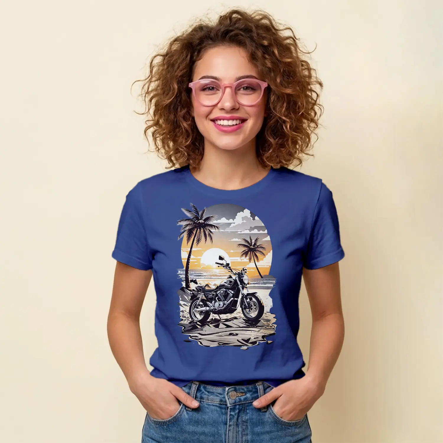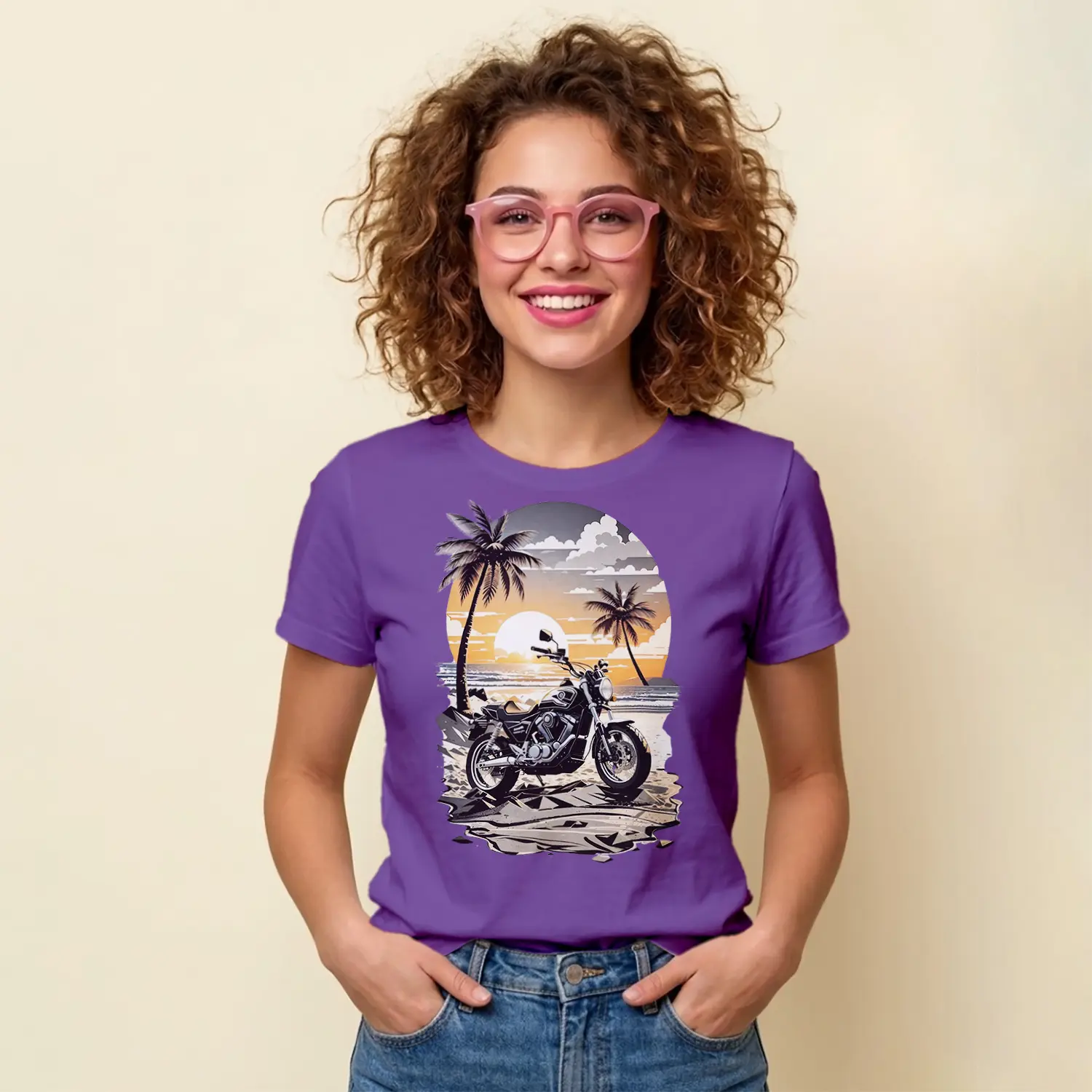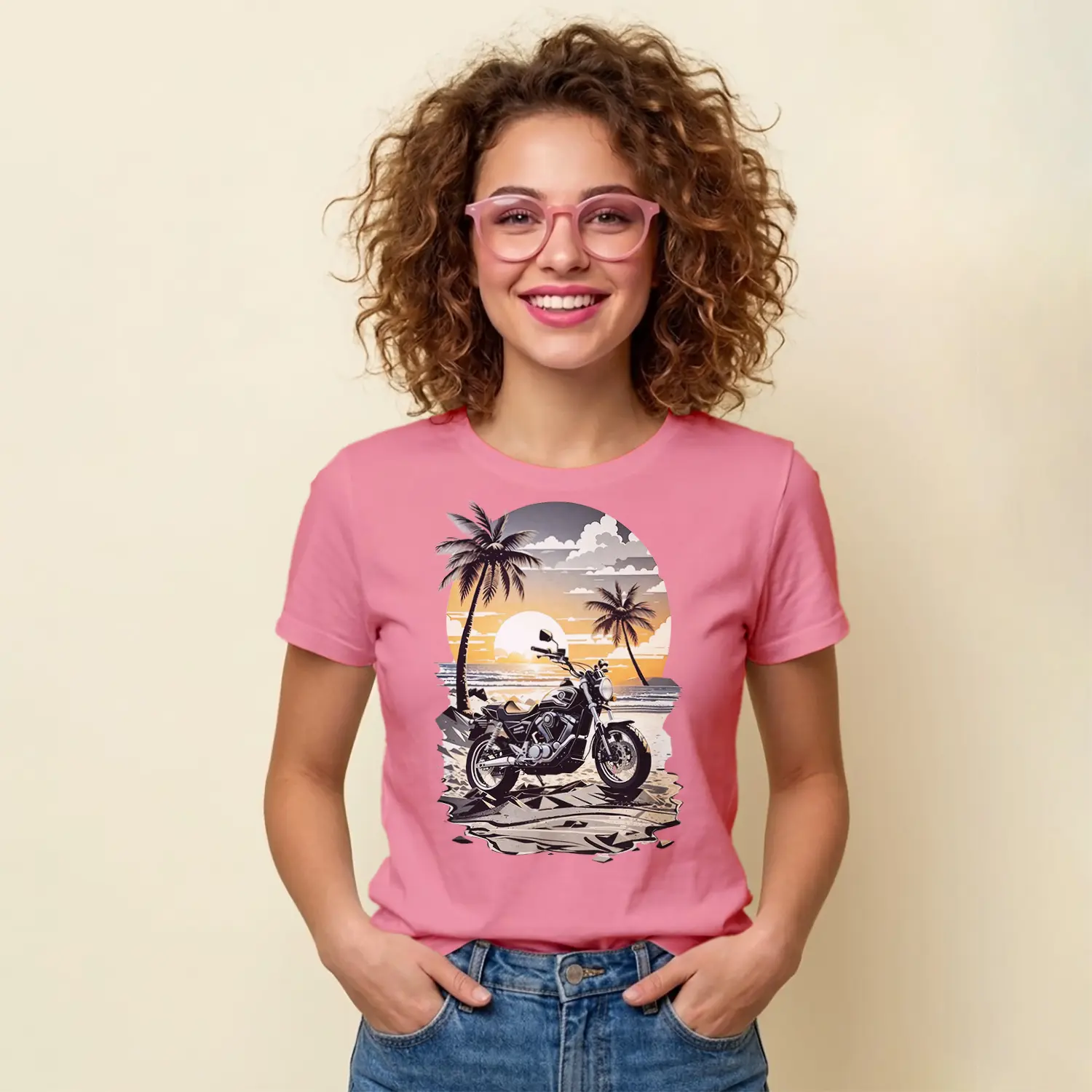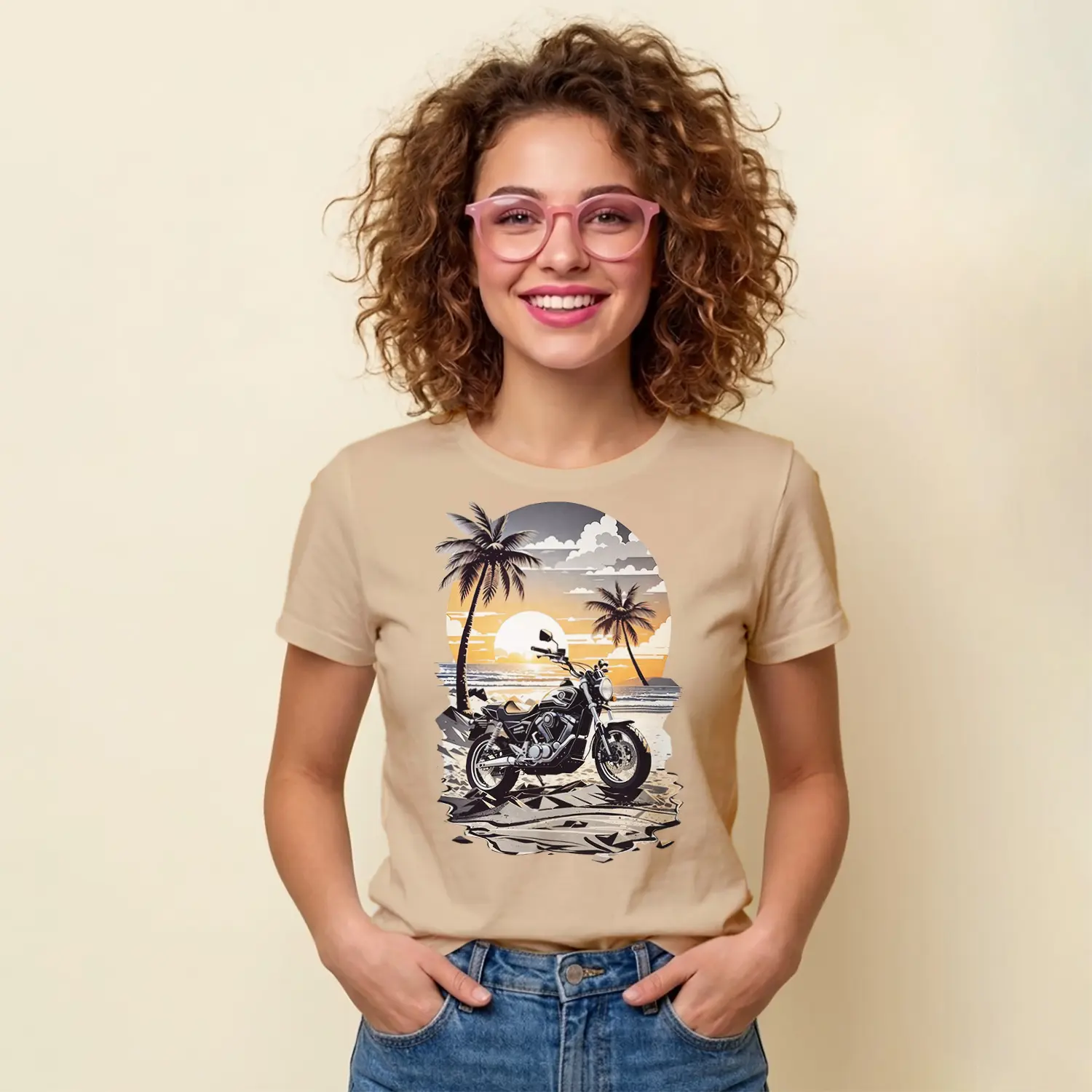 Gün Batımı Palmiye Ve Motosiklet Baskılı Kadın Tişört