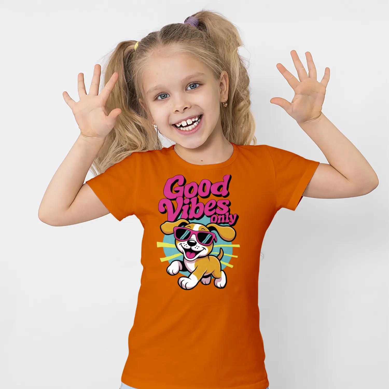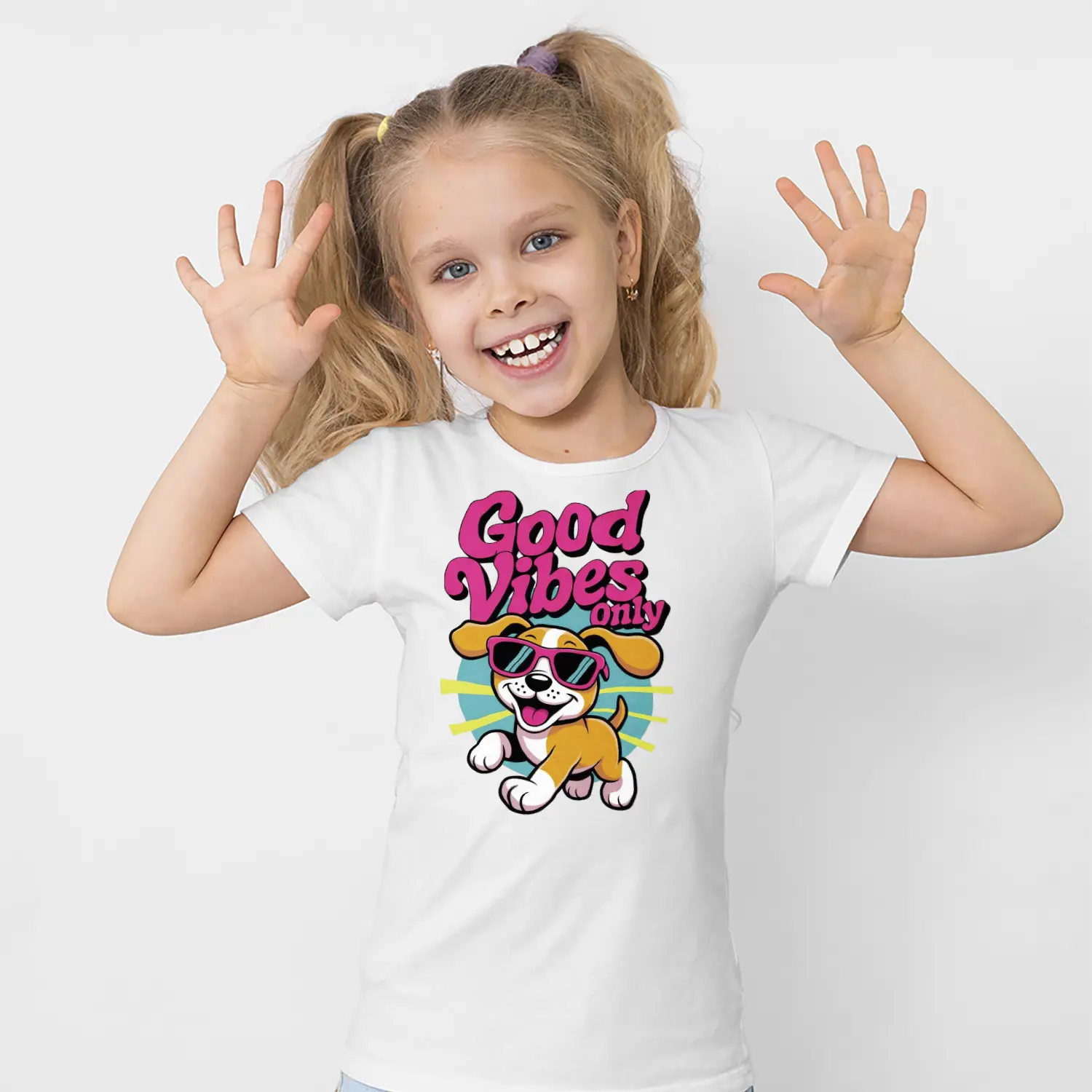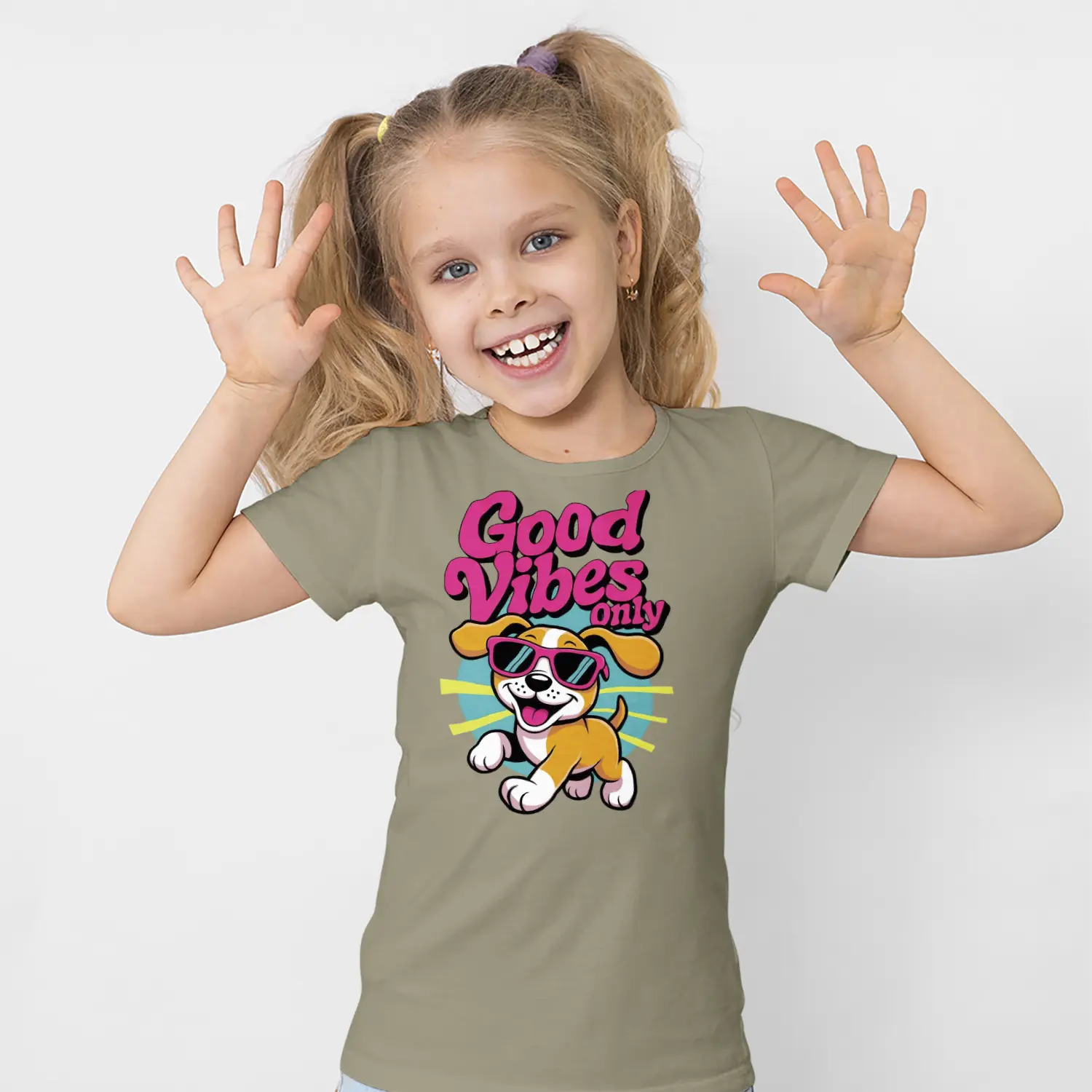 Güneş Gözlüklü Yavru Köpek Good Vibes Only Yazılı Baskılı Kız Çocuk Tişörtü