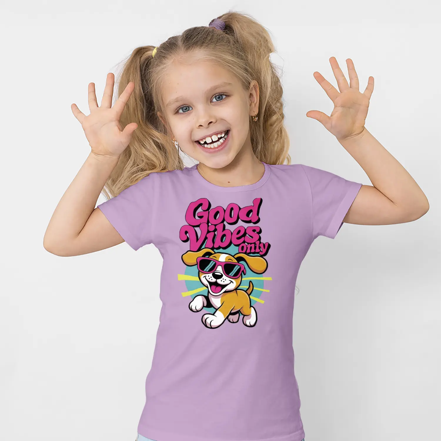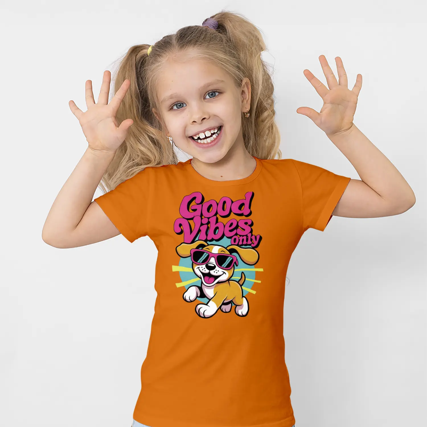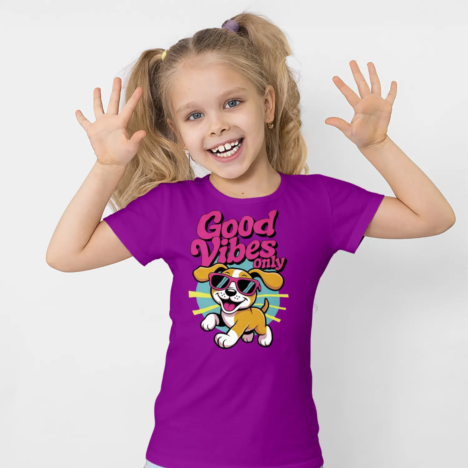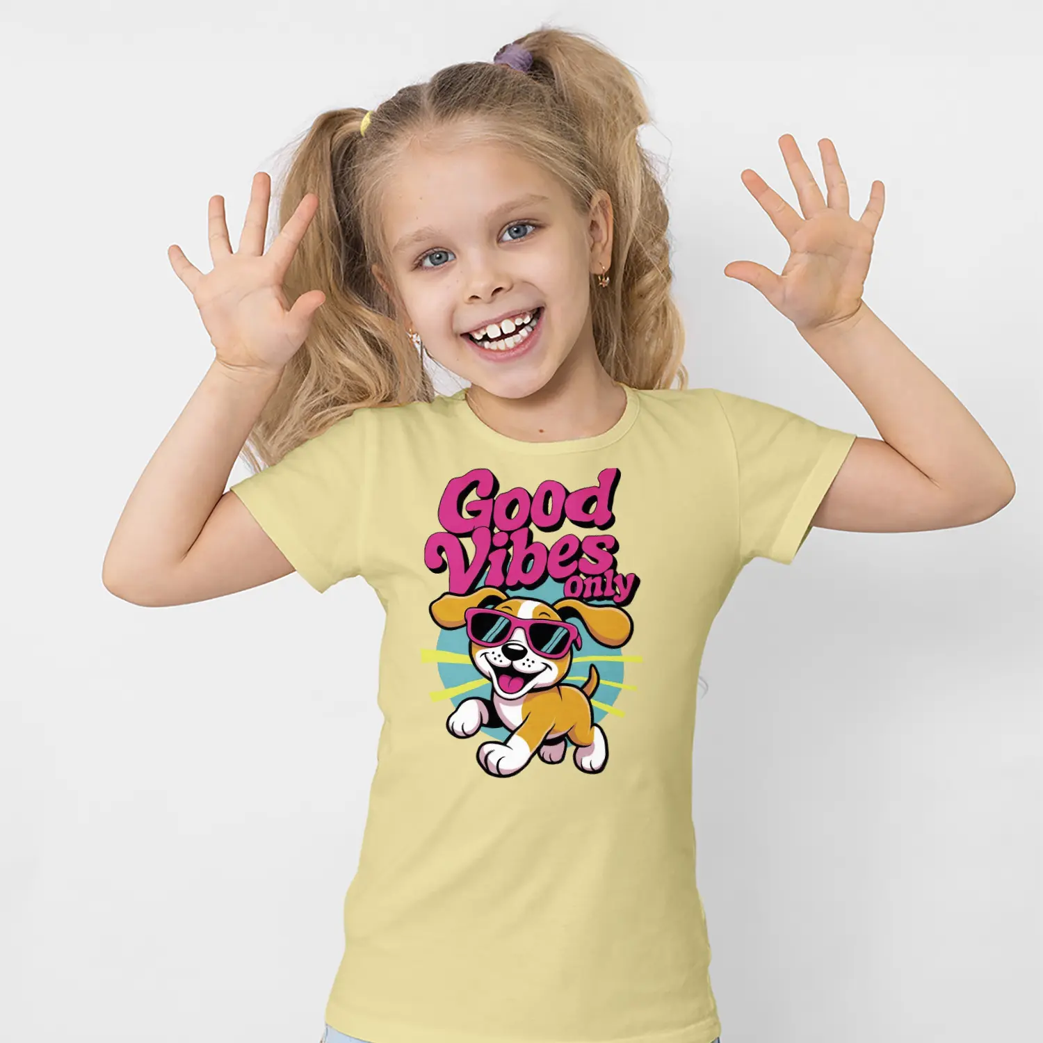Güneş Gözlüklü Yavru Köpek Good Vibes Only Yazılı Baskılı Kız Çocuk Tişörtü