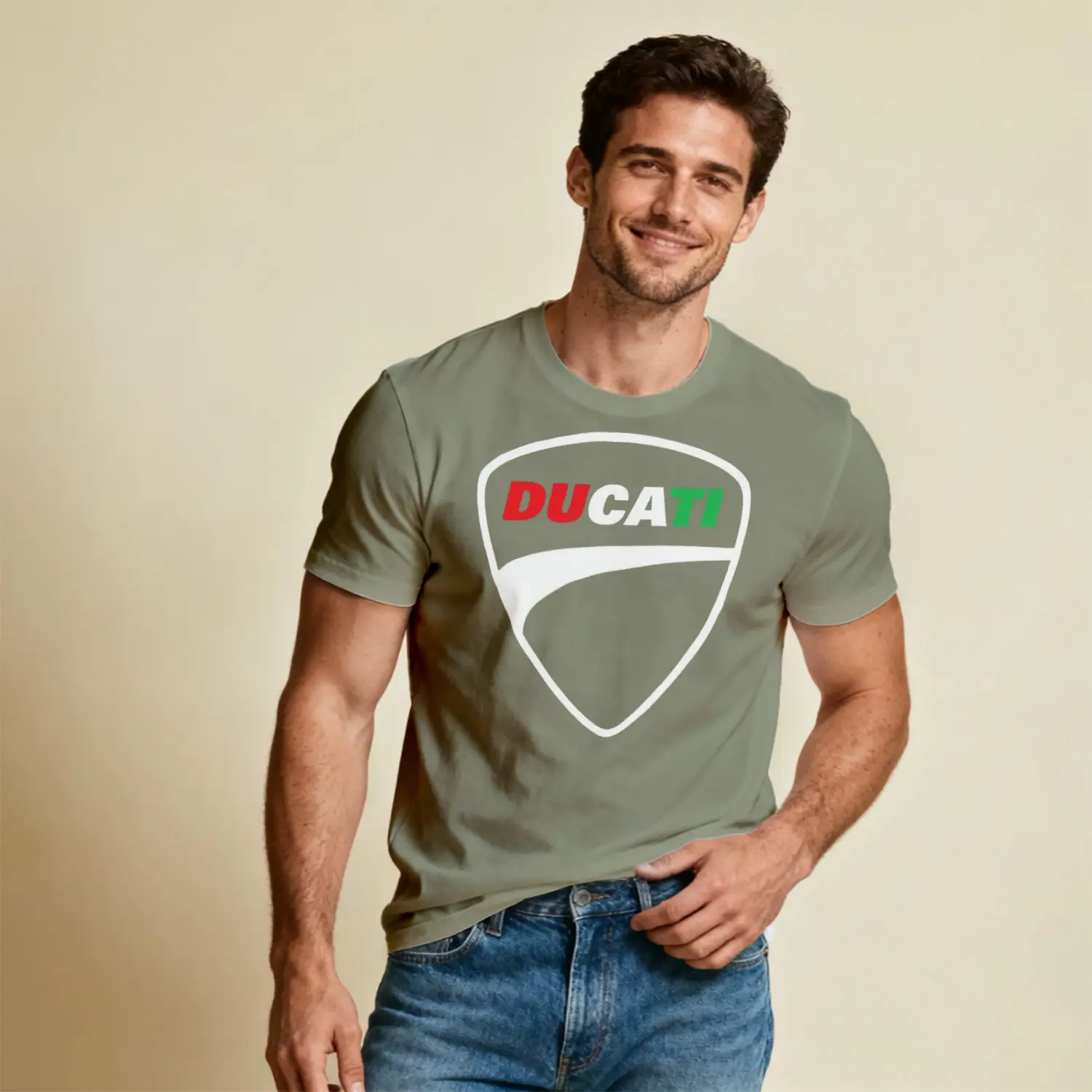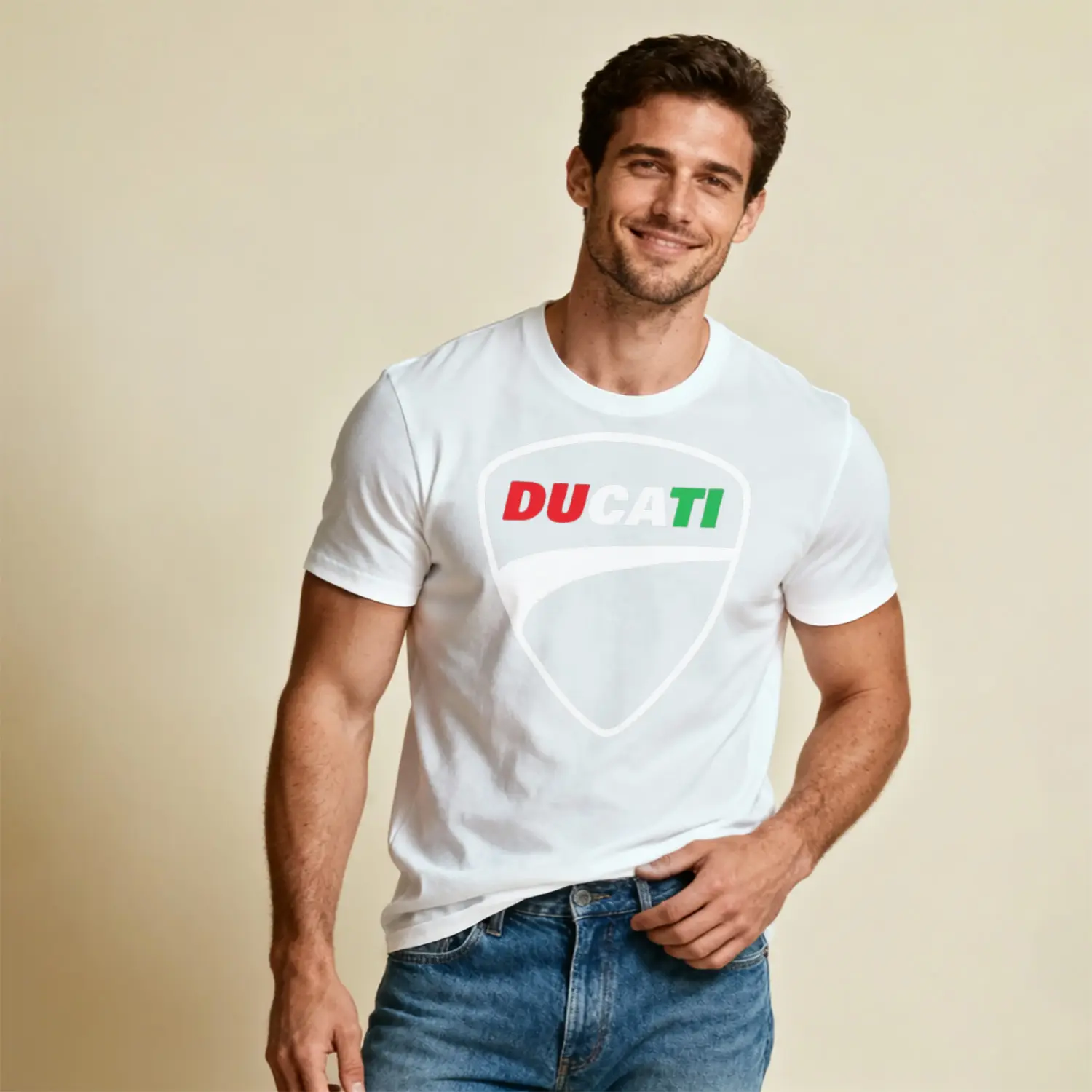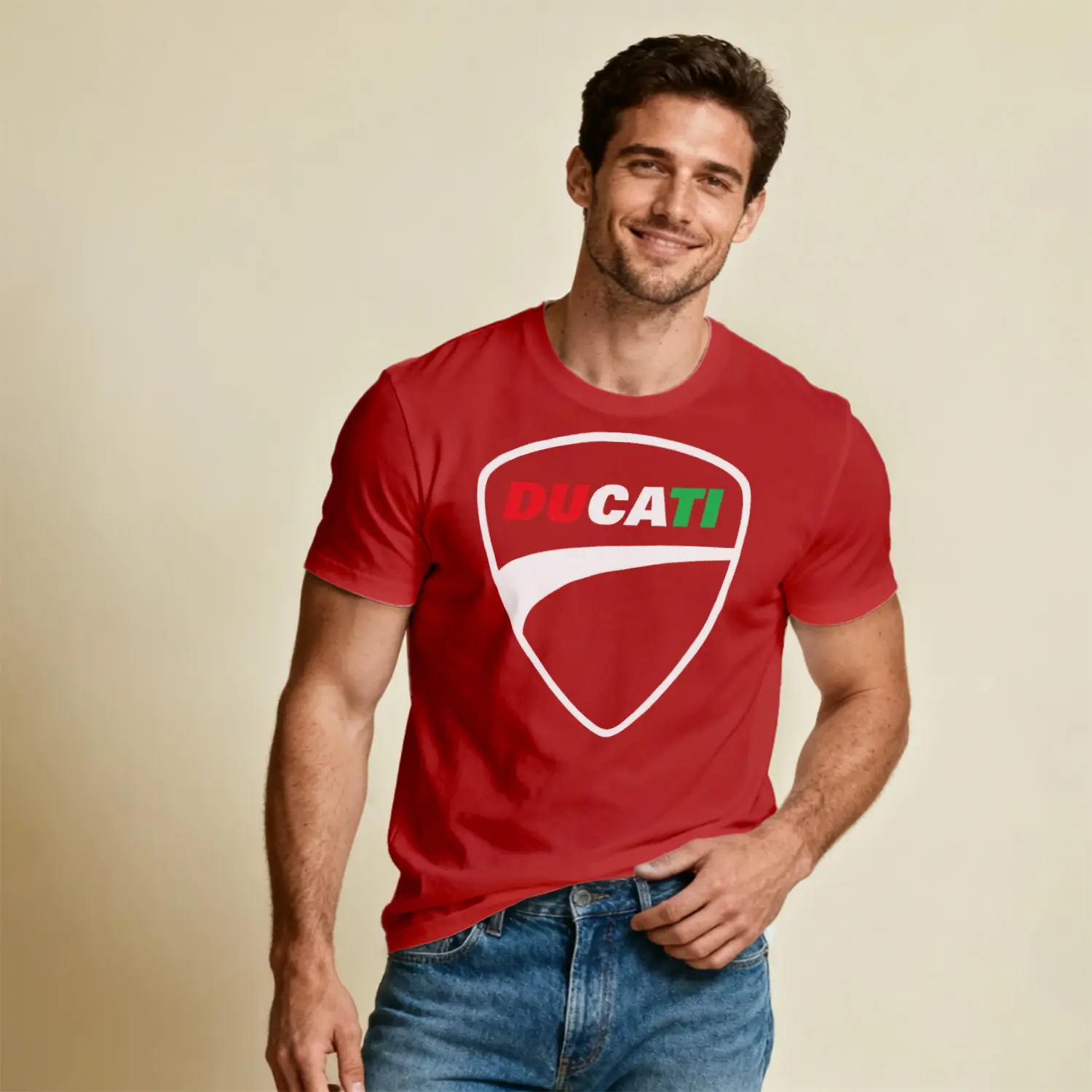 İtalyan Motosiklet Markası Kalkan Logo Renkli Baskılı Erkek Tişört için 10 değerlendirme