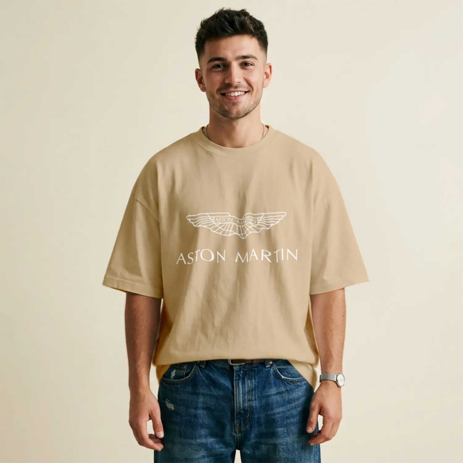 Kanat Figürlü Bej Rahat Kesim Baskılı Erkek Tişört