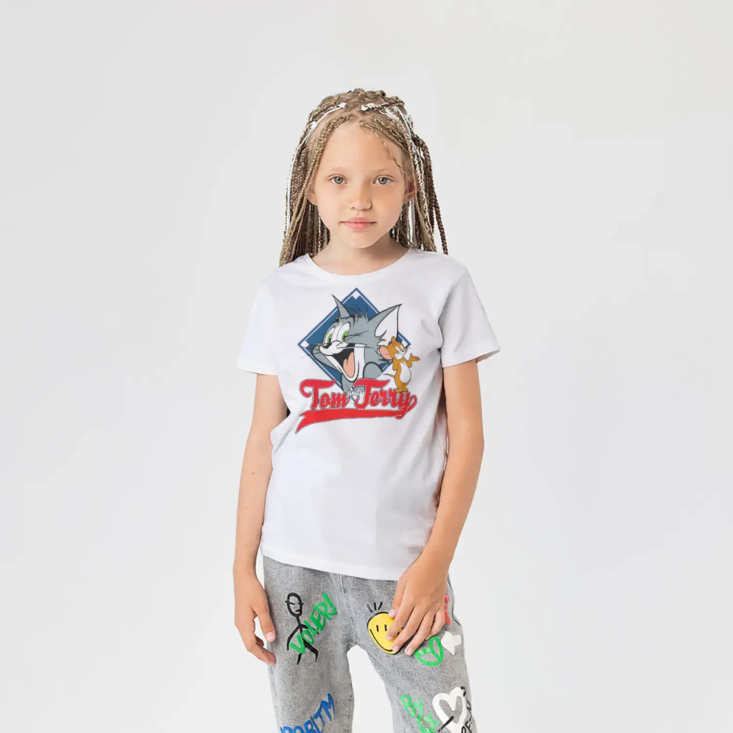 Komik Kedi ve Fare İkili Karikatür Baskılı Kız Çocuk Tişörtü