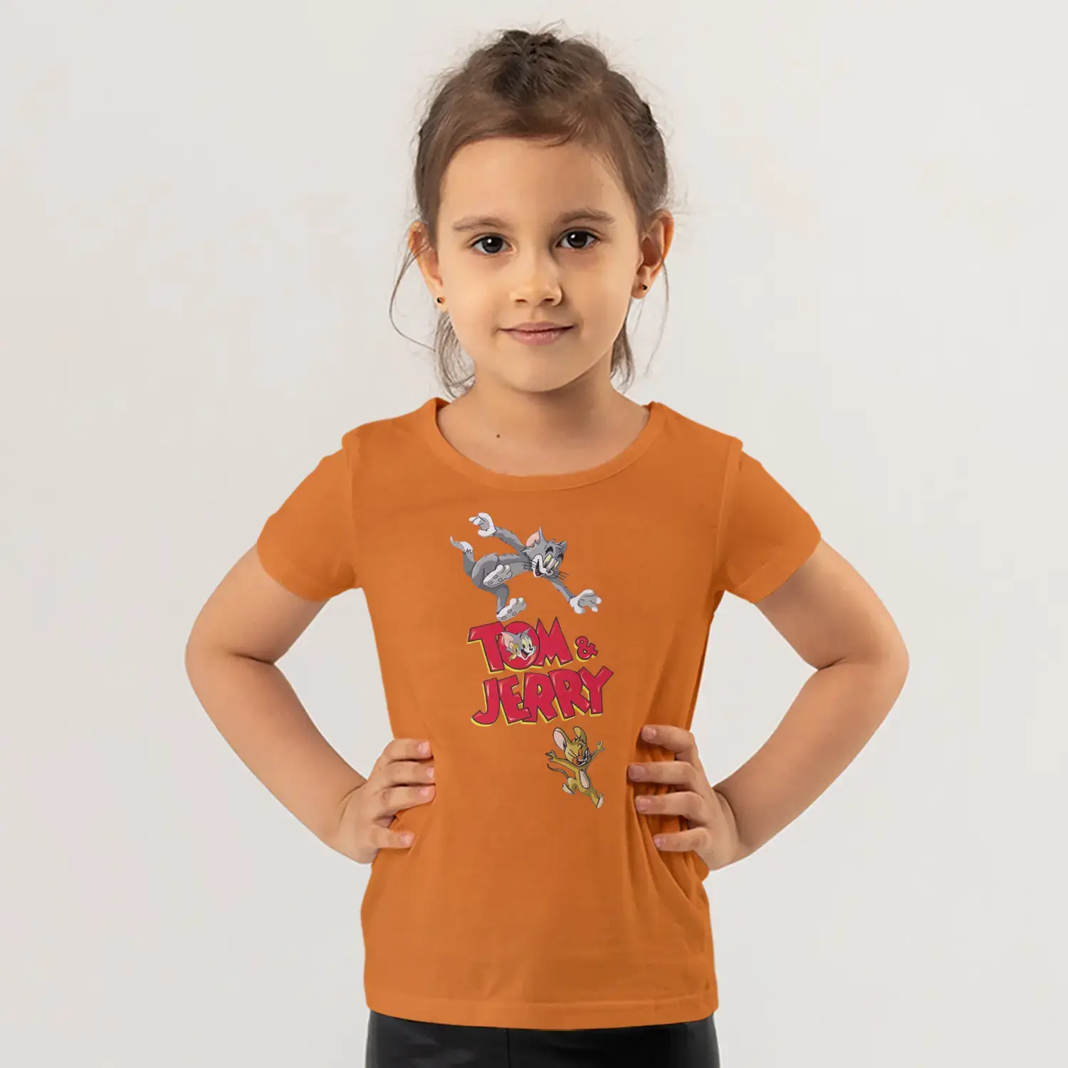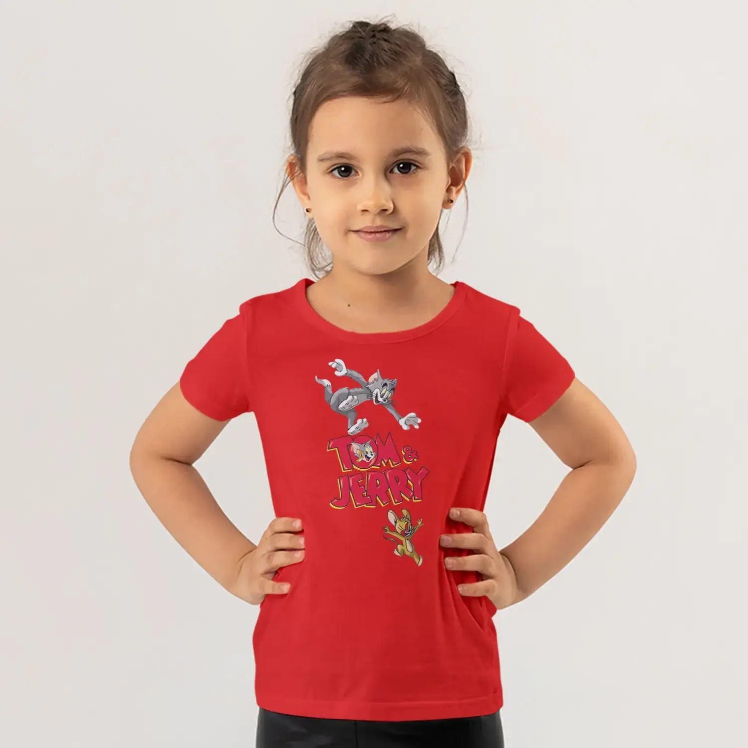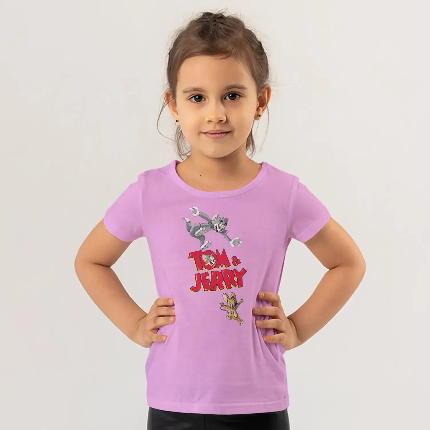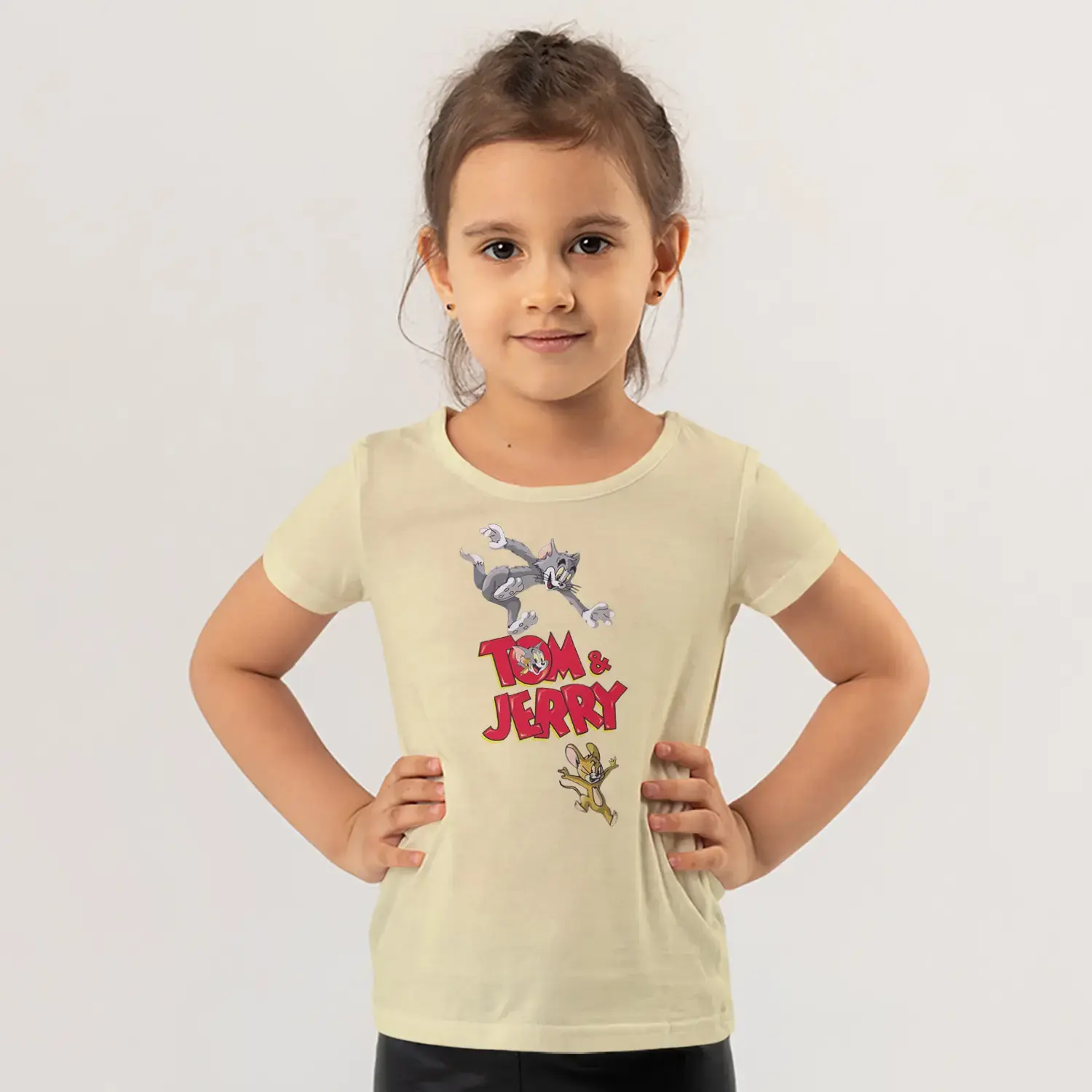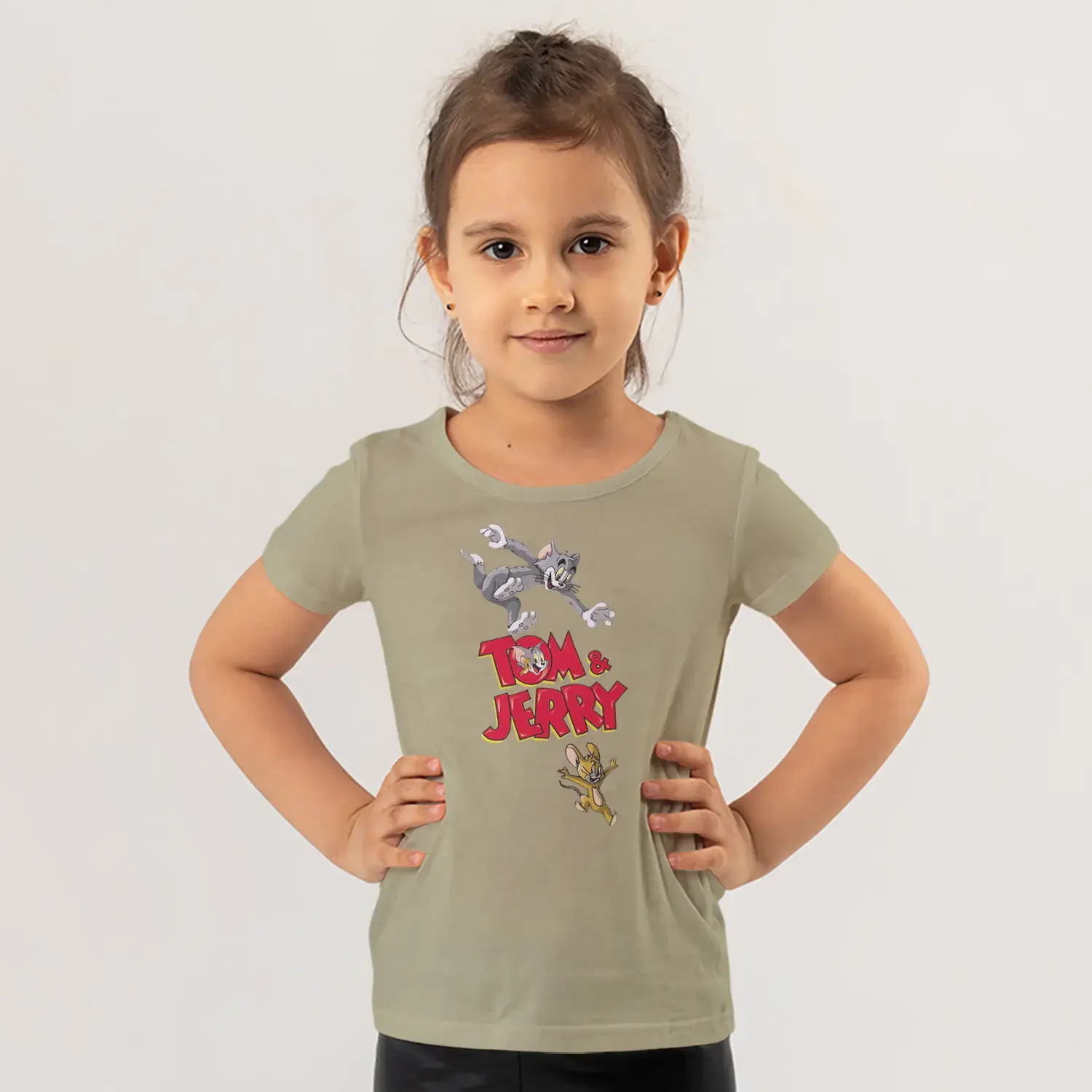 Kovalayan Gri Kedi ve Kaçan Küçük Fare İkili Karikatür Baskılı Kız Çocuk Tişörtü