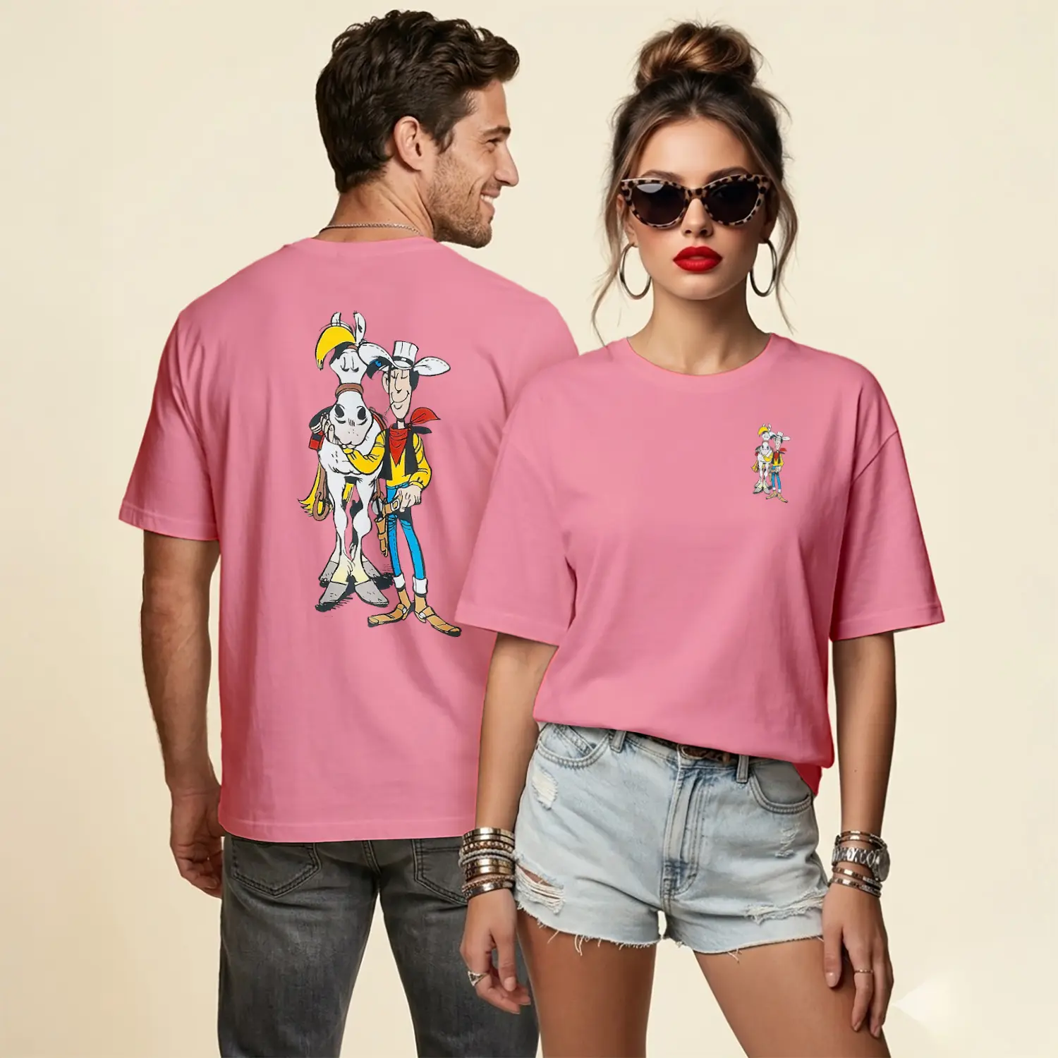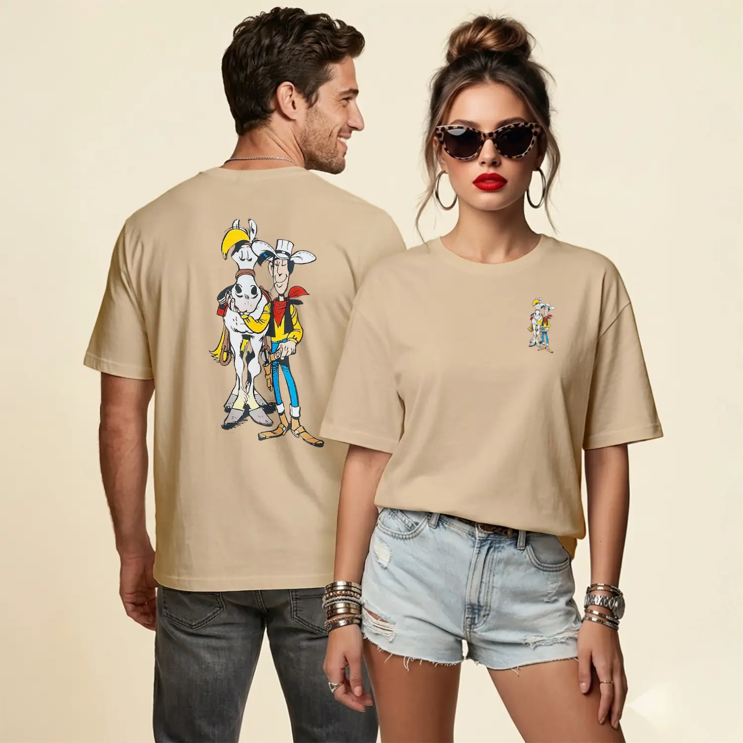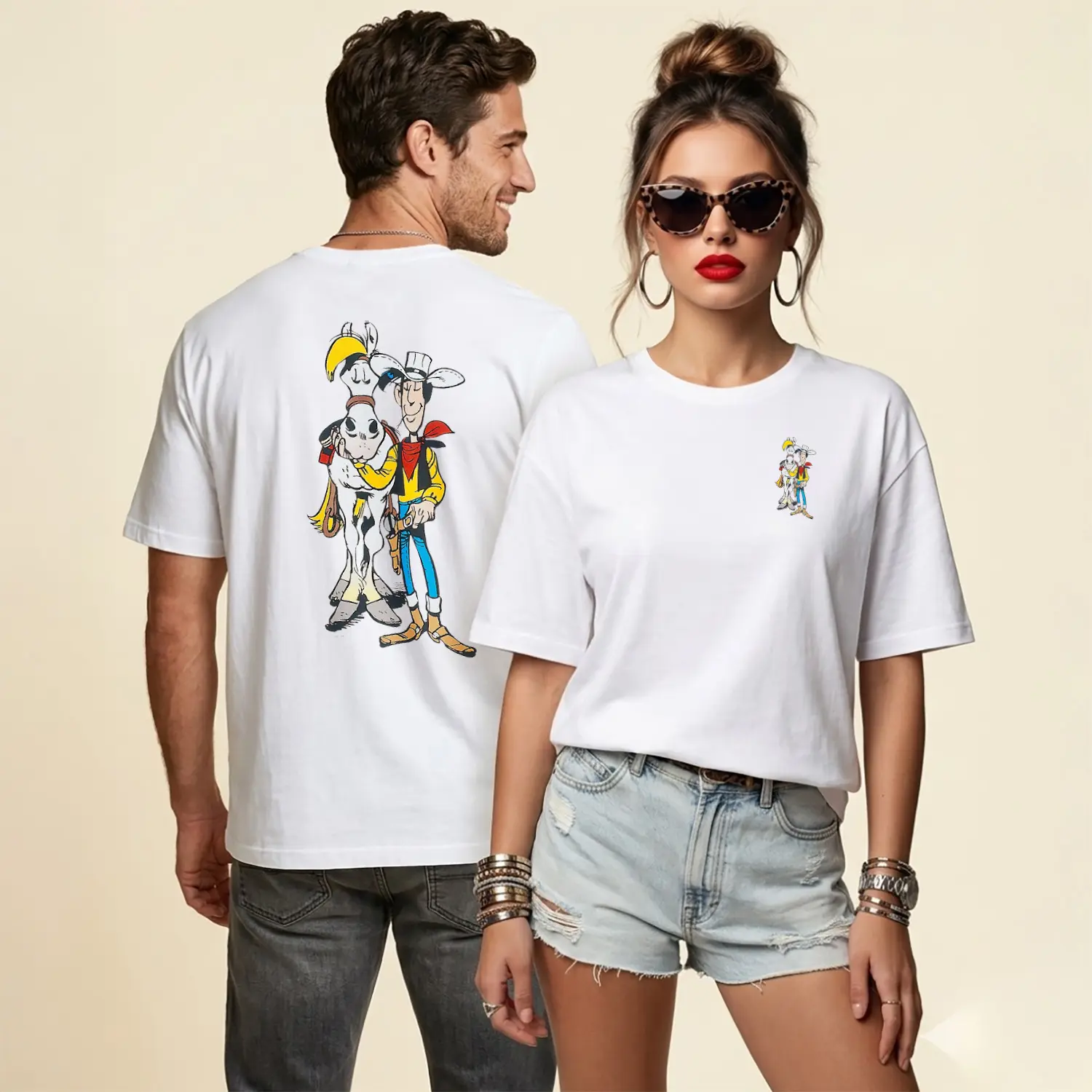 Kovboy Çizgi Film Karakteri ve Atı Figürü Baskılı Unisex Tişört