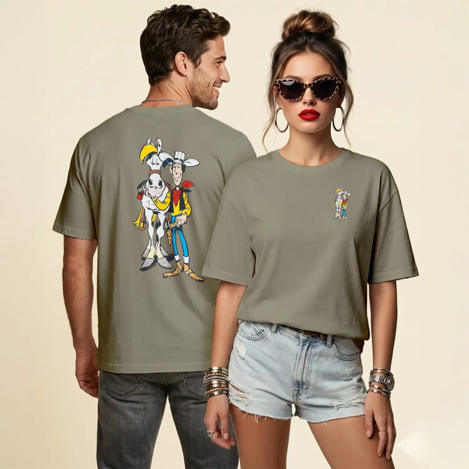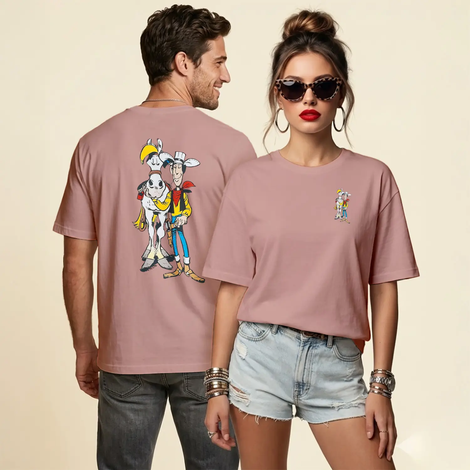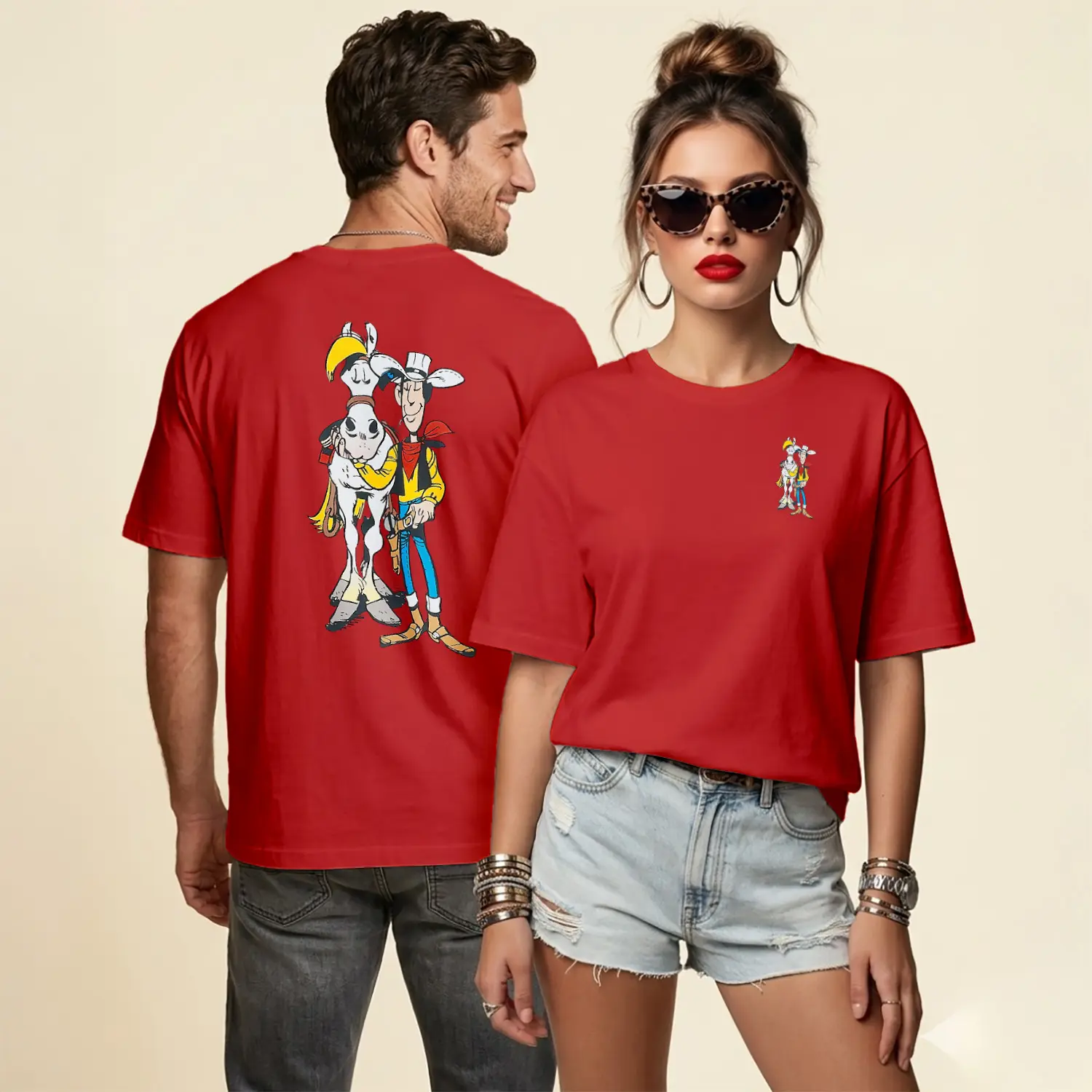 Kovboy Çizgi Film Karakteri ve Atı Figürü Baskılı Unisex Tişört